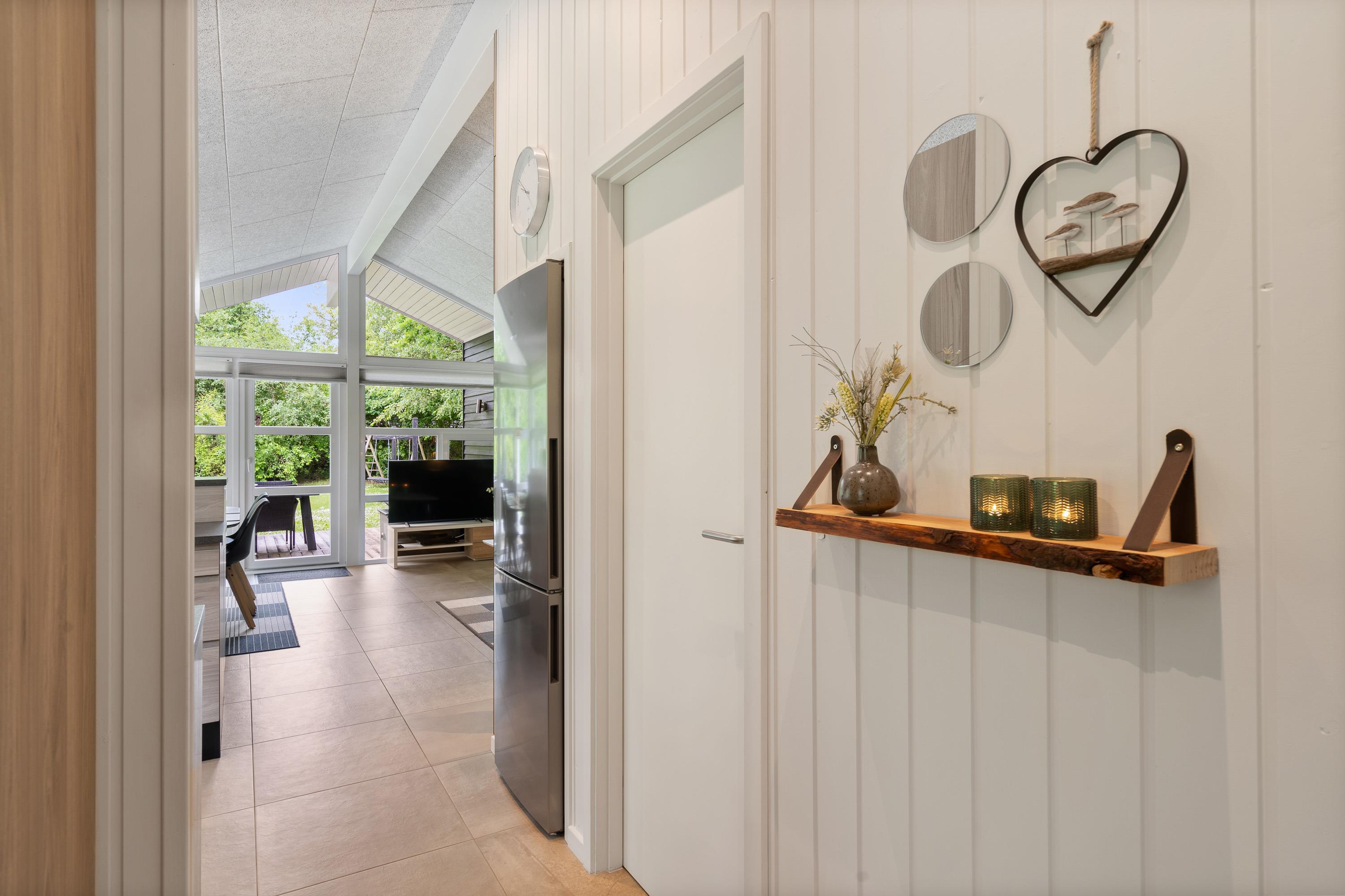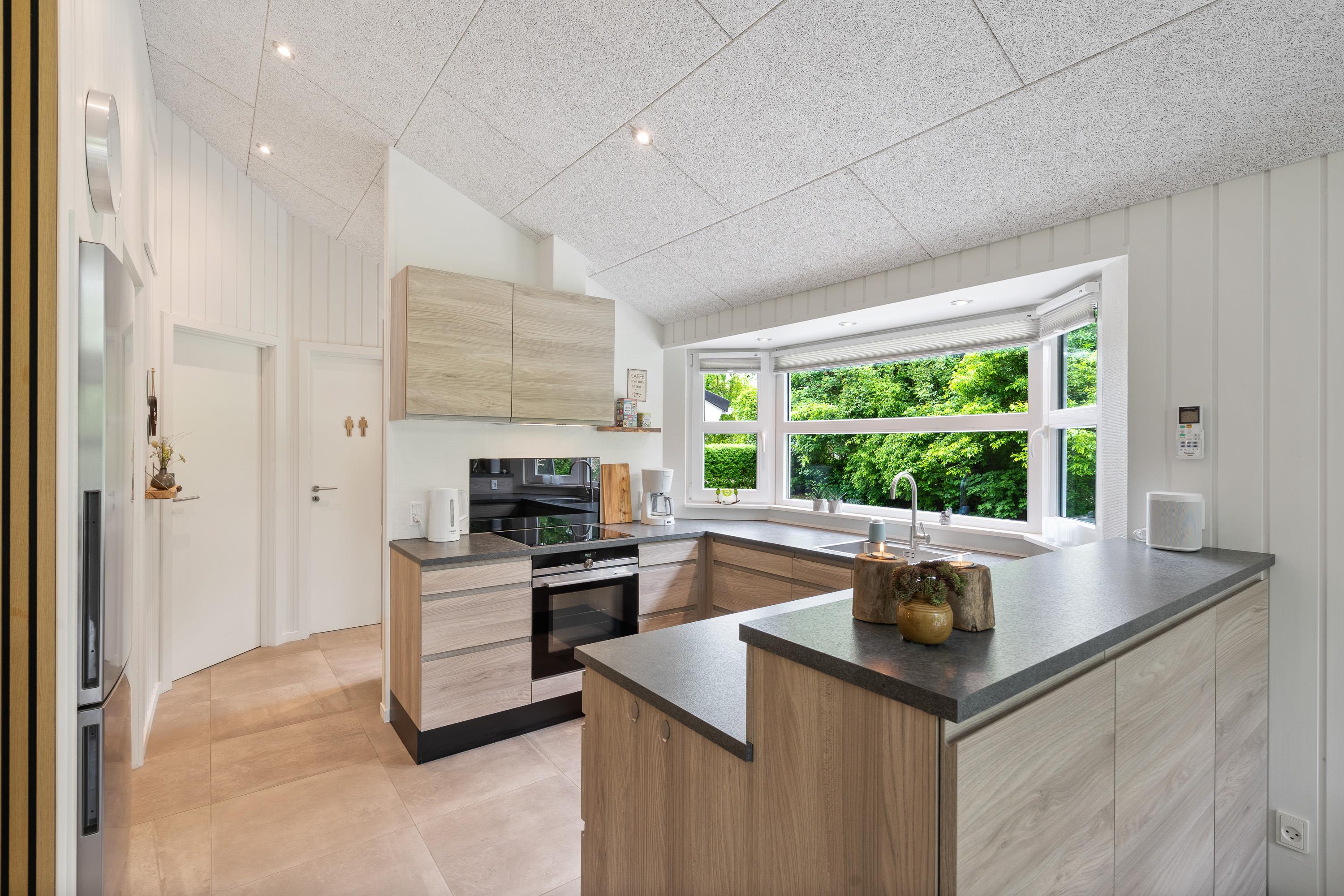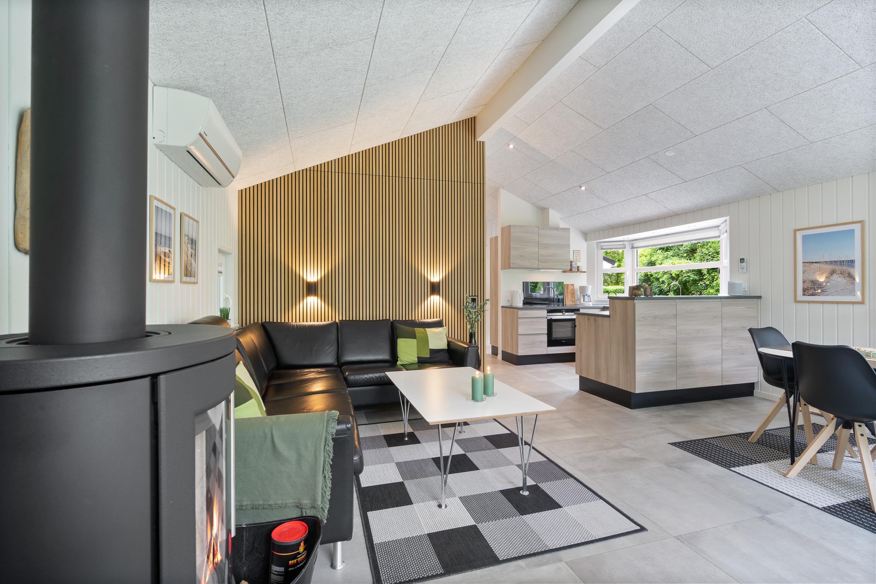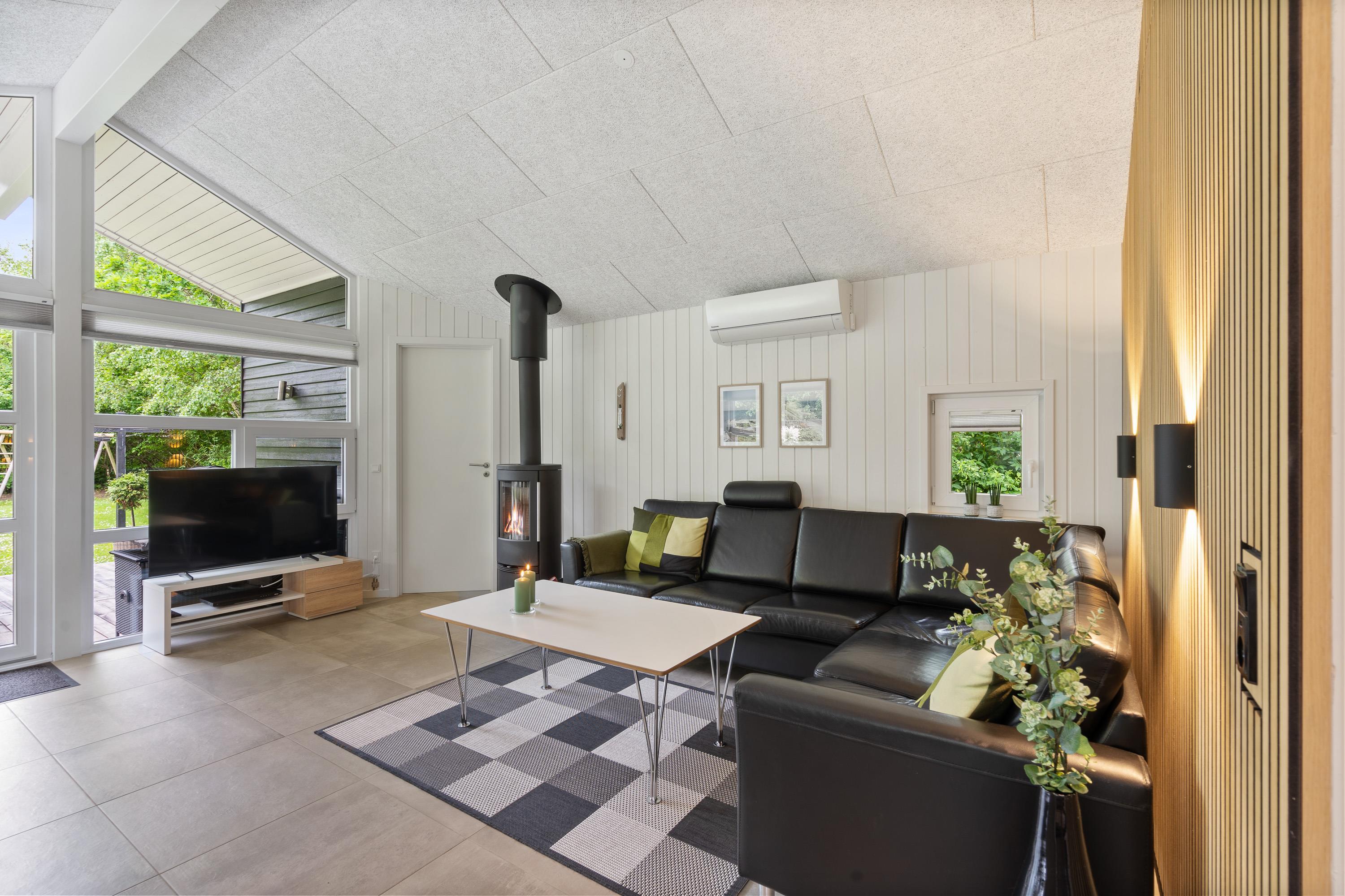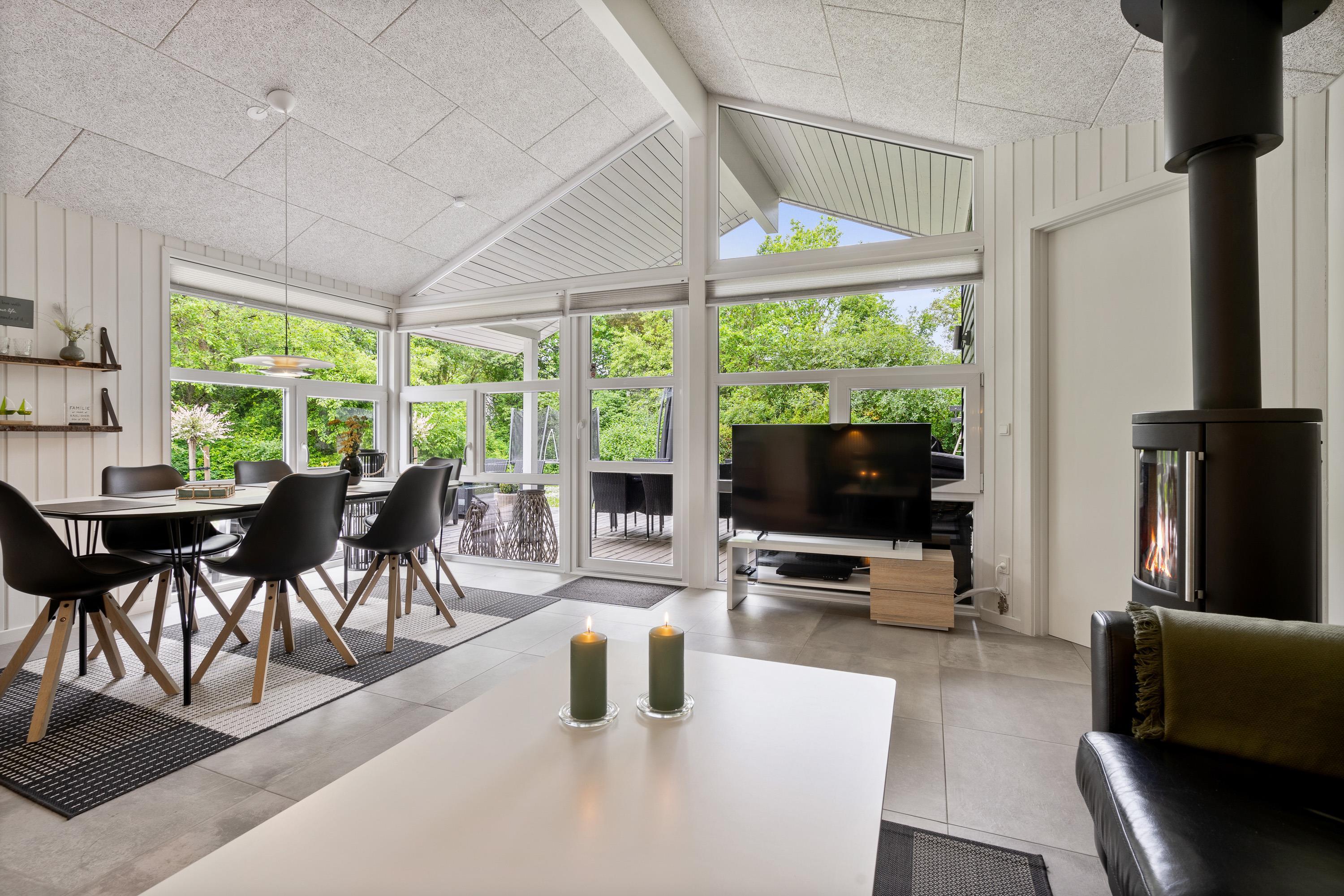 Kernen i sommerhuset er det store, lækre køkkenalrum kombineret med stuen. Hele rummet er flisebelagt og har gulvvarme, så I kommer ikke til at fryse om fødderne. Det åbne køkken gør, at I kan holde et øje med børnene, mens I tilbereder noget lækkert mad. Opvaskemaskinen sørger for, at der hurtigt kan ryddes op og frigiver mere tid til afslapning og hygge med børnene.
