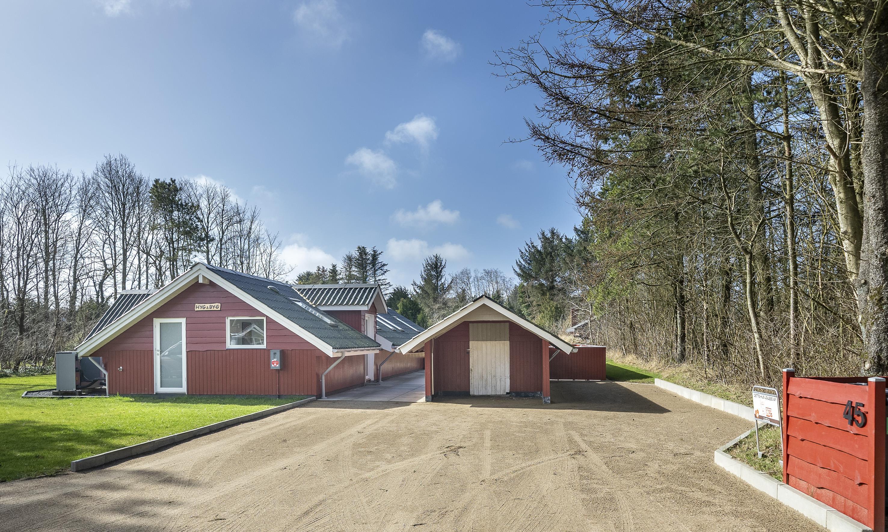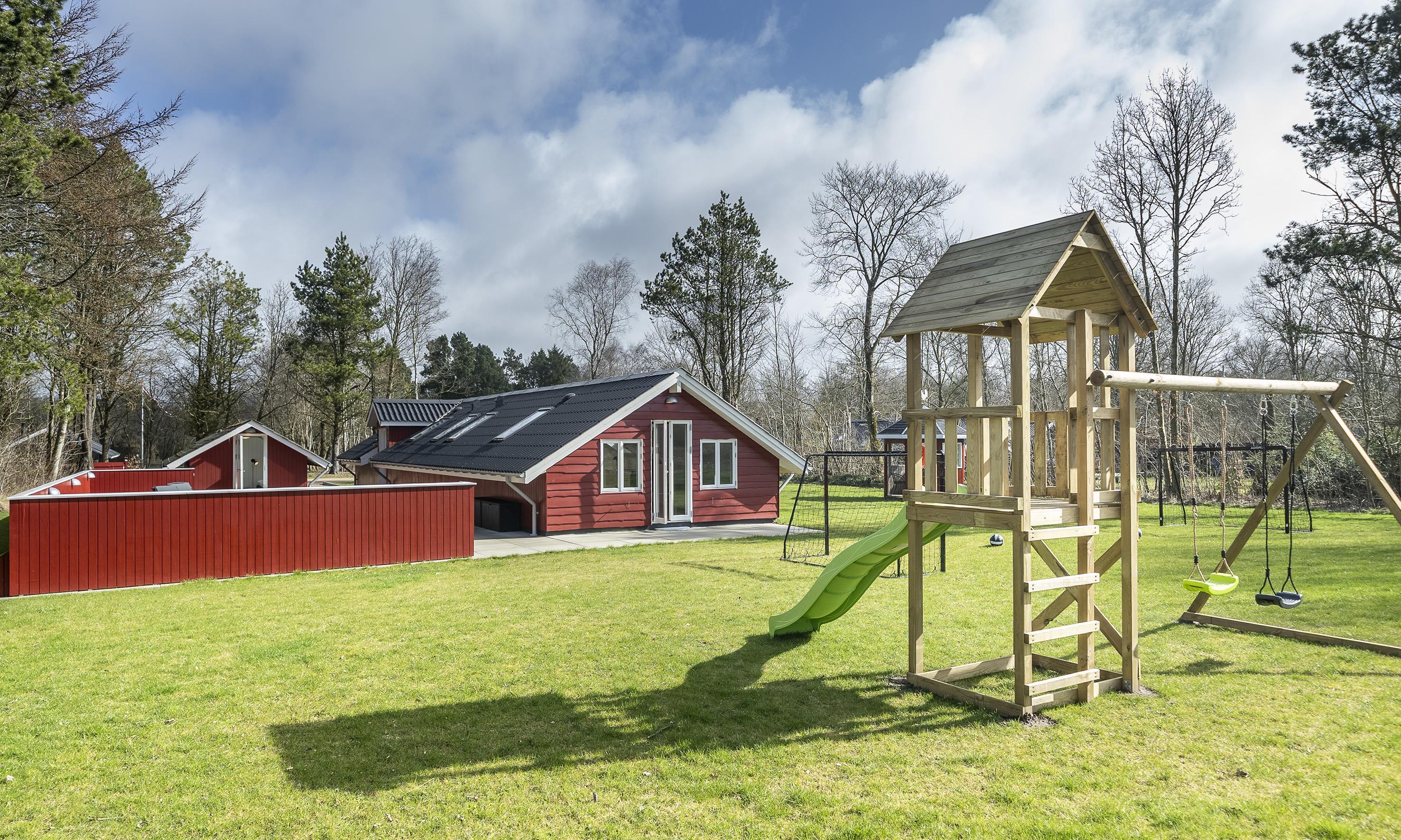 Ved huset er der græsplane med fodboldmål, legetårn, rutsjebane og gynge samt en stor og læfuld flisebelagt terrasse.