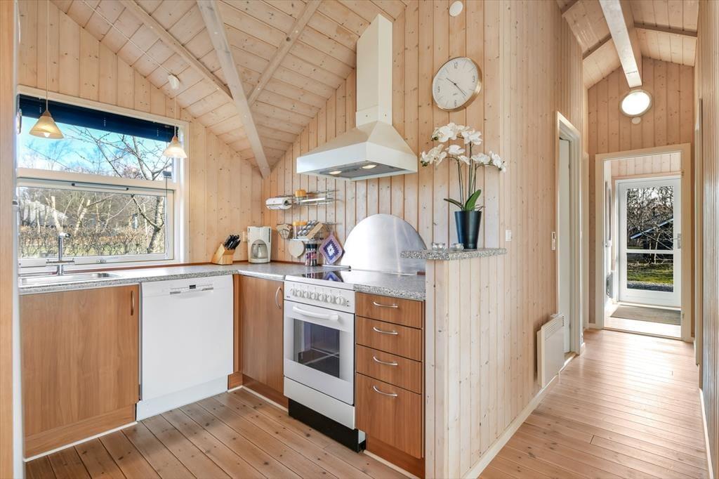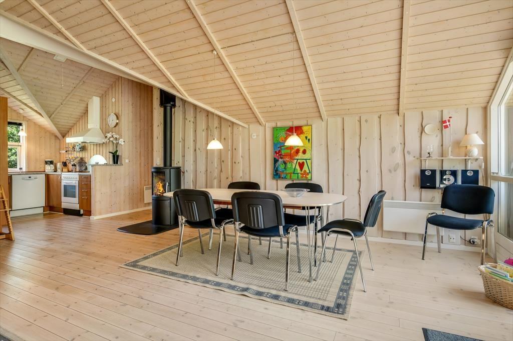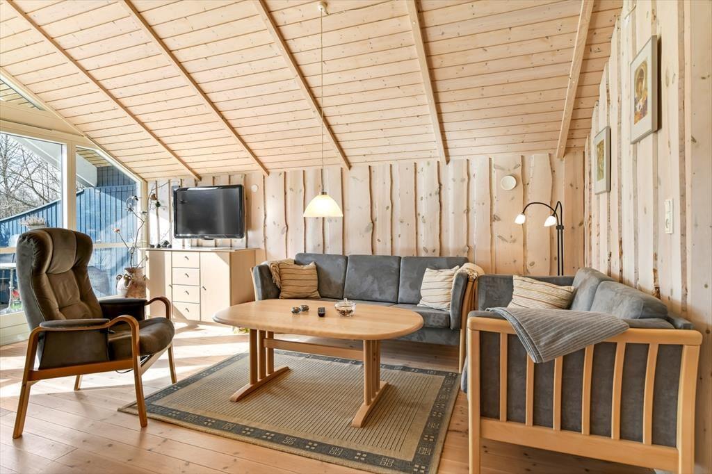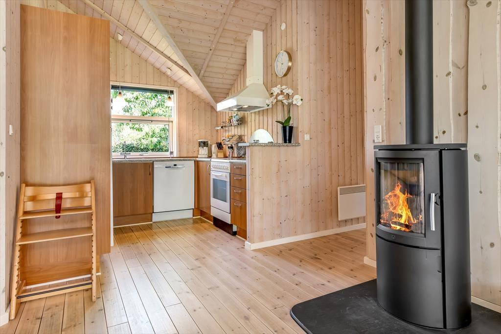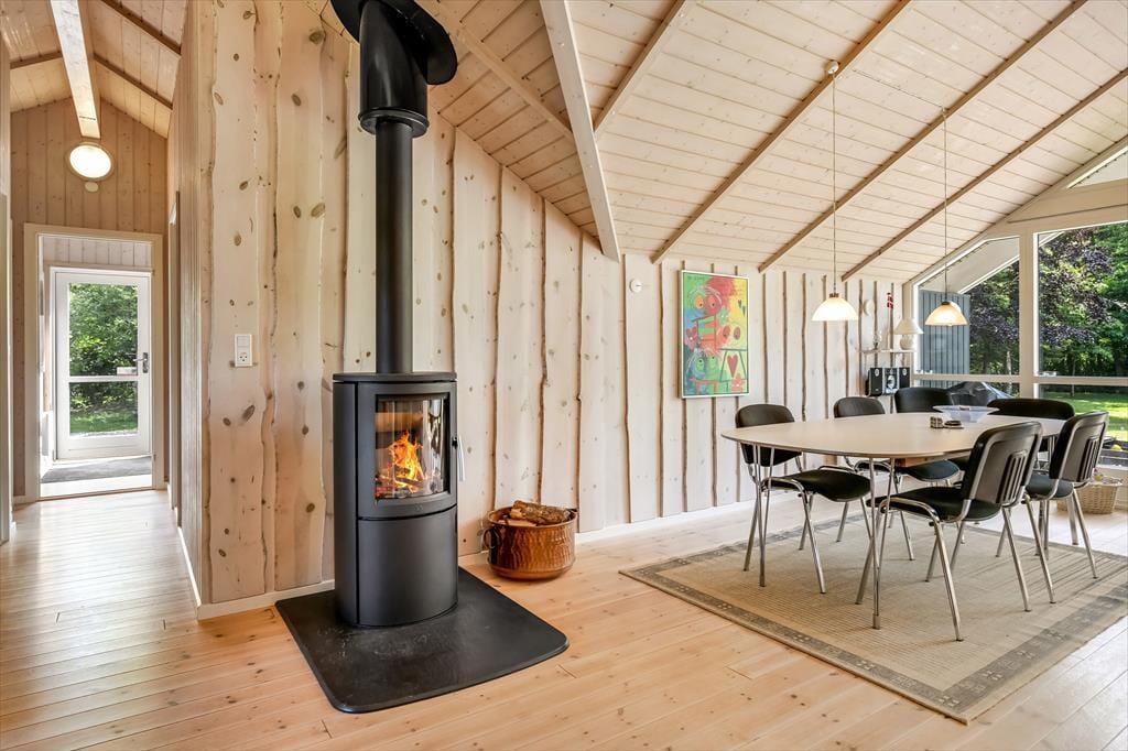 Træd ind i et lyst og venligt sommerhus, hvor indretningen indbyder til afslapning og kvalitetstid. De store vinduespartier lukker dagslyset ind og giver et dejligt kig ud til haven og den omkringliggende natur. Køkken og stue ligger i åben forbindelse, så hele familien kan være sammen – uanset om I laver mad, spiller spil eller slapper af med en god film. Indretningen er funktionel og hyggelig, og der er tænkt på, at I skal føle jer hjemme fra første ferieøjeblik. Varmen fra brændeovnen spreder sig hurtigt og gør det ekstra rart at nyde en stille stund, når aftenen falder på. Her er det let at koble af og lade ferieroen sænke sig.