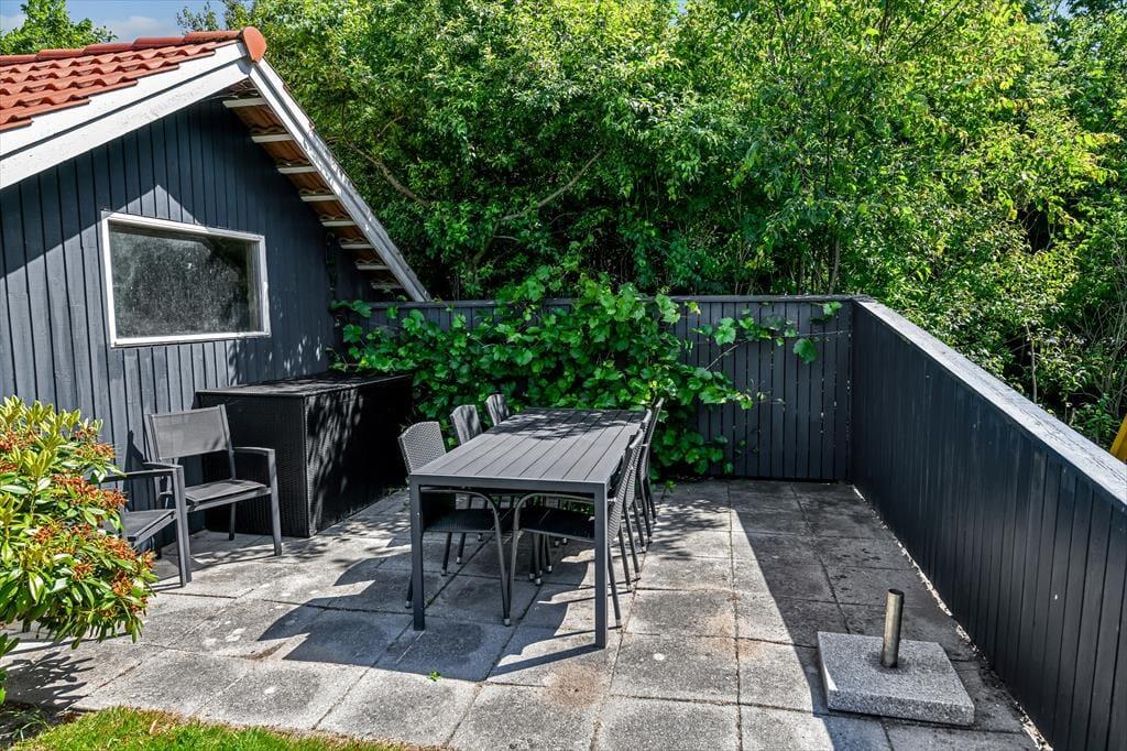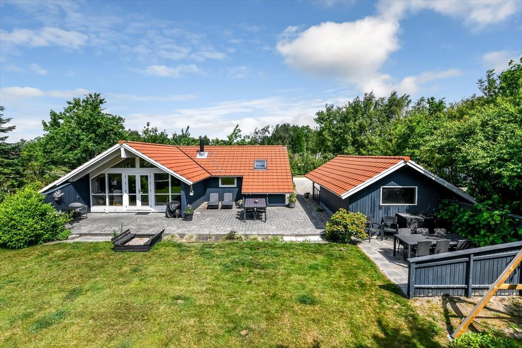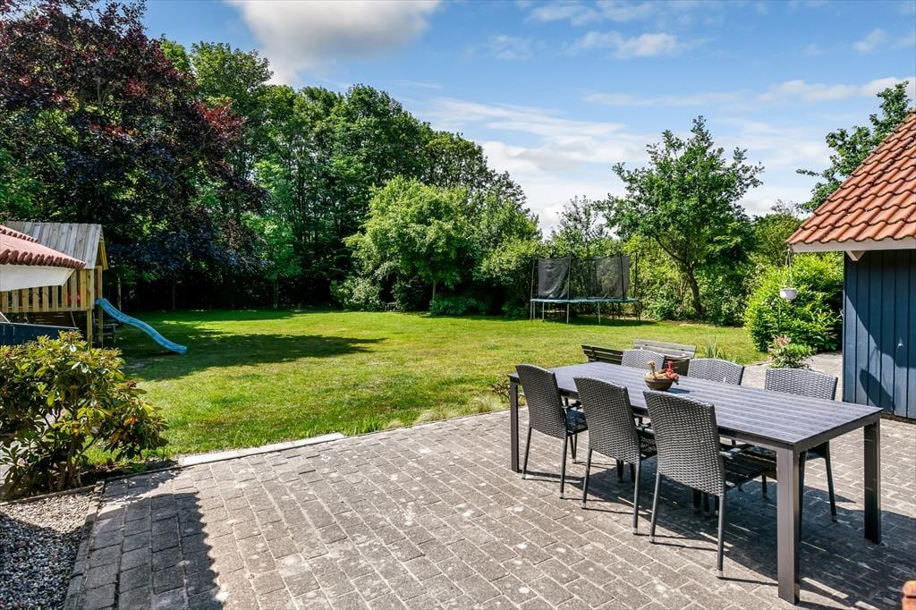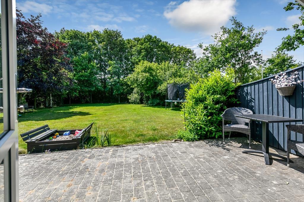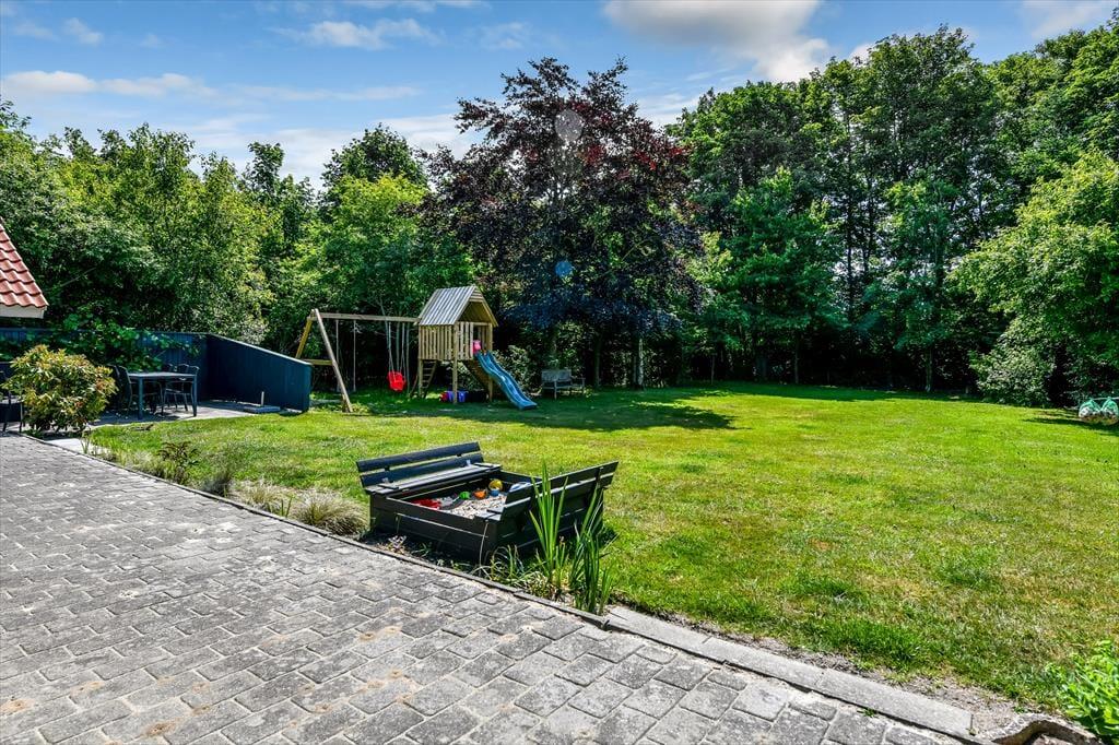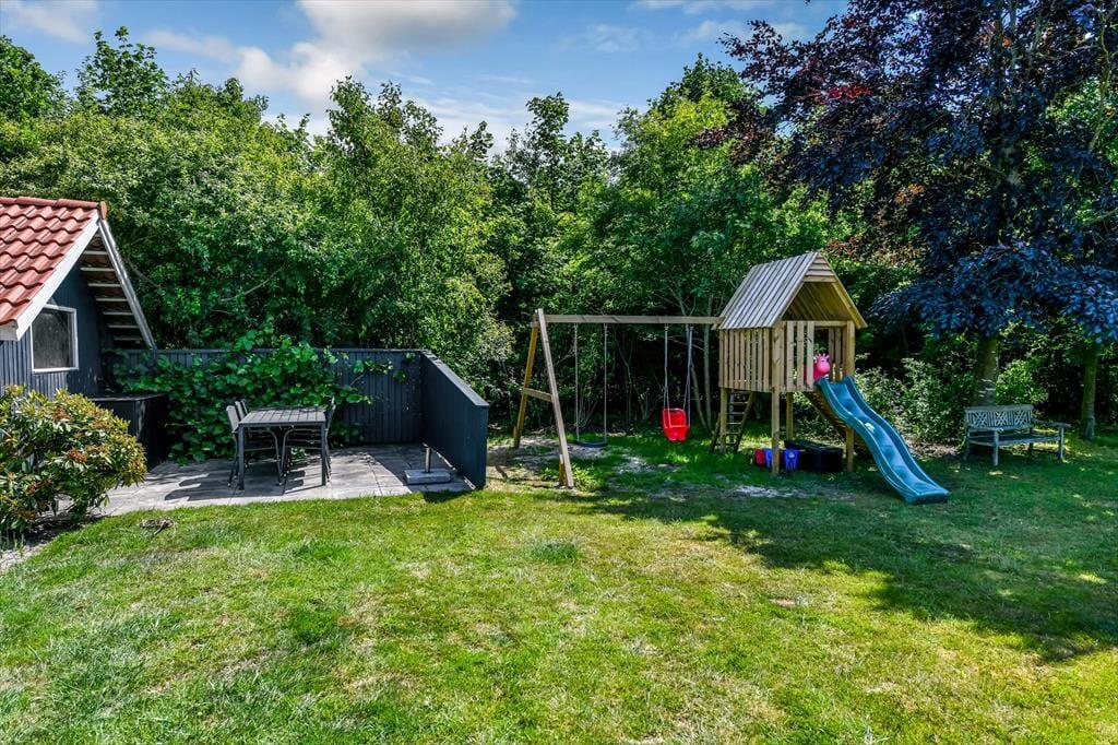 Udenfor åbner en fantastisk grund sig – omkranset af høje træer, som skaber en naturlig læ og en dejlig fornemmelse af fred og privatliv. Her er rigelig plads til boldspil, solbadning eller en stille stund med en god bog. Børnene vil elske det fine legetårn med gynger og rutsjebane, hvor feriens bedste lege hurtigt tager form. Terrassen snor sig omkring huset og har både åbne og overdækkede zoner, så du kan finde sol, skygge eller læ – alt efter vejr og humør. Start dagen med morgenkaffe i det fri, slap af i liggestolene midt på dagen, og saml hele familien til grillhygge, når mørket falder på. Uanset vejr og vind er der altid et godt spot på terrassen.