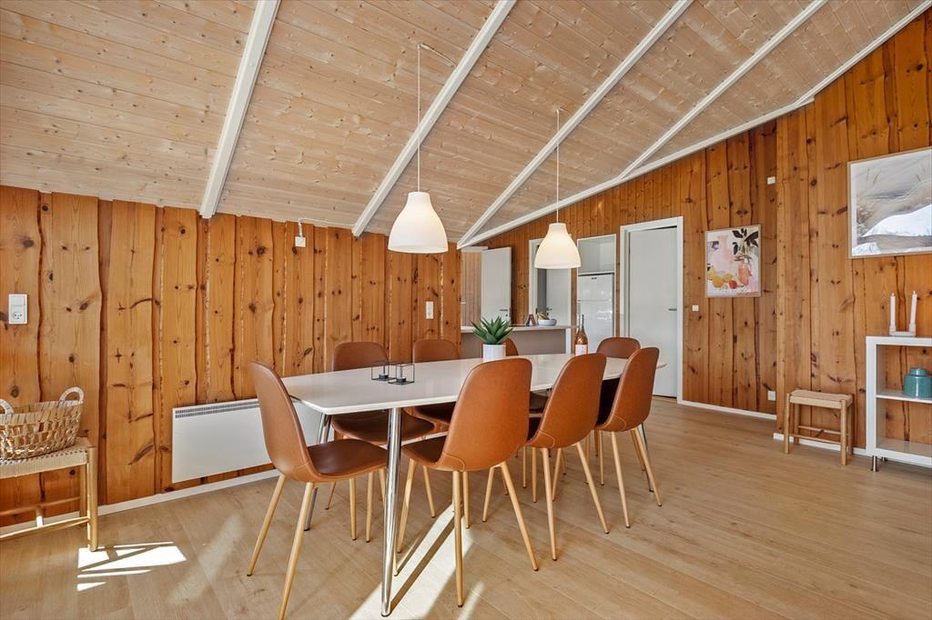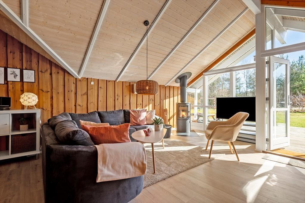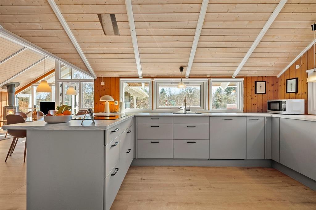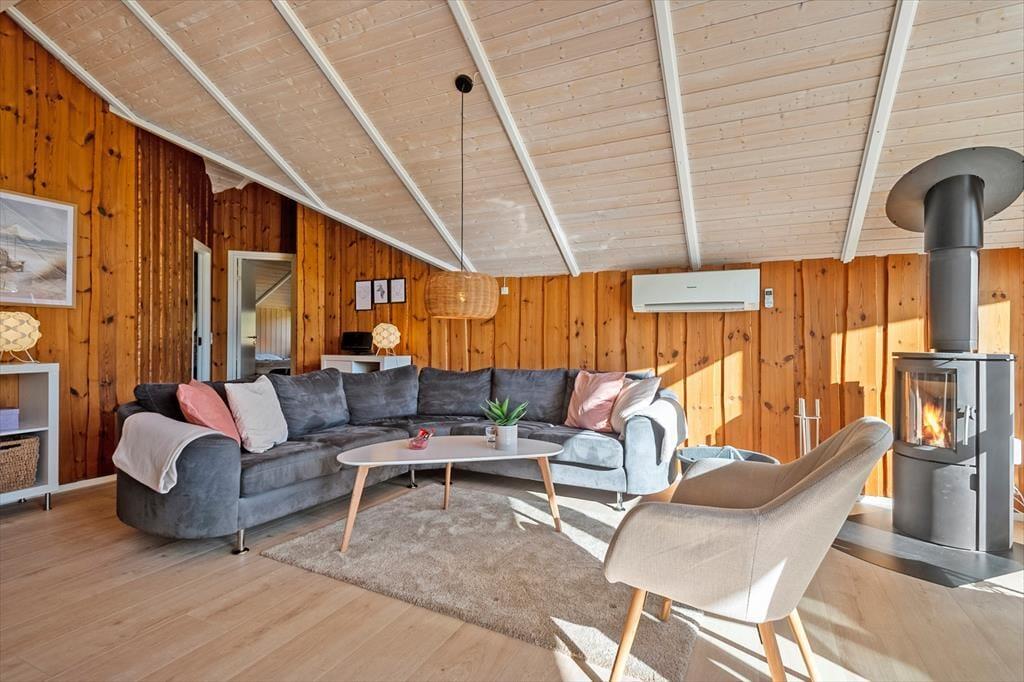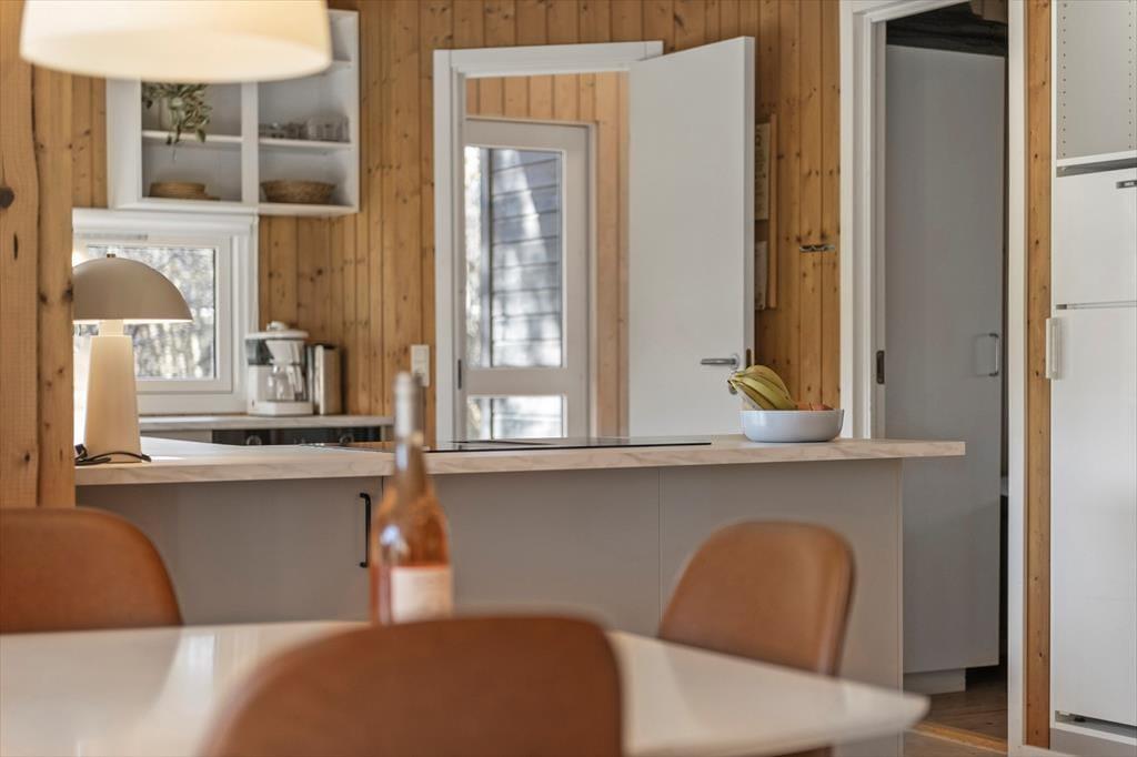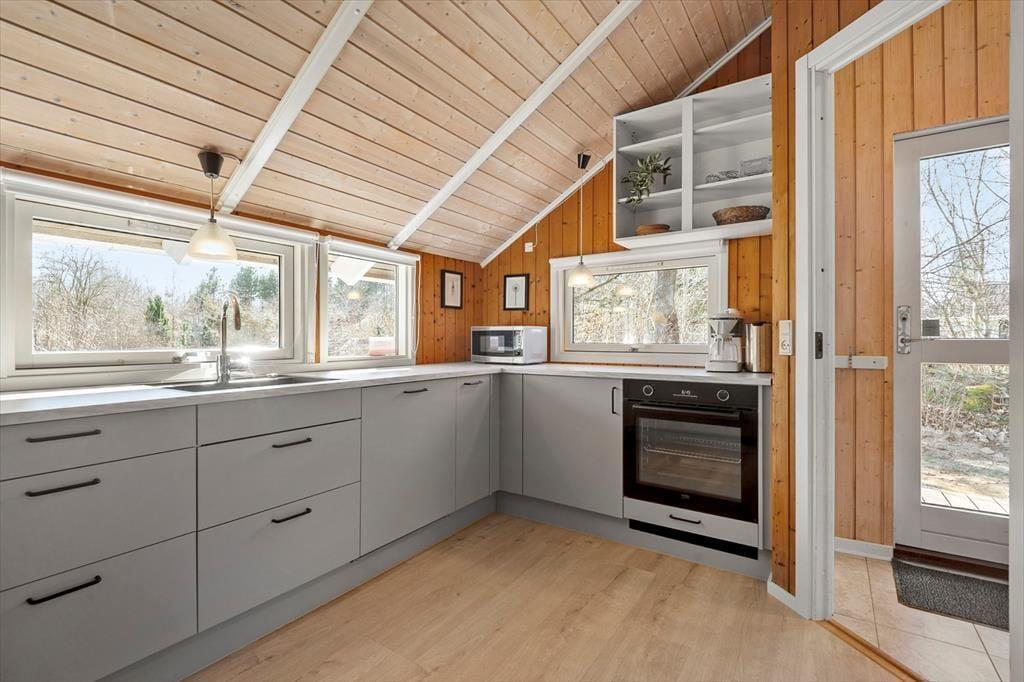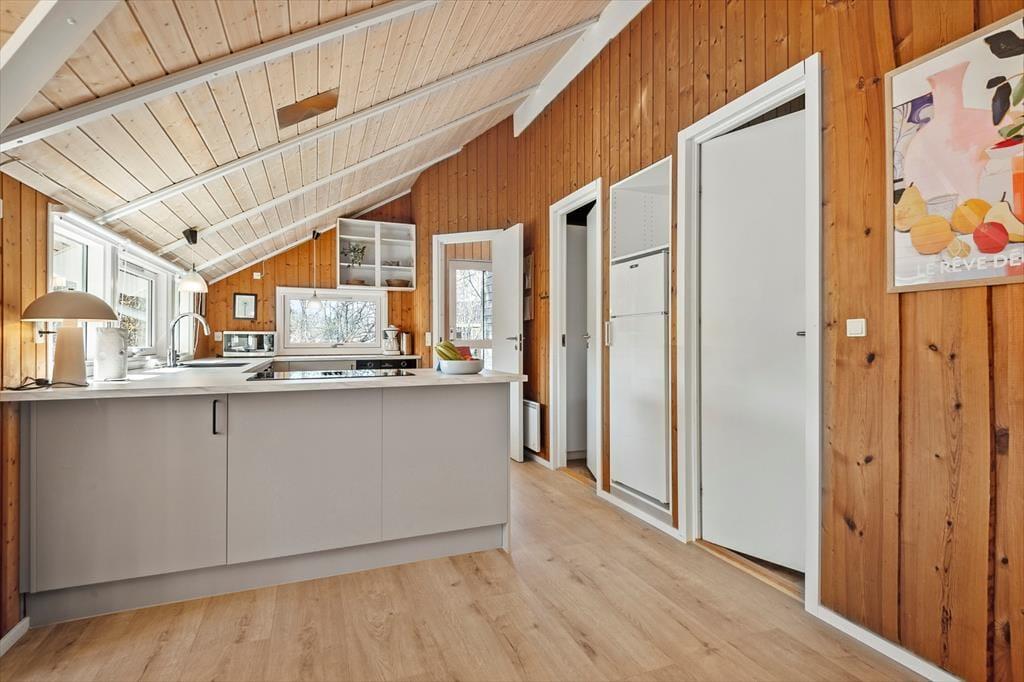 Når du træder indenfor i sommerhuset, mærker du straks den afslappede feriestemning. Indretningen er lys og indbydende, og her er god plads til at samles og være sammen. Det nyere køkken ligger som en naturlig del af opholdsområdet, så samtalerne kan flyde frit, mens dagens måltider tilberedes. Her kan du starte dagen med duften af friskbrygget kaffe og afslutte aftenen med et godt glas vin efter en lang dag i det fri.