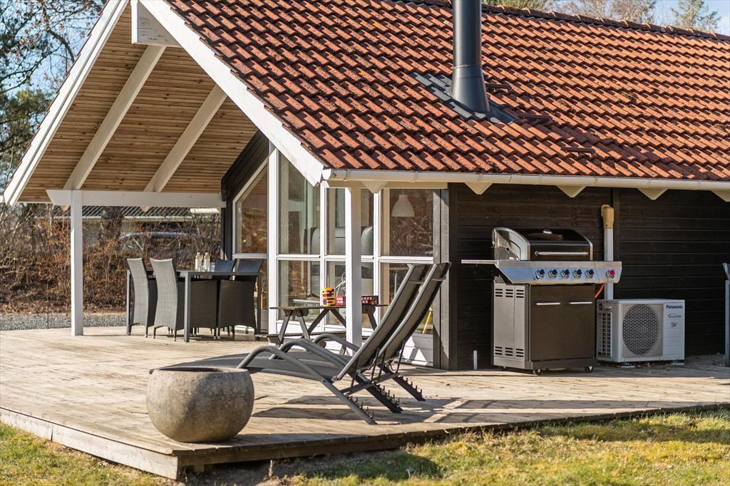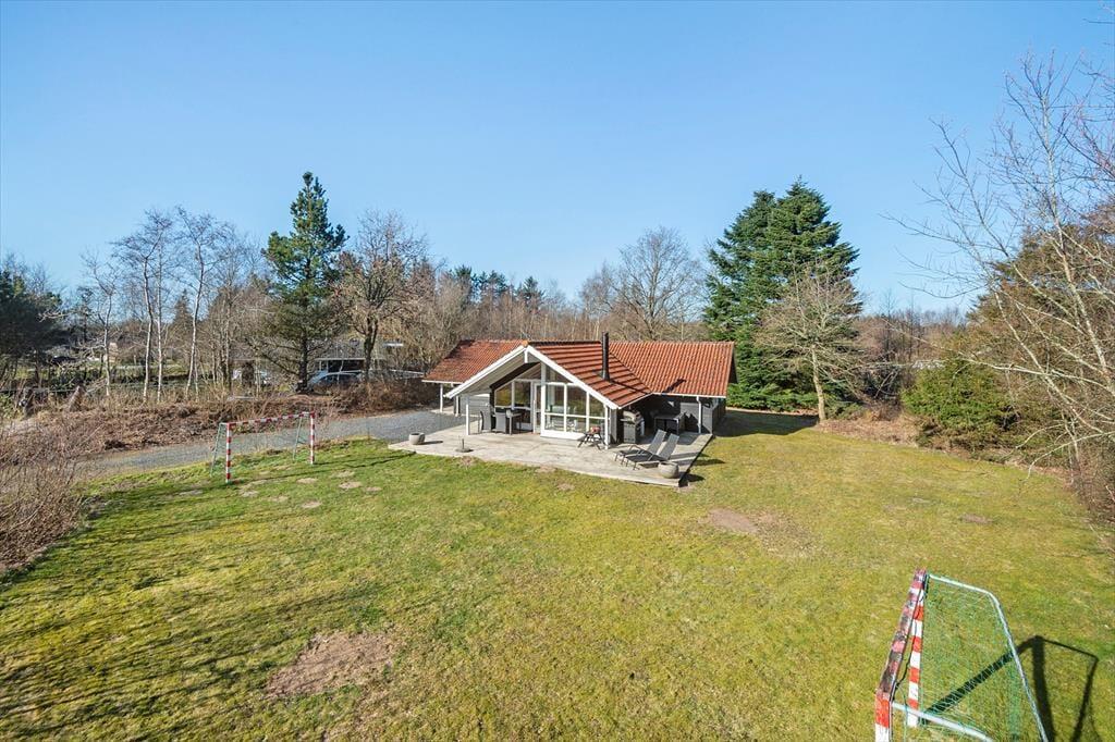 Udenfor fortsætter ferien på bedste vis. Sommerhuset ligger på en dejlig stor grund, hvor der er plads til leg, boldspil og afslapning. Fodboldmålet indbyder til små turneringer, mens de mindste kan lege frit og trygt i haven. Terrassen bliver hurtigt et naturligt samlingspunkt, uanset om solen skinner fra en skyfri himmel, eller du søger læ under den delvist overdækkede del.