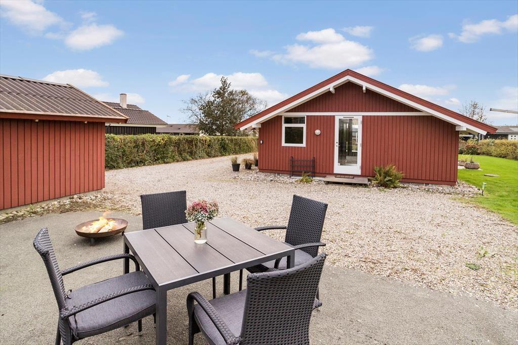 Haven, der omkranser sommerhuset, er stor og med sol hele dagen. Den åbne plæne er med plads til leg og boldspil, og samtidig er grunden omkranset af buske og hæk. På grunden er der en god indkørsel og plads til at parkere. Vendt væk fra vejen, ved entredøren er en lille terrasse med et bålfad, der med fordel kan tændes op i, når mørket sænker sig, og hyggen skal i top.