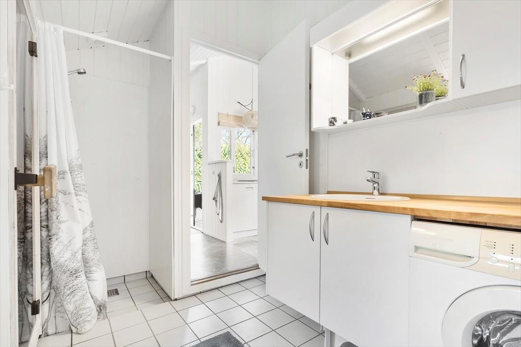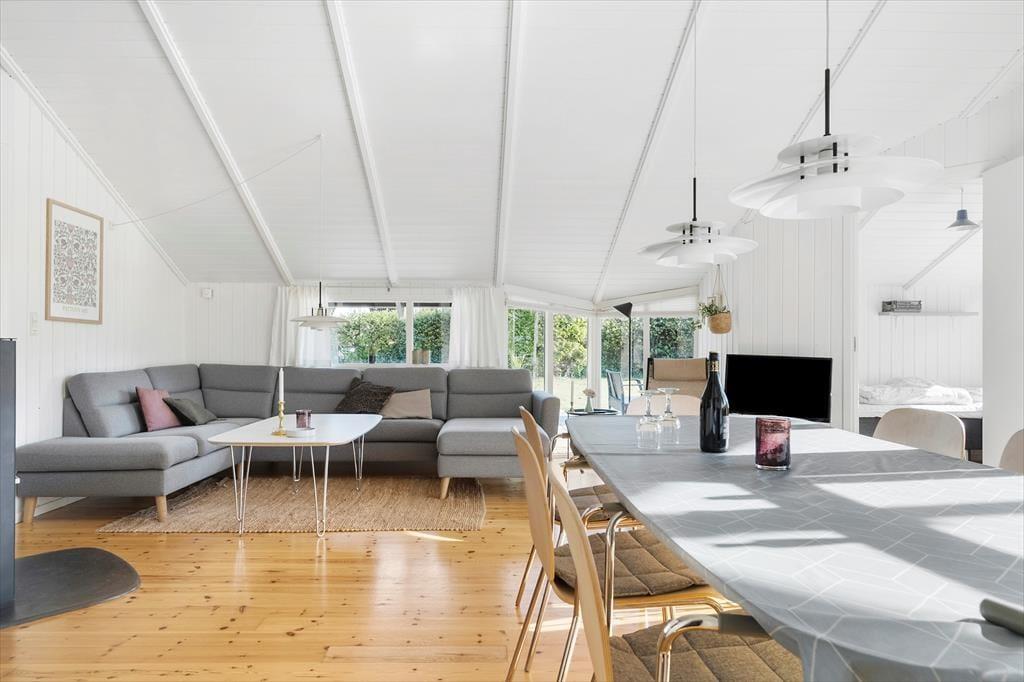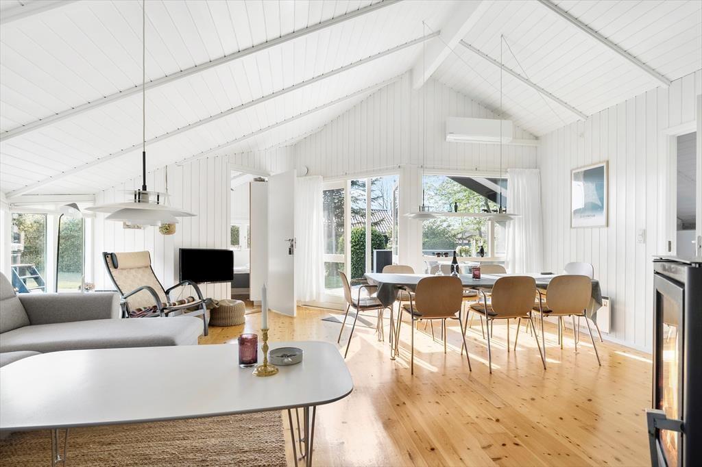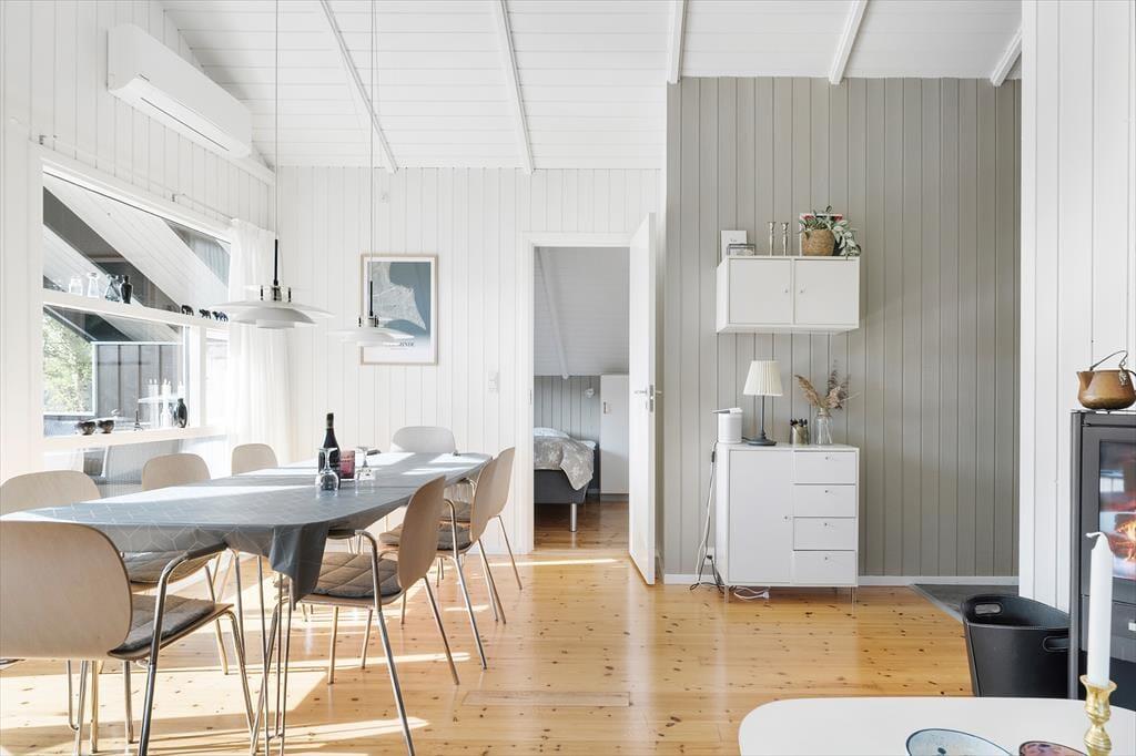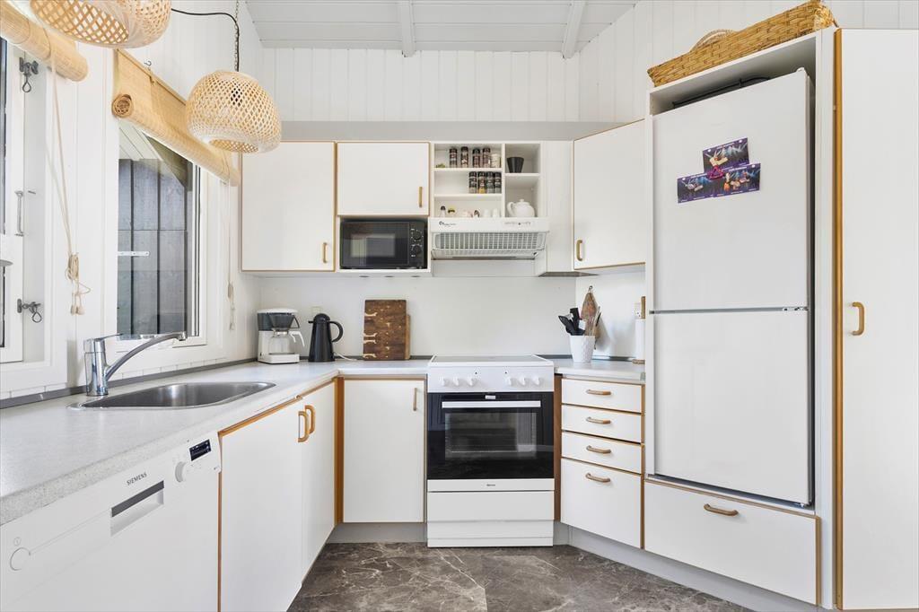 Sommerhusets åbne køkken er fuldt udstyret og klar til at imødekomme dine kulinariske eventyr. Det åbne design skaber en behagelig forbindelse mellem madlavning og samvær, så du kan deltage i samtaler med familien eller venner, mens du tilbereder lækker mad.