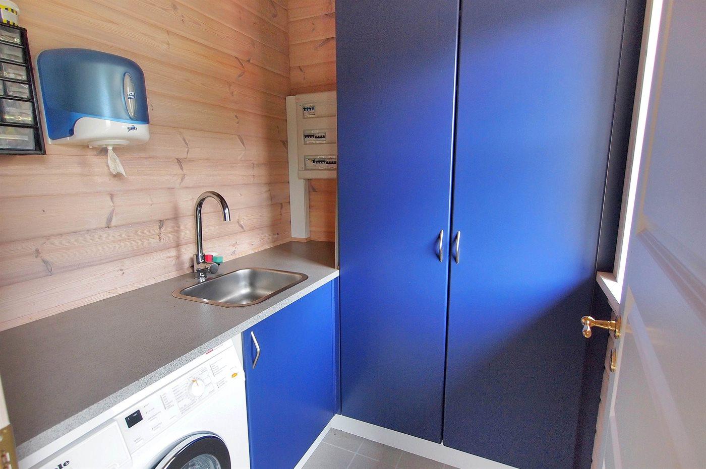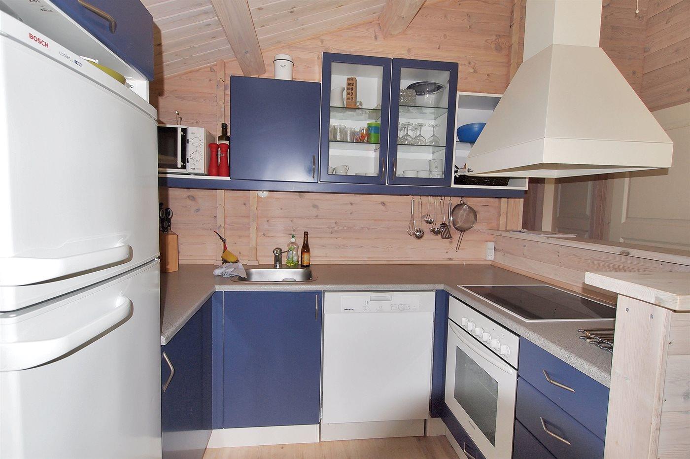 Køkkenet er udstyret med 1 køleskab. Der er 4 keramiske kogeplader, varmluftovn samt opvaskemaskine.