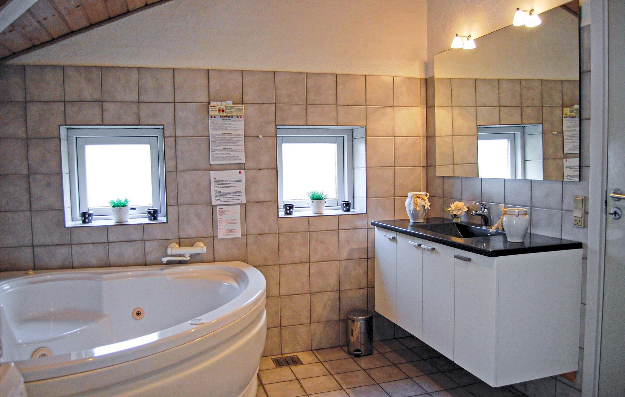Den store stue er omdrejningspunktet i huset og ligger i tilknytning til det lyse og funktionelle køkken. Det flotte poolrum har store vinduer med udsigt og i den ene ende er der en maritim udsmykning. Her kan fordrives mange dejlige timer med leg og vandsprøjt, ligesom I kan sidde tilbagetrukket og hyggesnakke, mens I kigger på børnene i bassinet. Husets ene badeværelse med spa og sauna, ligger ved siden af poolområdet og det andet i forbindelse med værelserne i husets anden side.