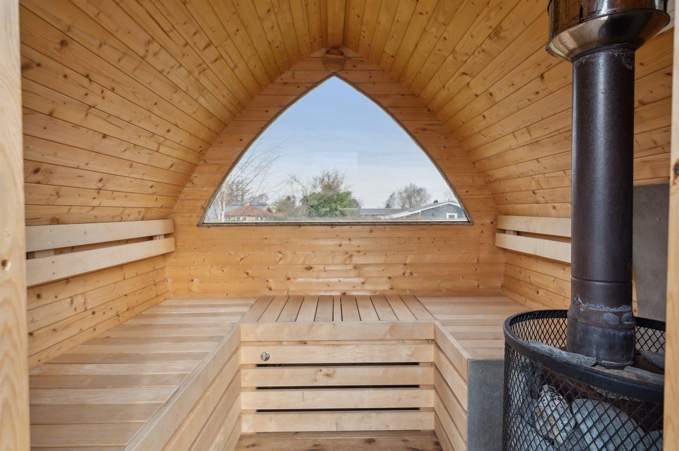 Ferieboligen er beliggende på en 1500 m² stor havegrund. Der er 250 m til havet. Der er en badebro i nærheden. Nærmeste forretning er beliggende i en afstand af 4000 m. Der er en golfbane i en afstand af 8000 m. Til ferieboligen hører åbent terrasseareal. Der er redskabsrum. Gynge. Legetårn. Rutchebane. Udendørs sauna. Udendørs bruser. Grill til rådighed. Der er installeret stik til opladning af elbil. Type 2 stik. Med 11 kW ladeeffekt. Parkering ved ferieboligen.