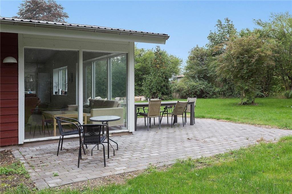 Huset har en 1220 m2 stor grund med en fliseterrasse som går rundt om huset. Ved feriehuset er der havemøbler og grill.