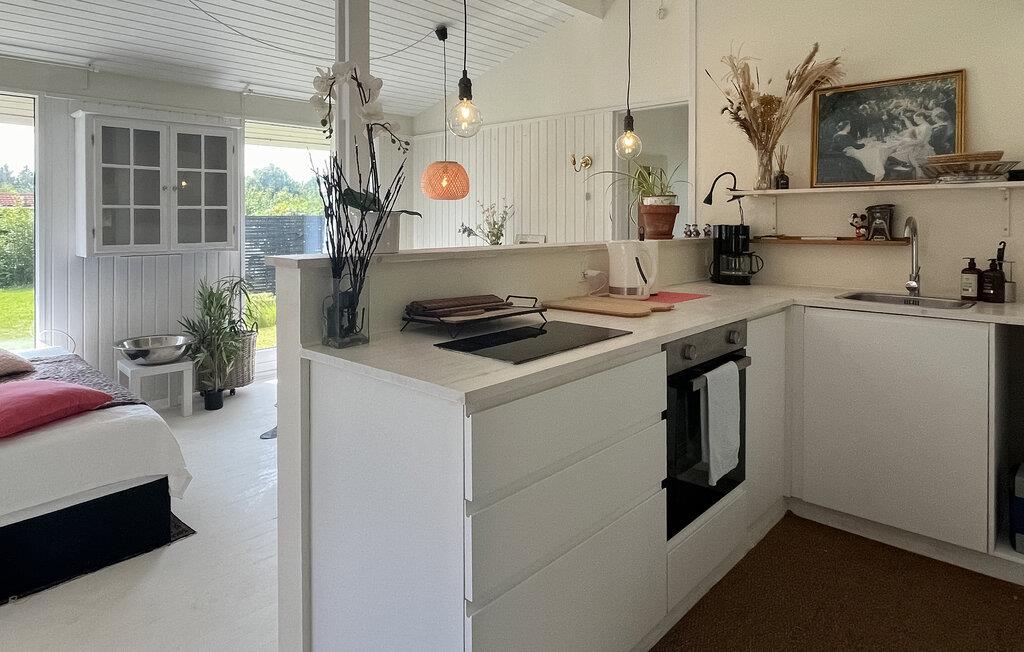 Hold en afslappende ferie i fredfyldte omgivelser, beliggende i et grønt, børnevenligt landskab. Dette indbydende feriehus skaber de optimale betingelser for at tilbringe tid med familien. Slap af i den åbne opholdsstue med et komfortabelt siddeområde, stort spisebord og direkte adgang til naturen. De lyse trægulve understreger husets venlige atmosfære.