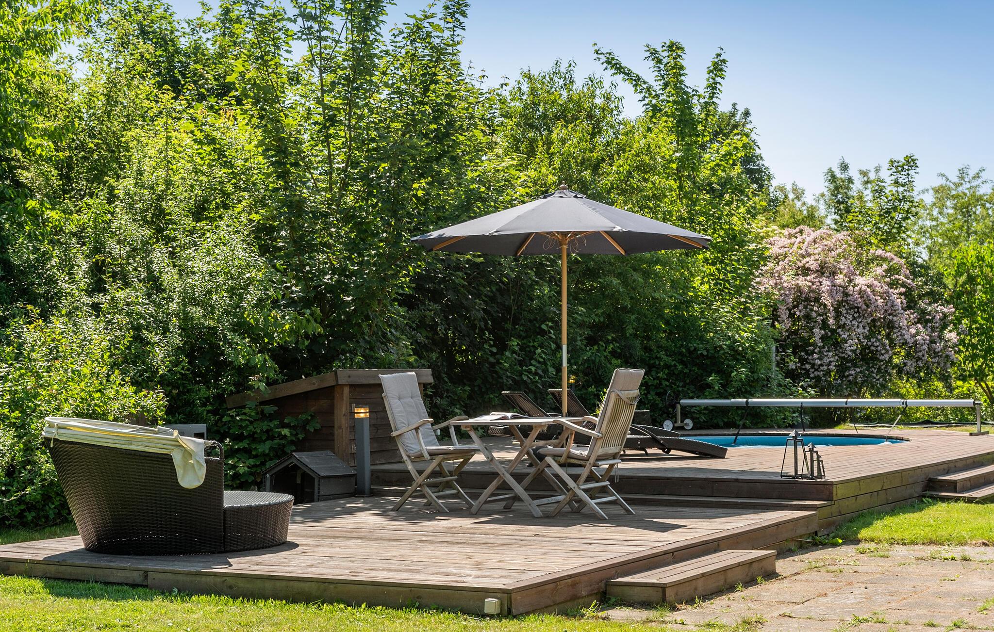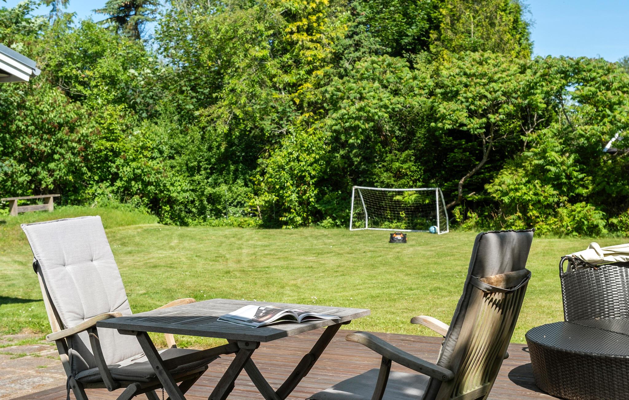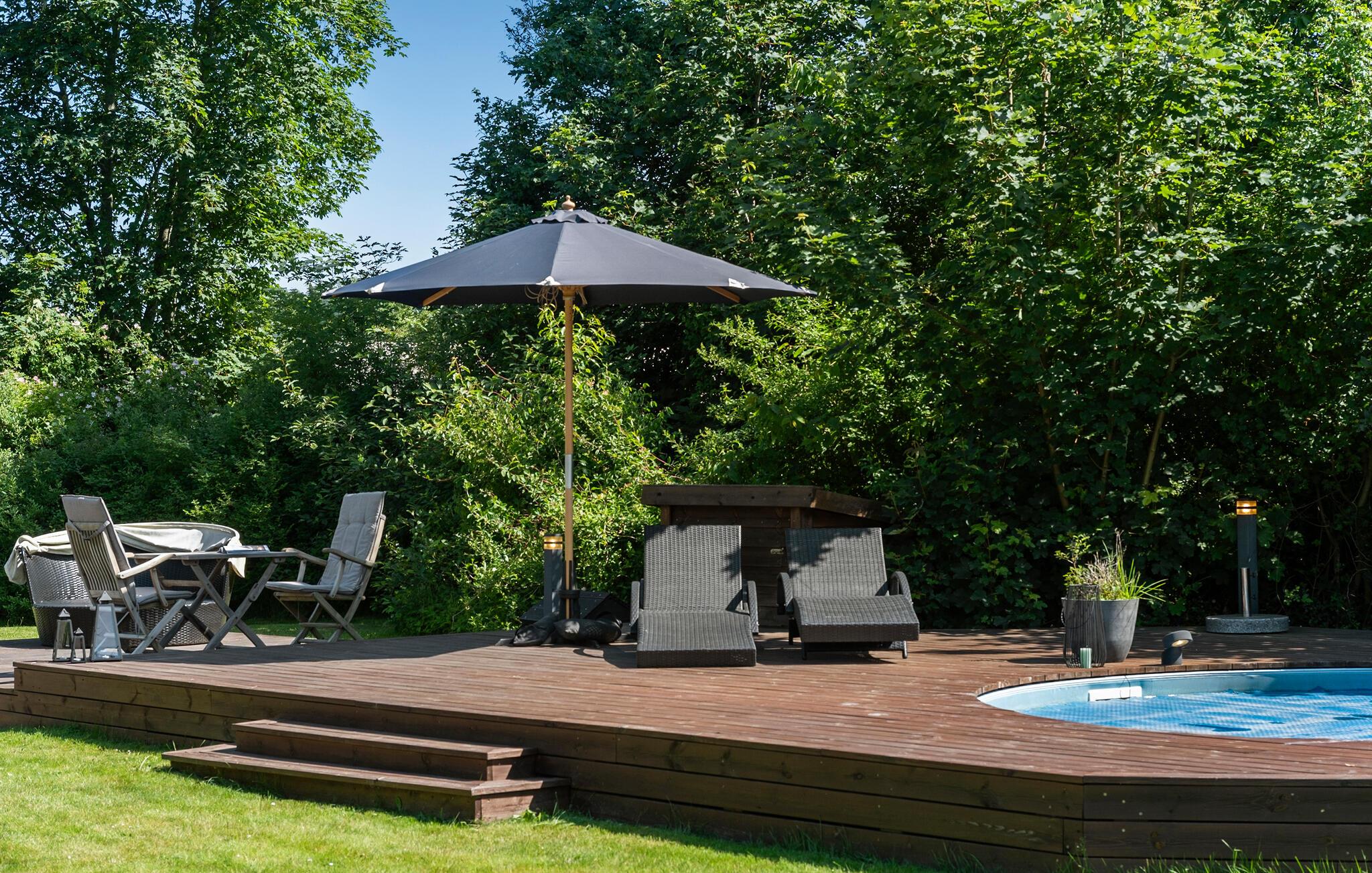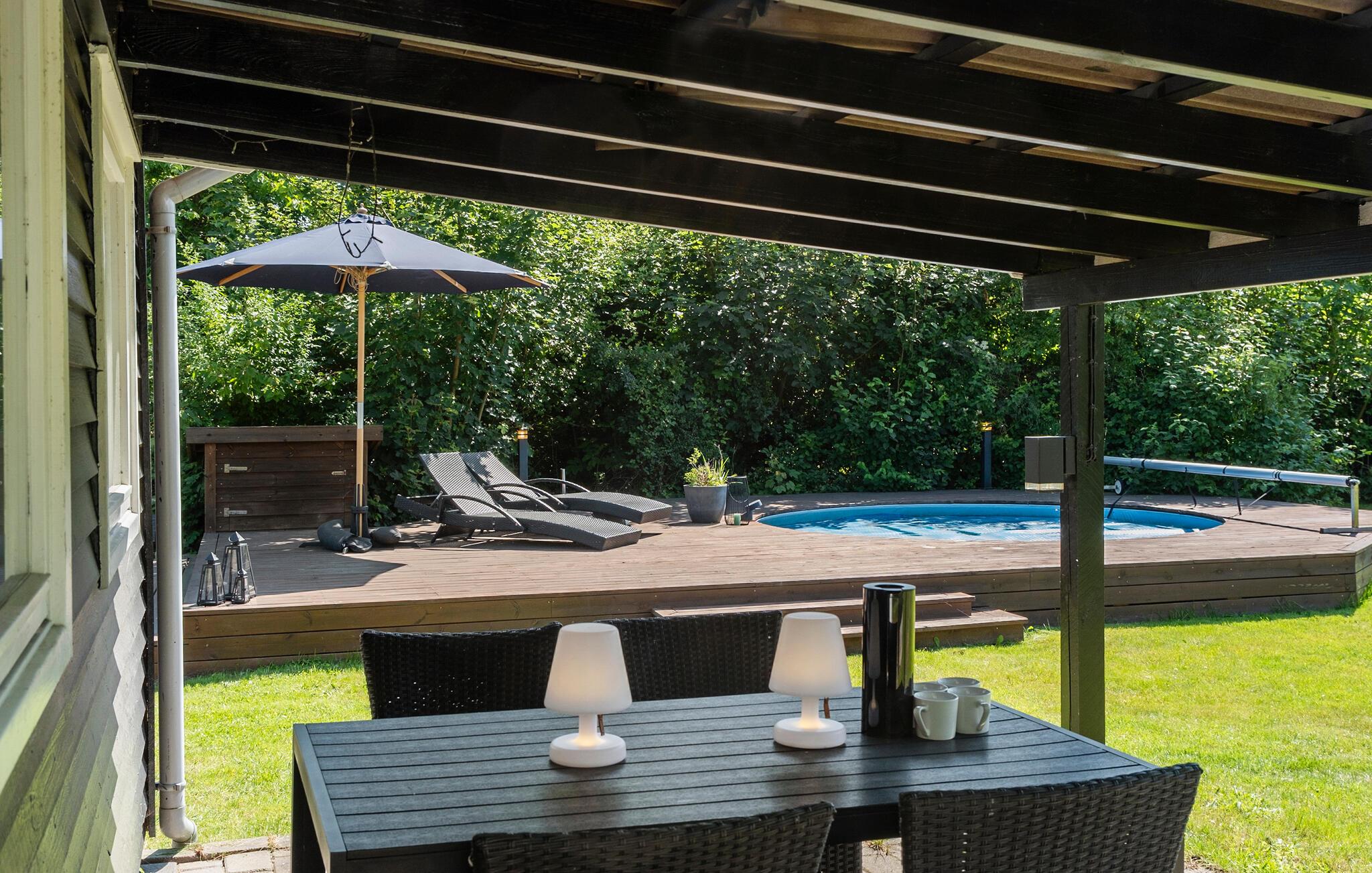 Nyd solrige eftermiddage på den store træterrasse med loungemøbler, parasol og jeres egen pool. Tag en dukkert i det kølige vand eller slap af på en liggestol. Nyd måltiderne i det overdækkede udendørsområde, og nyd lune sommeraftener udendørs. Den store have er et sandt paradis for børn. Spil fodbold på græsplænen, hop på trampolinen eller spil en spændende kamp ved badmintonnettet. En gynge og petanque giver også variation og motion.