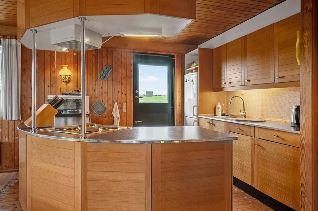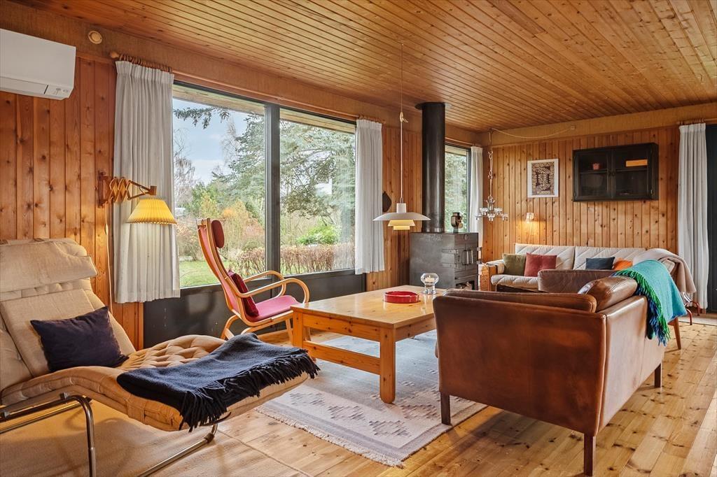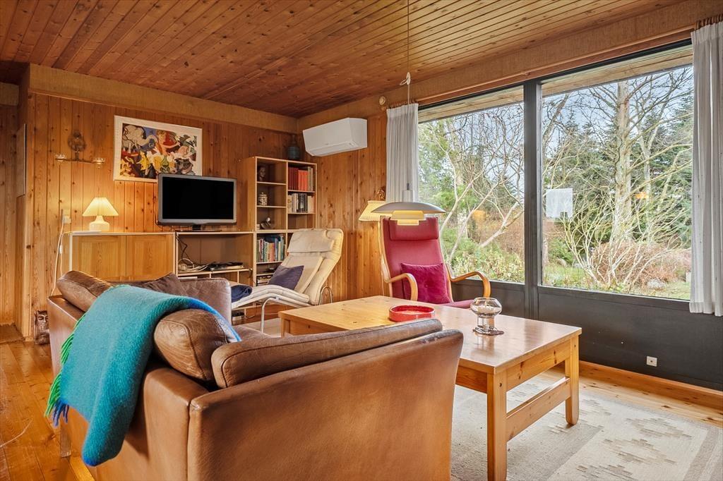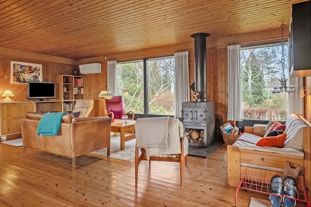 Når I træder ind i entreen, kan I lade roen sænke sig og lade feriestemningen komme til jer. Køkken og stue er ud i et og I kan være sammen, imens I laver mad eller bare hygger foran brændeovnen med brætspil. Her er TV med danske kanaler og Chromecast og så er der varmepumpe. Fra stuen er der udgang til en overdækket terrasse, hvor I kan sidde når duggen falder og nyde stilheden og hinanden selskab. Ved køkkenet er der udgang til en god terrasse som har udsigt til åbne marker, her kan I nemt nyde en kop kaffe og planlægge dagens oplevelser. Her er 3 værelser, to med dobbeltseng og et med 2 enkeltsenge. Så her er plads til jer alle og mulighed for at trække sig tilbage og læse en god bog eller tage en lur. Fint badeværelse med toilet og håndvask, samt bruseniche.