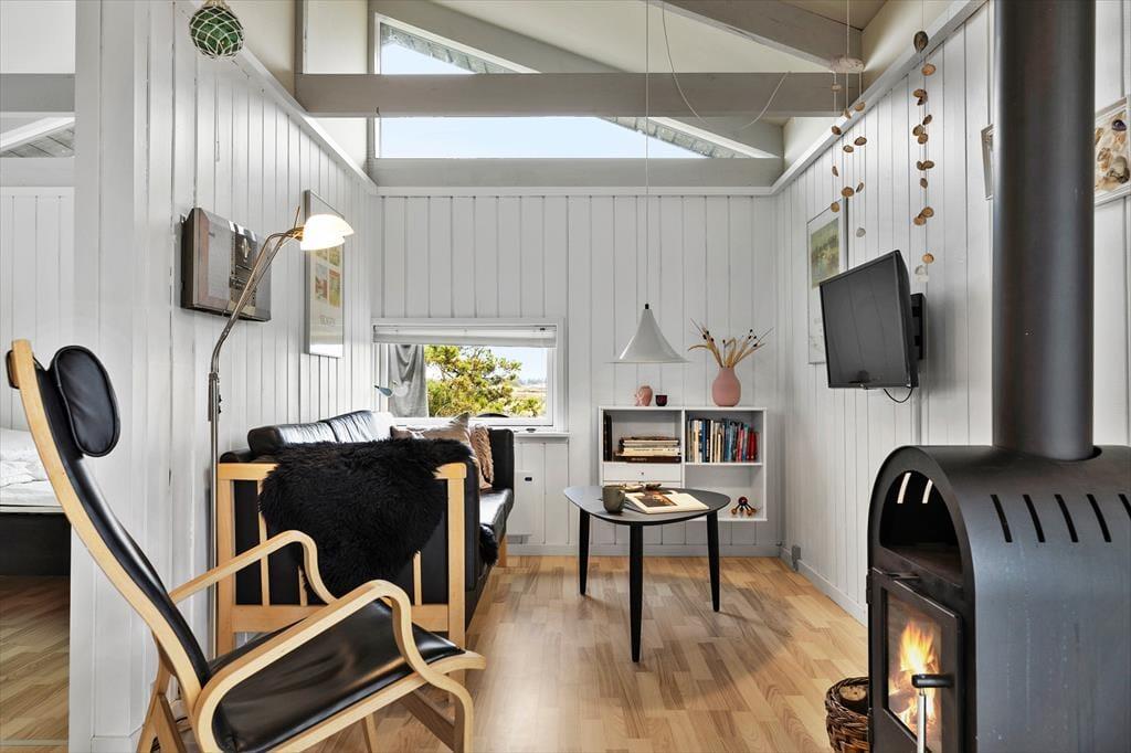 Indenfor bliver du mødt af en lys og indbydende atmosfære, hvor loftet går til kip og skaber en skøn rumfornemmelse. Brændeovnen står klar til at sprede varme og hygge, når aftenerne bliver kølige, og den velindrettede planløsning sikrer, at du og dine kære har god plads til både samvær og afslapning. Indretningen oser af klassisk sommerhuscharme, hvor træbeklædte vægge og bløde møbler indbyder til lange, langsomme morgener med friskbrygget kaffe og hyggelige aftener med kortspil og gode bøger. Uanset om du søger ro med en god film eller ønsker at nyde et godt måltid sammen med familien, er der plads til det hele her.