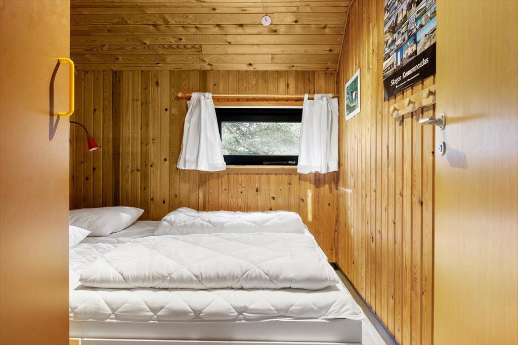 Bag den røde træfacade byder husets hyggelige og stemningsfulde rum dig velkommen. På klassisk sommerhusmanér er der loft til kip og rustik træbeklædning på væggene, og fra stuen giver en stige adgang til en hems. Hvis du har børn med på ferie, vil de sikkert synes, at det er hyggeligt at kravle herop for at lege, mens de voksne laver mad i køkkenet eller slapper af i stuens sofaafdeling. Lænestolen ved siden af brændeovnen er en perfekt siddeplads, hvis du vil læse eller strikke på en kølig aften. Og når det er tid til at sig godnat, kan du lige runde badeværelset for at børste tænder, inden du går til ro på et af de to soveværelser.