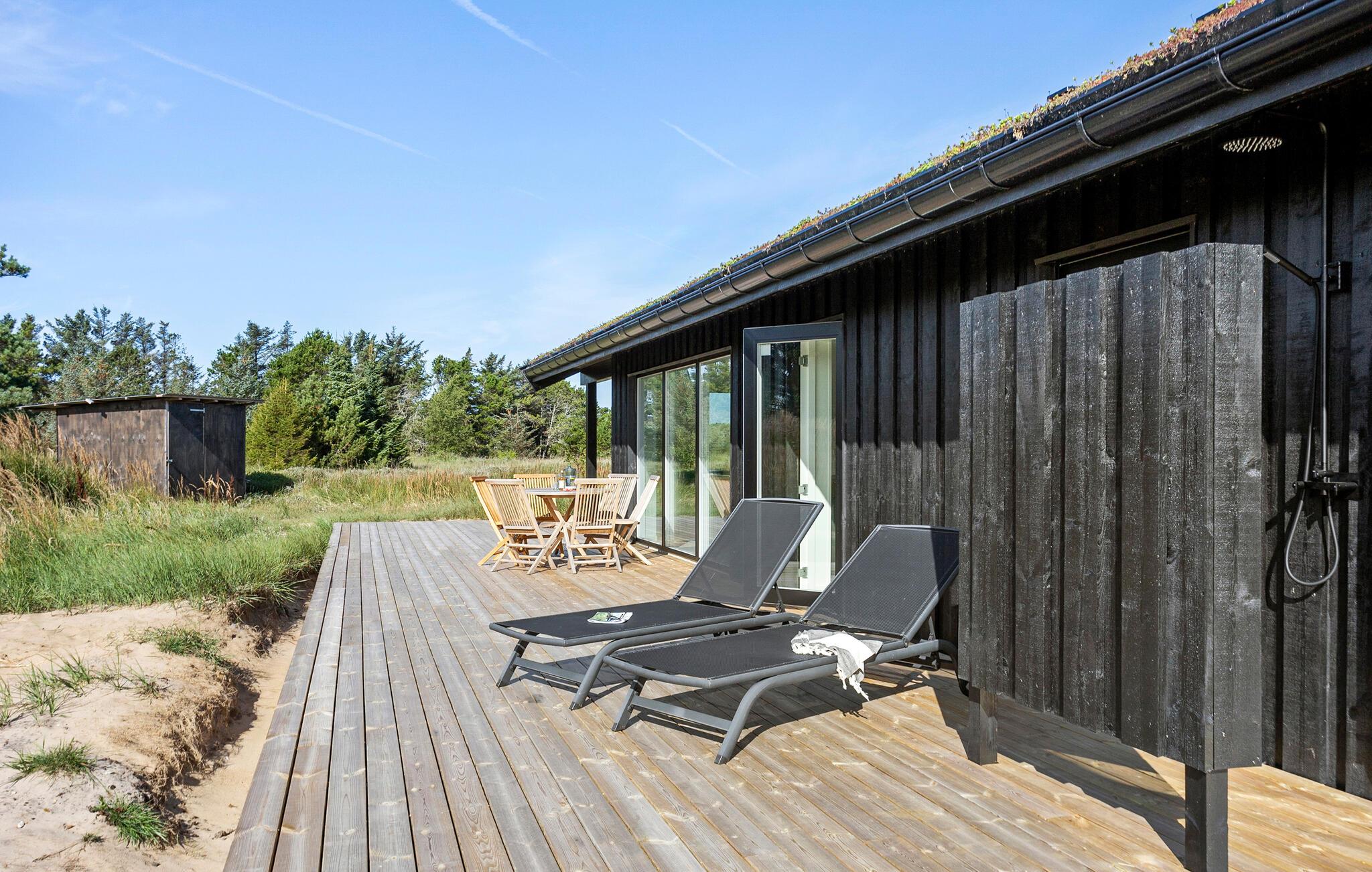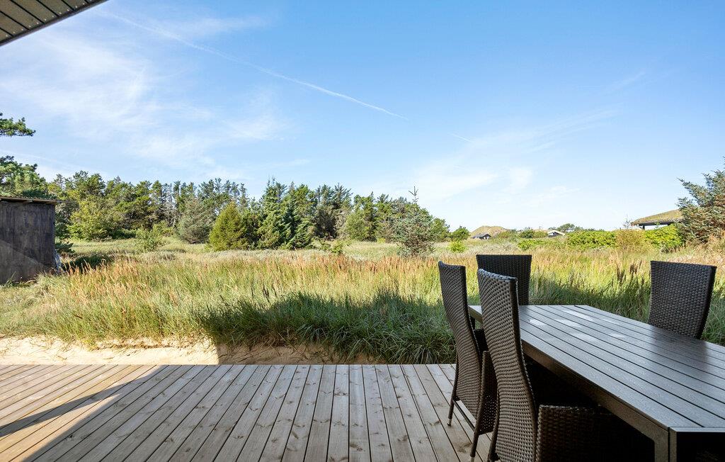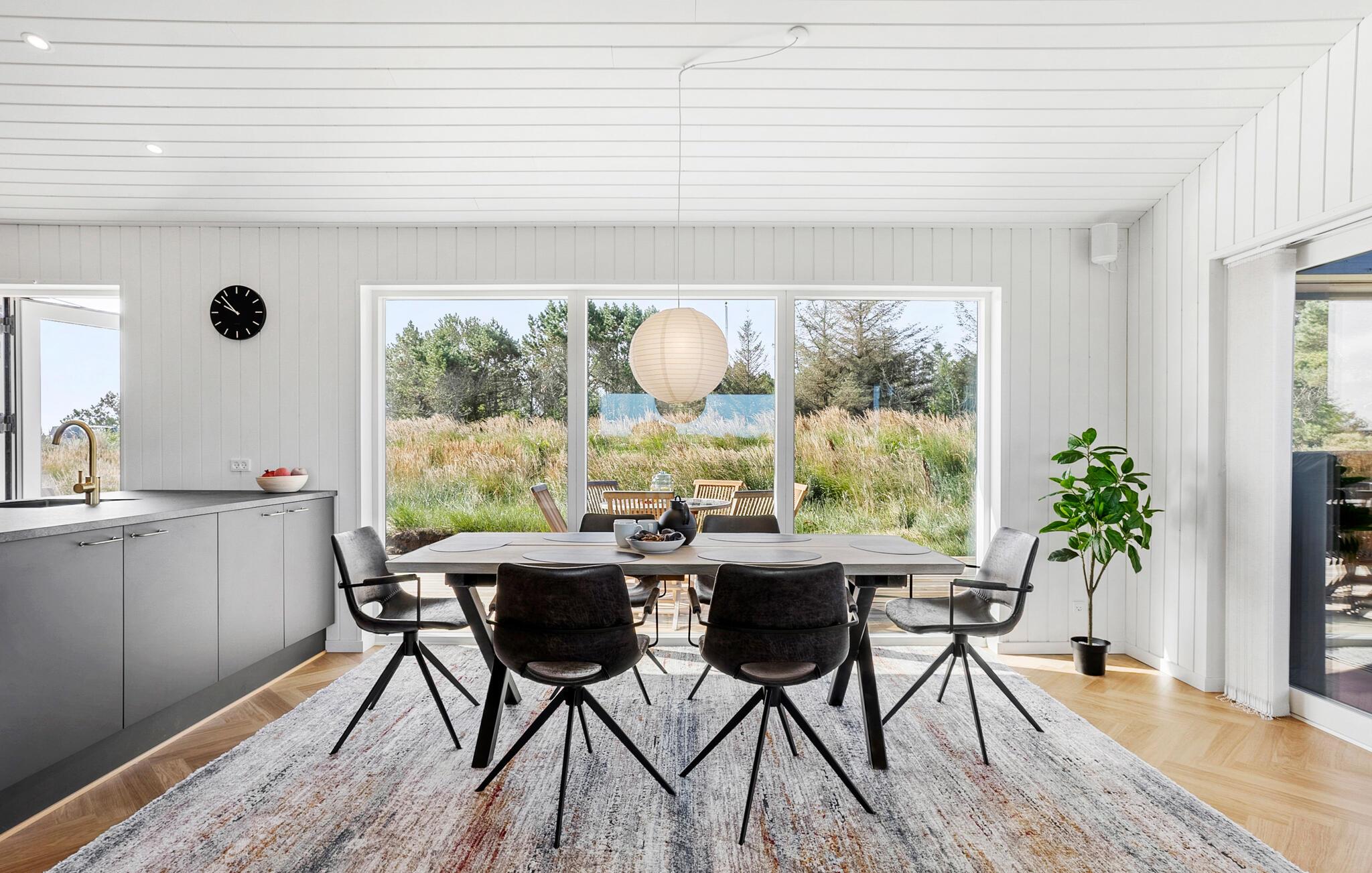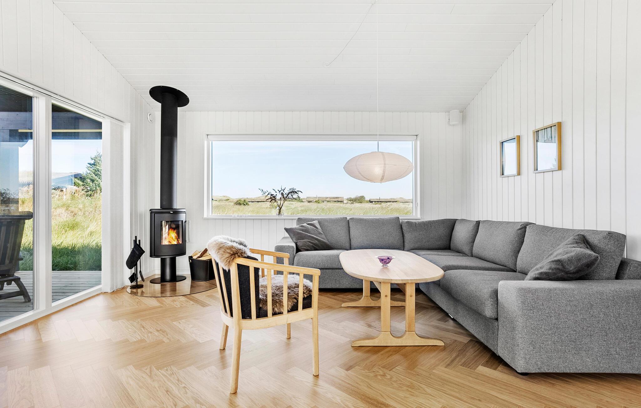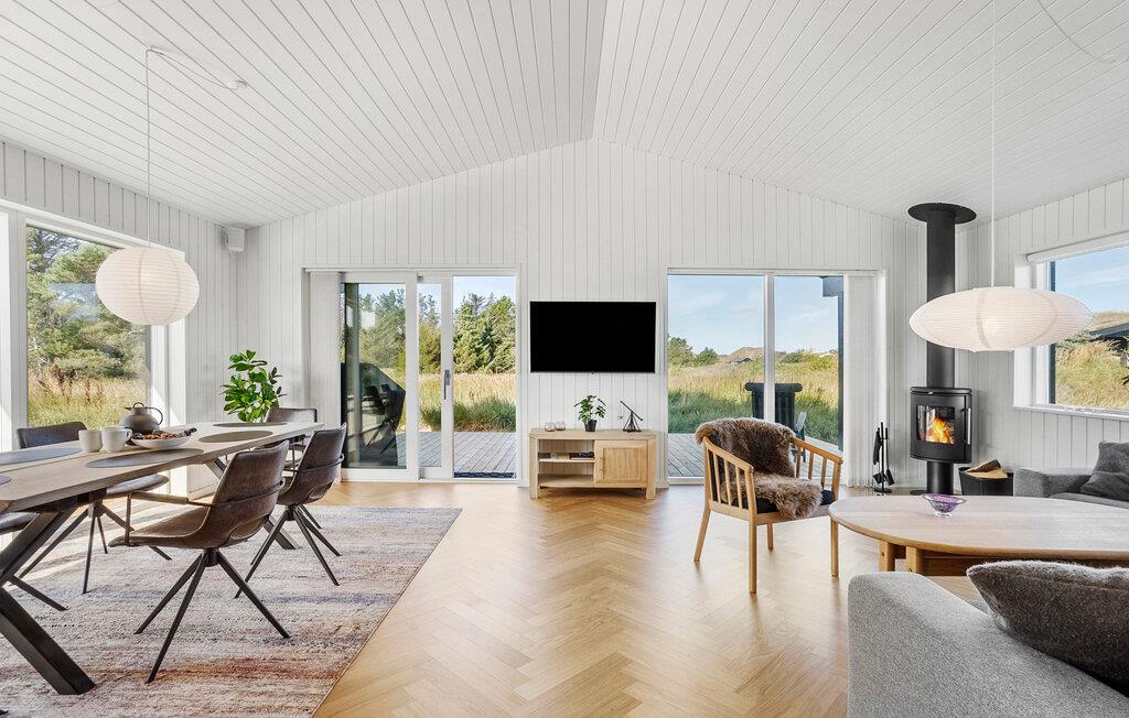Dette moderne og komfortable feriehus har et lyst og stilfuldt interiør med masser af plads ferien med jeres venner eller familie. Store vinduer lukker masser af naturligt lys ind i de smagfulde rum og tilbyder idyllisk udsigt over det maleriske klitlandskab. Glæd jer til nogle hyggelige madlavningsaftener i det åbne køkken, planlæg dagens aktiviteter ved spisebordet og lyt til vindens susen, mens I læner jer tilbage på sofaen om aftenen, mens ilden fra brændeovnen bader rummet i varmt lys.