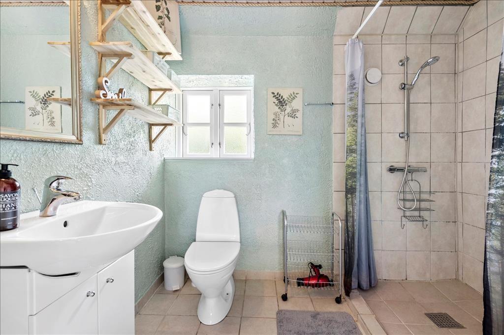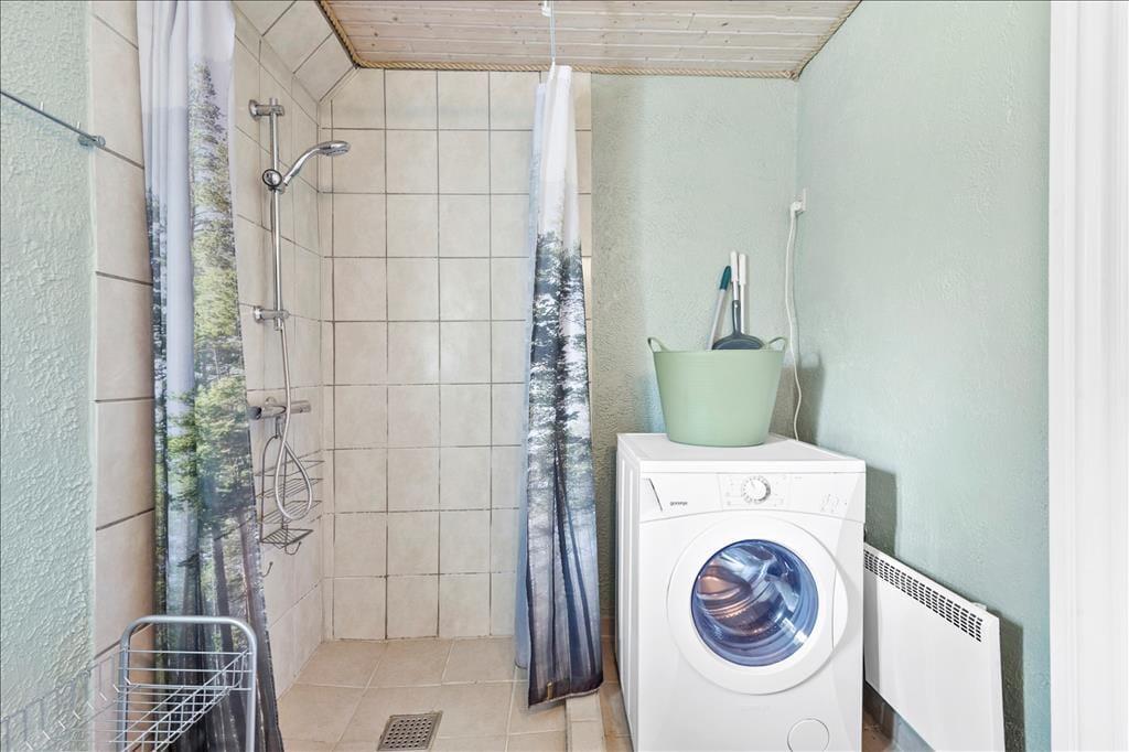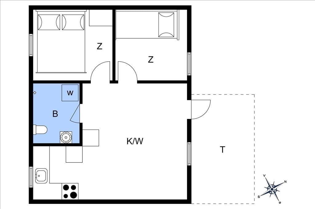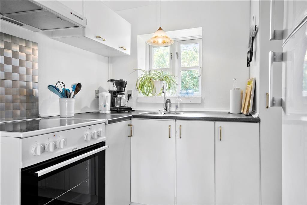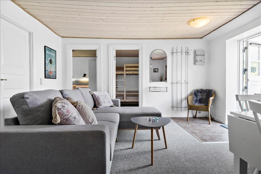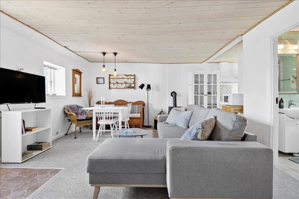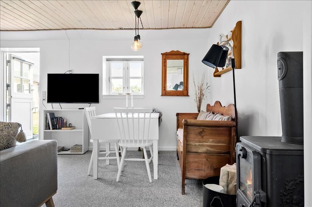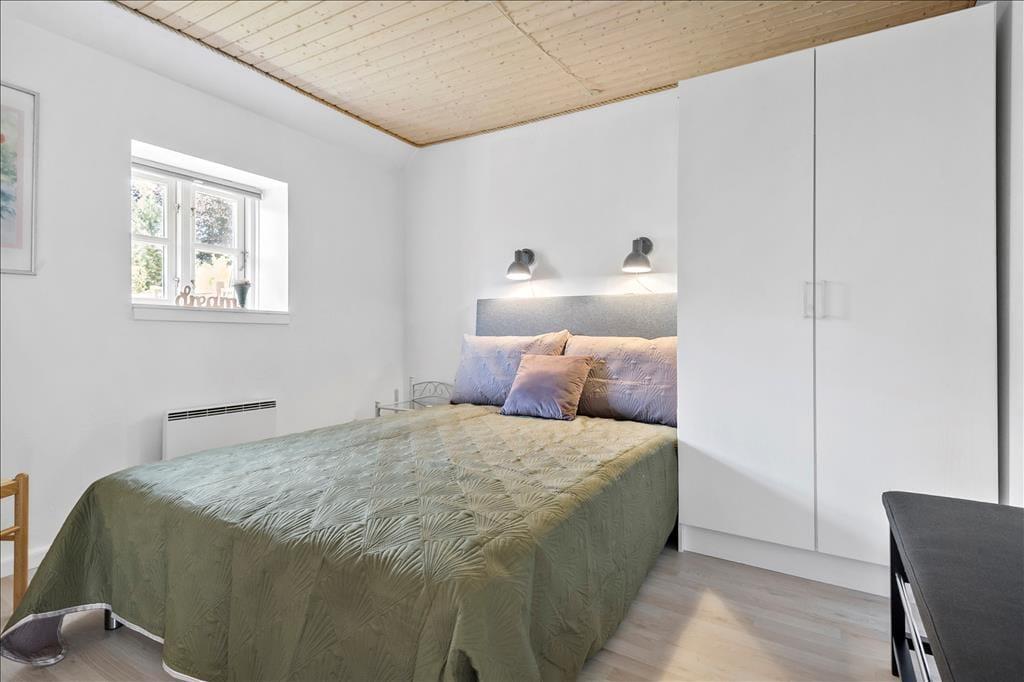 Indendørs: Total renoveret ferielejlighed, beliggende i hyggeligt bondegårdsmiljø. Indeholder: Hyggelig indrettet komb. opholds-/spisestue med brændeovn. Køkken, åbent til stue, køleskab, fryser, komfur/ovn, microovn. 2 soverum, 1 med dobb.seng, 1 med køjeseng. Badeværelse med bruseniche, håndvask, toilet samt vaskemaskine
