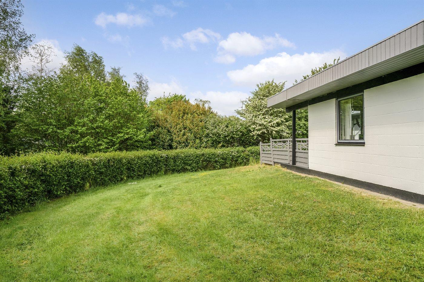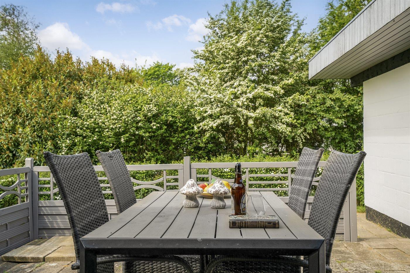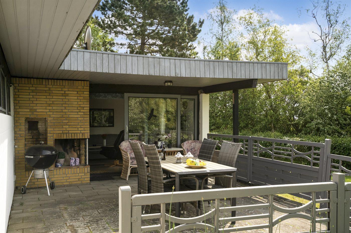Sommerhuset, som har en stor og delvis overdækket terrasse, ligger på et frodigt grundstykke omgivet at høje træer og buske.