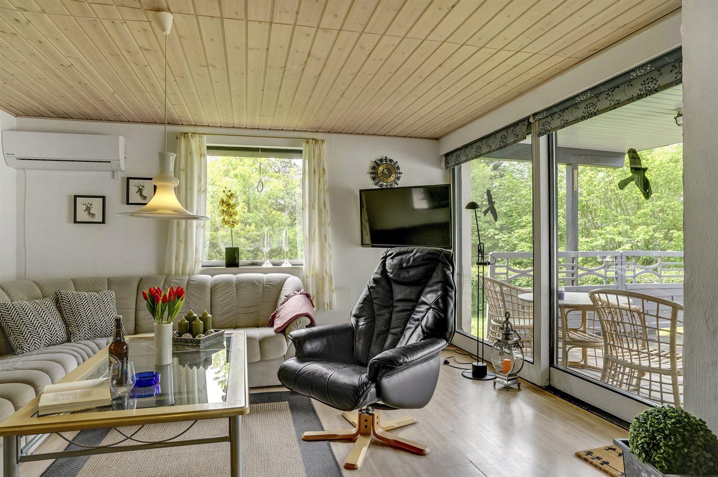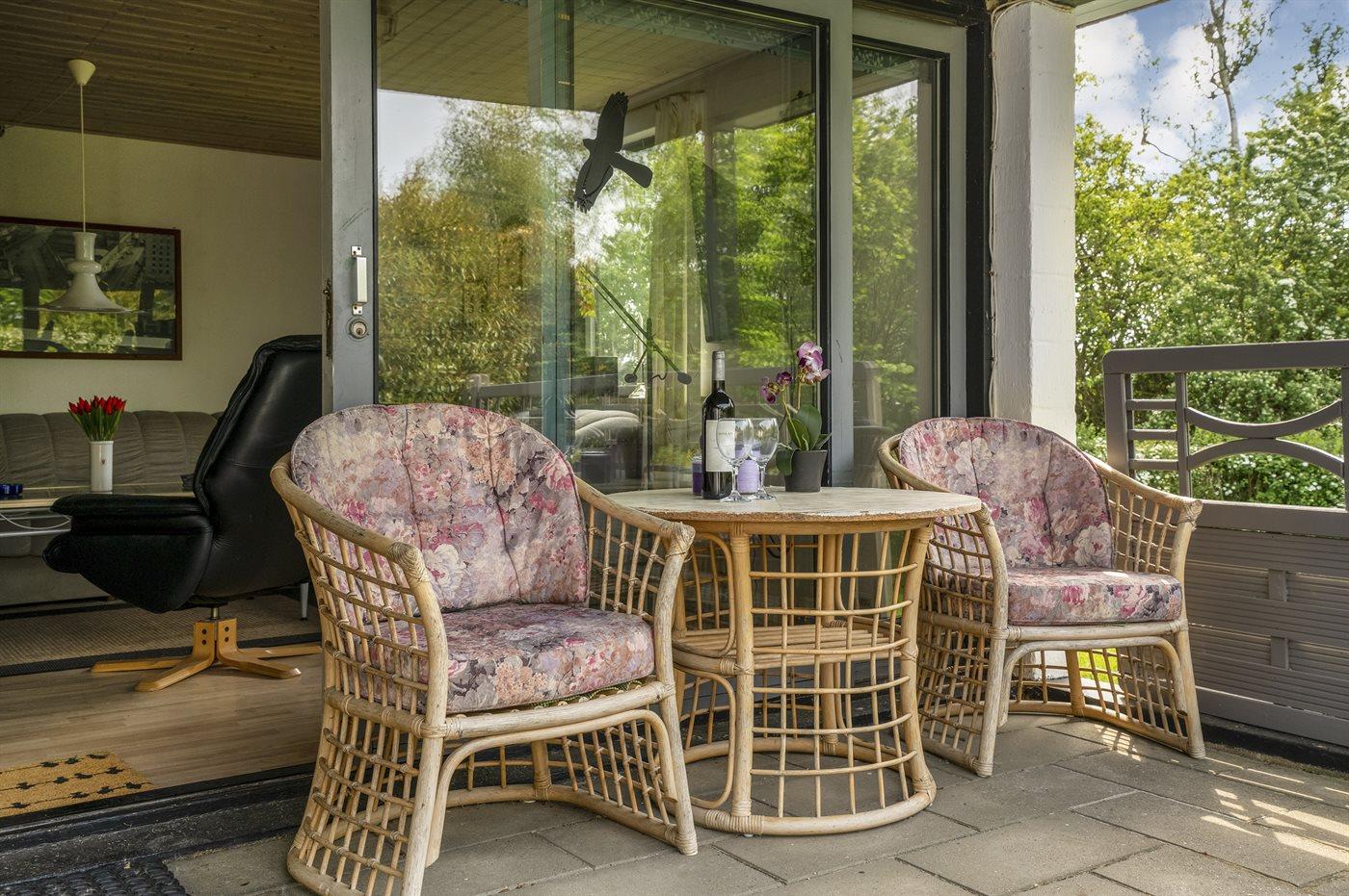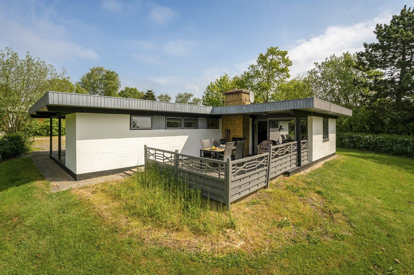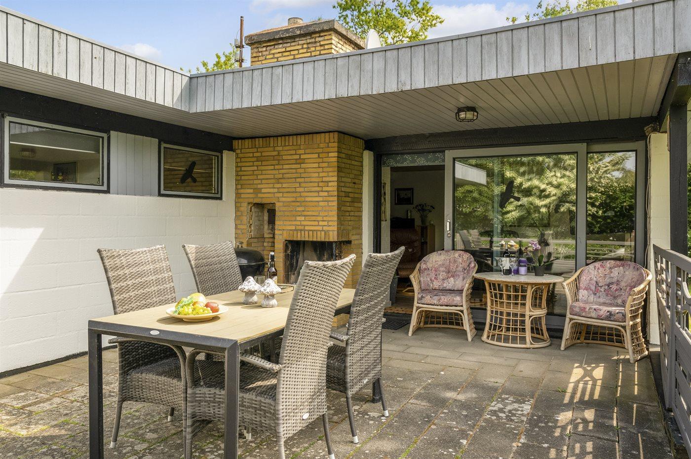 Sommerhuset, som har en stor og delvis overdækket terrasse, ligger på et frodigt grundstykke omgivet at høje træer og buske.