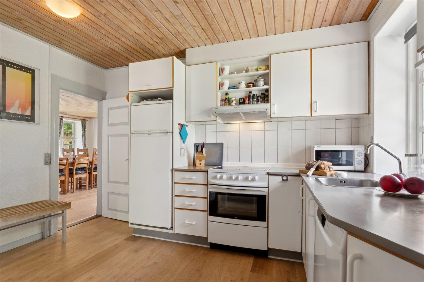 Køkkenet er udstyret med 1 køleskab. Der er 4 keramiske kogeplader, varmluftovn, mikrobølgeovn samt opvaskemaskine.