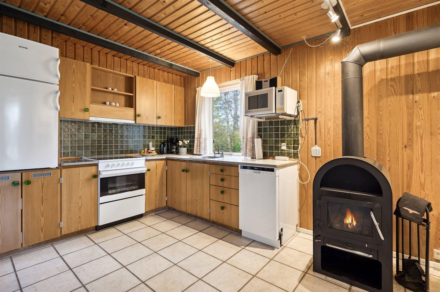 Køkkenet er udstyret med 1 køleskab. Der er 4 keramiske kogeplader, varmluftovn, mikrobølgeovn samt opvaskemaskine.