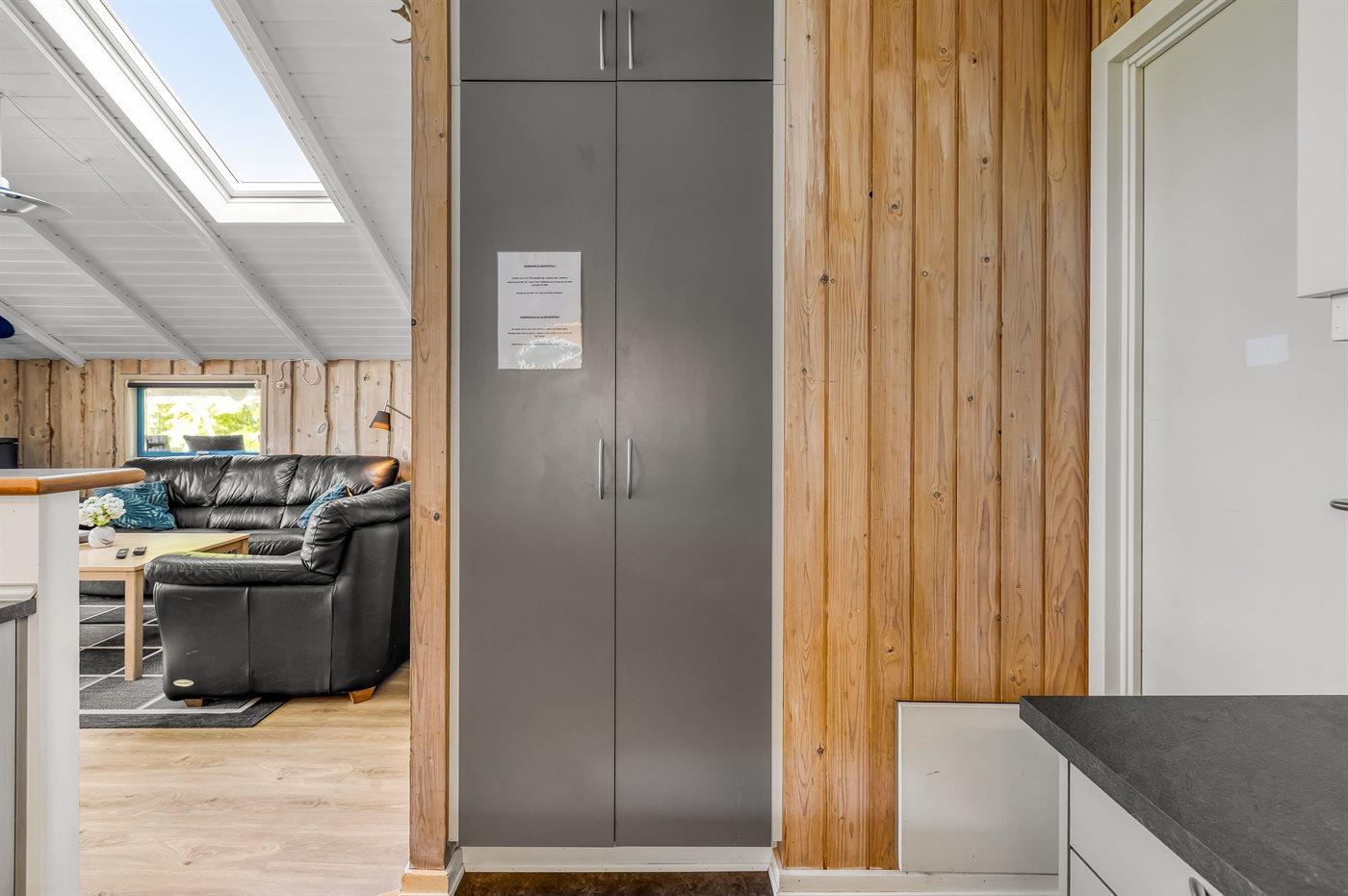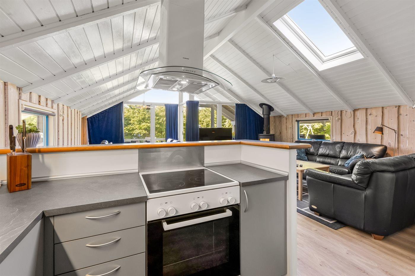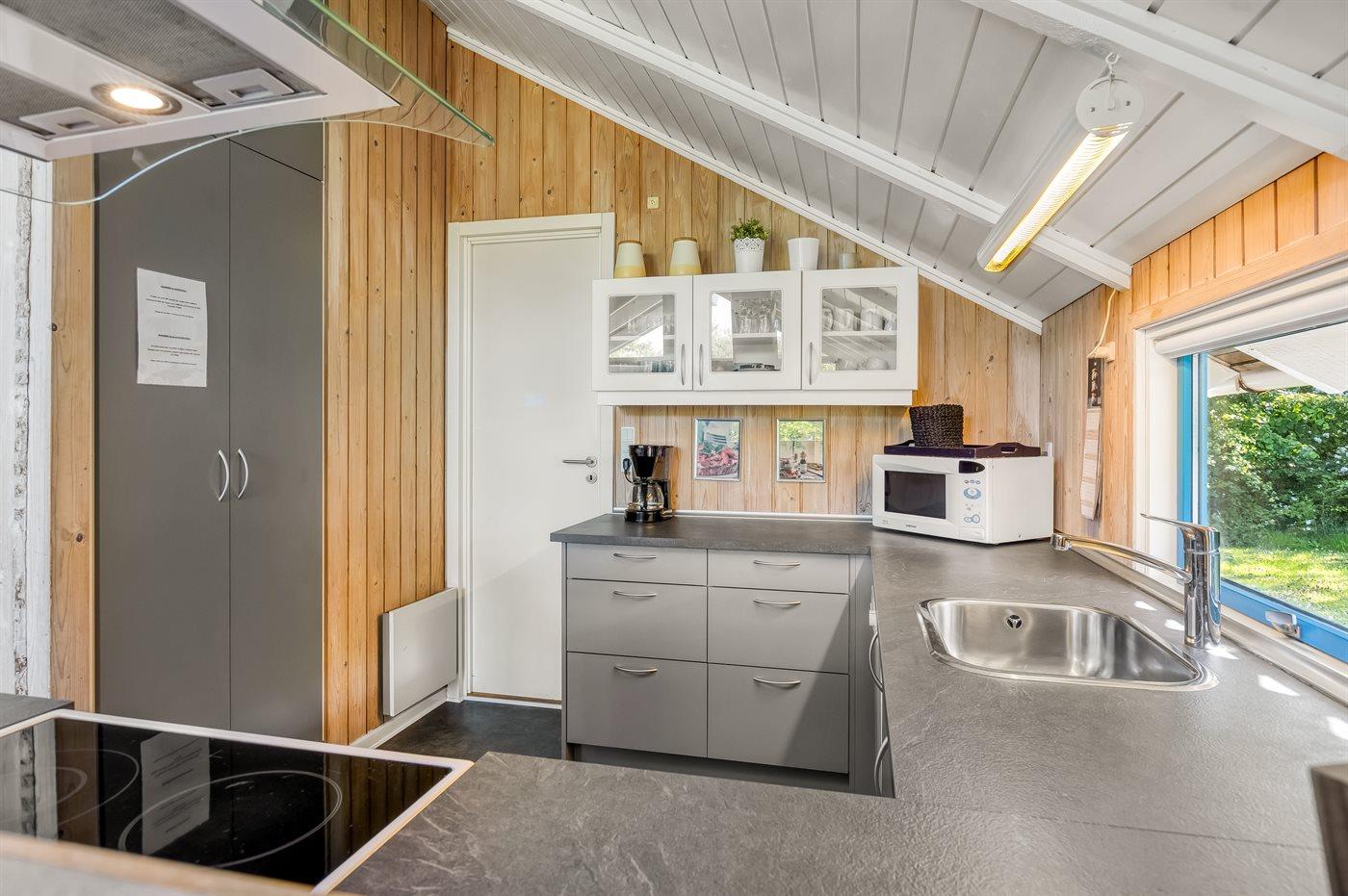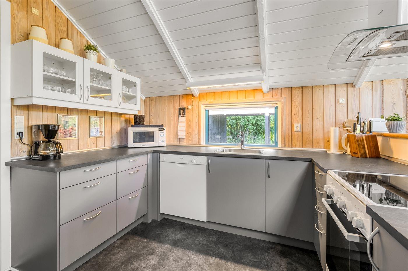 Køkkenet er udstyret med 1 køleskab. Der er 4 keramiske kogeplader, varmluftovn, mikrobølgeovn samt opvaskemaskine.