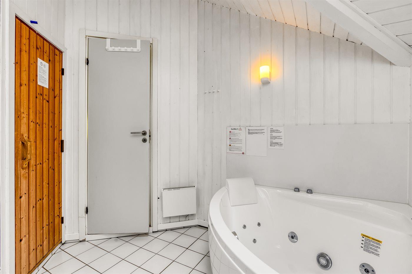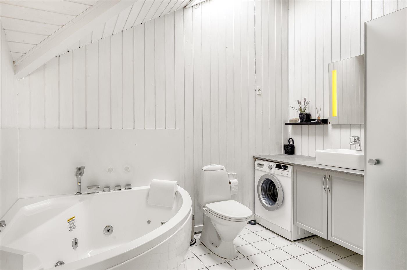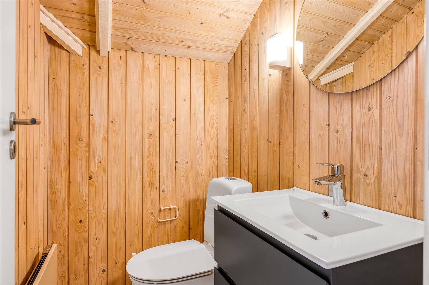 Der er 1 badeværelse med bruseniche og 2 toiletter, heraf 1 gæstetoilet I saunaen er der mulighed for afslapning.