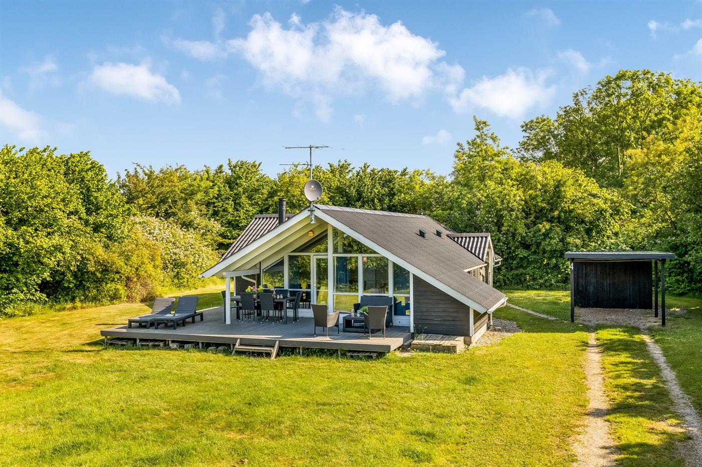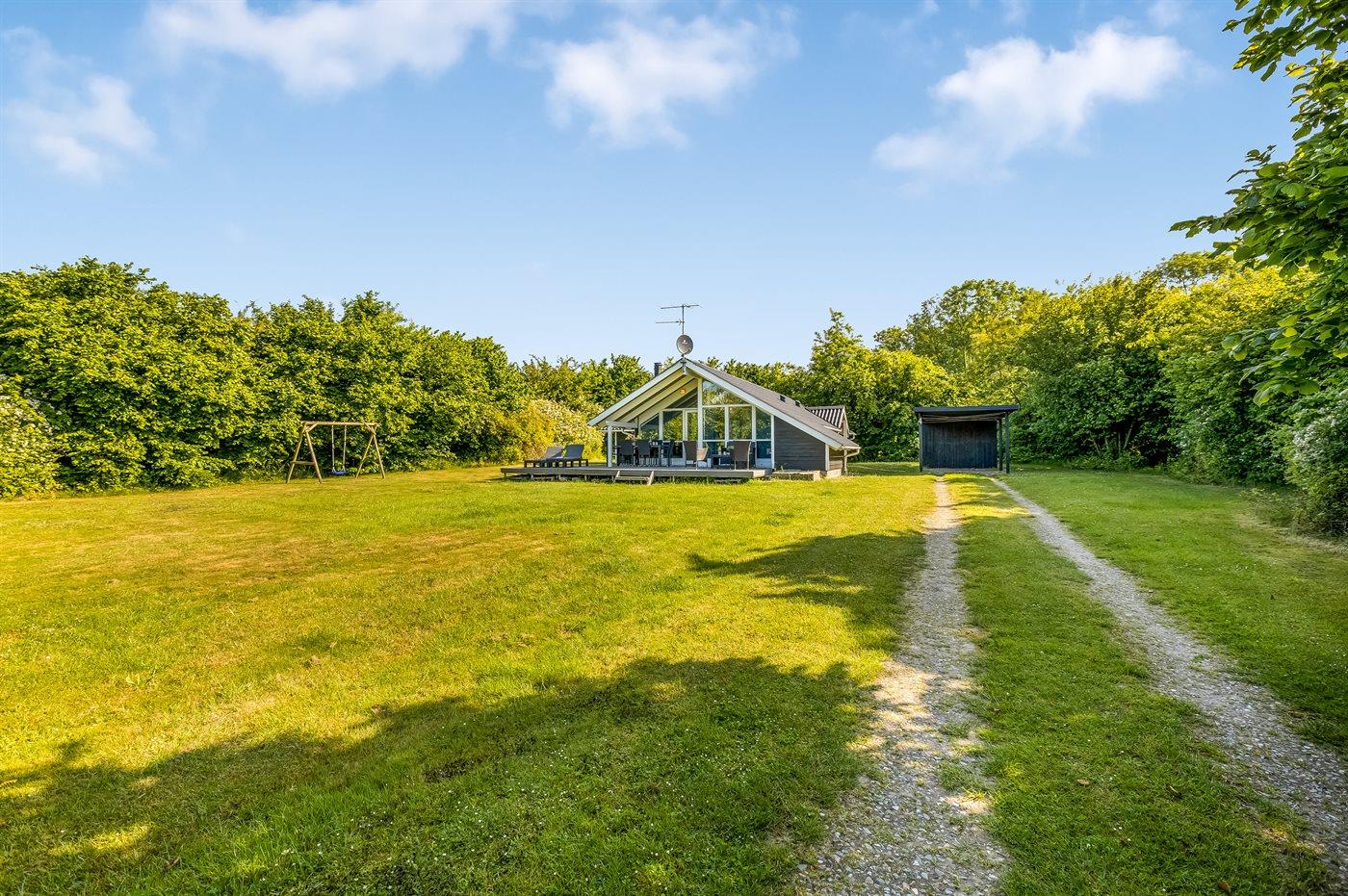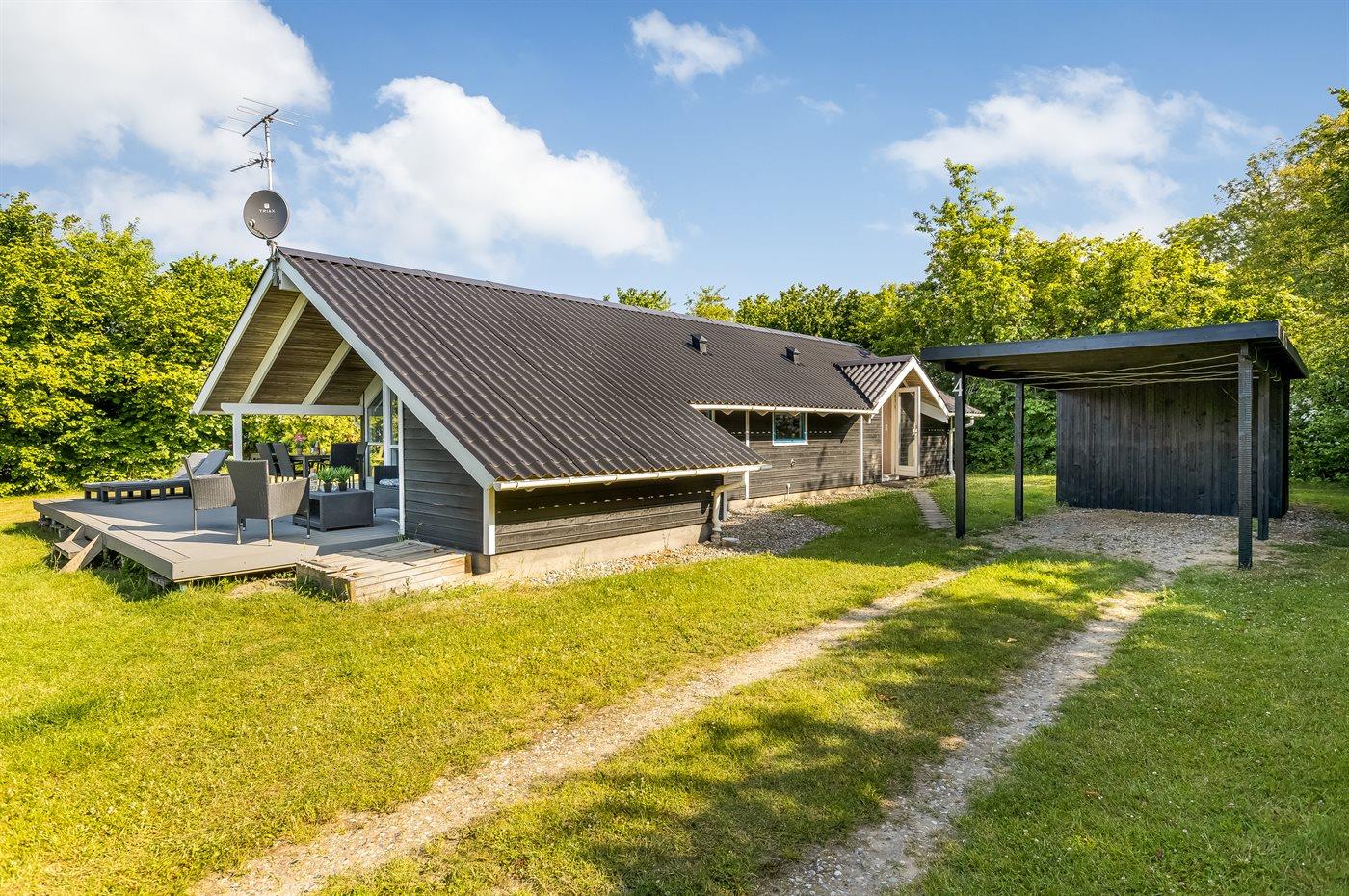 Ferieboligen er beliggende på en 1500 m² stor naturgrund. Der er 400 m til havet. Nærmeste forretning er beliggende i en afstand af 9000 m. Der er en golfbane i en afstand af 21000 m. Til ferieboligen hører åbent terrasseareal. Desuden er der overdækket terrasse. Grill til rådighed. Der er carport til rådighed. Parkering ved ferieboligen.