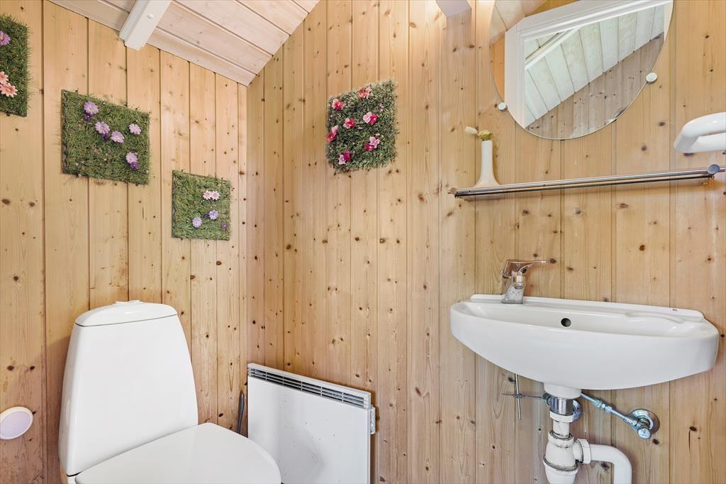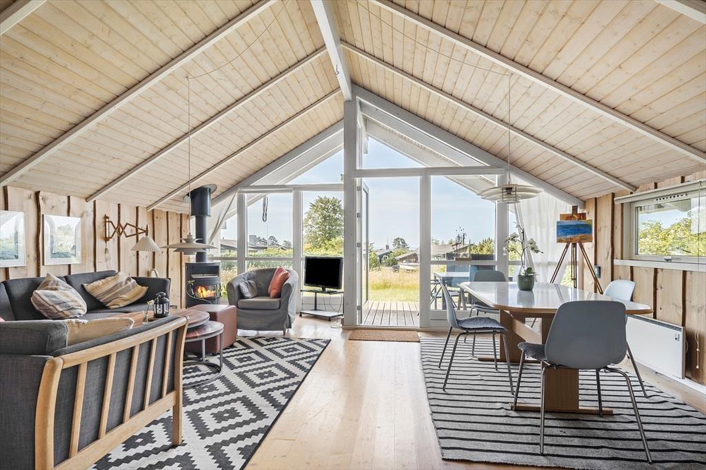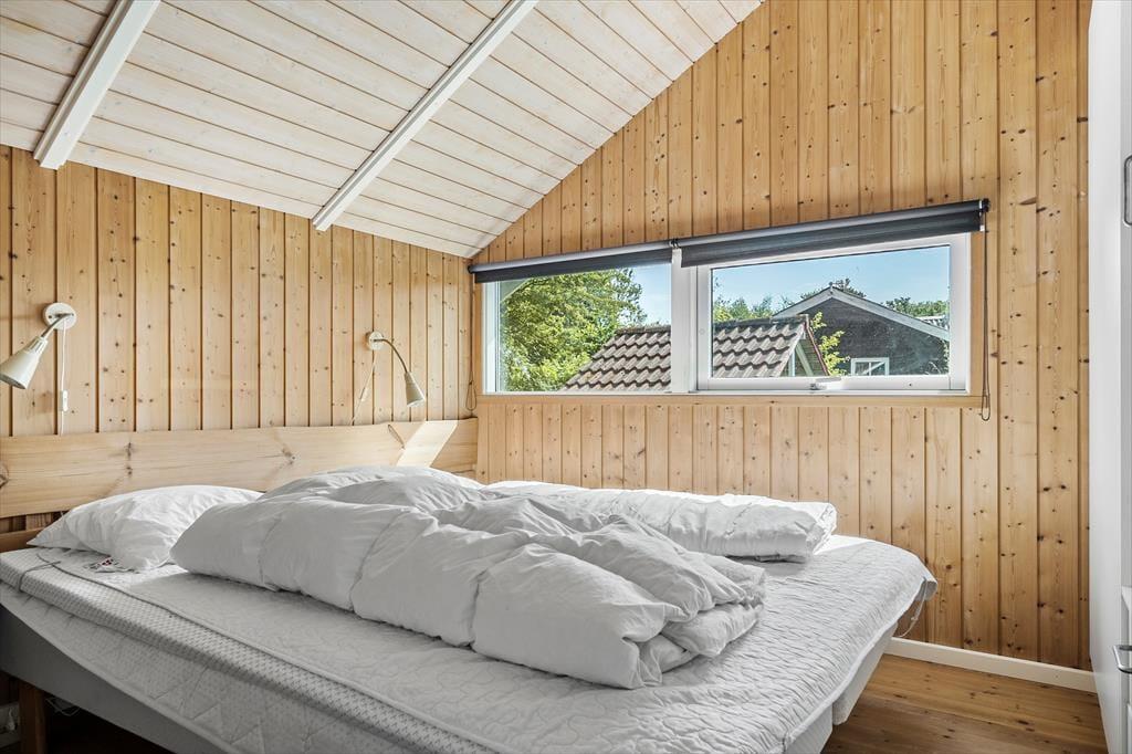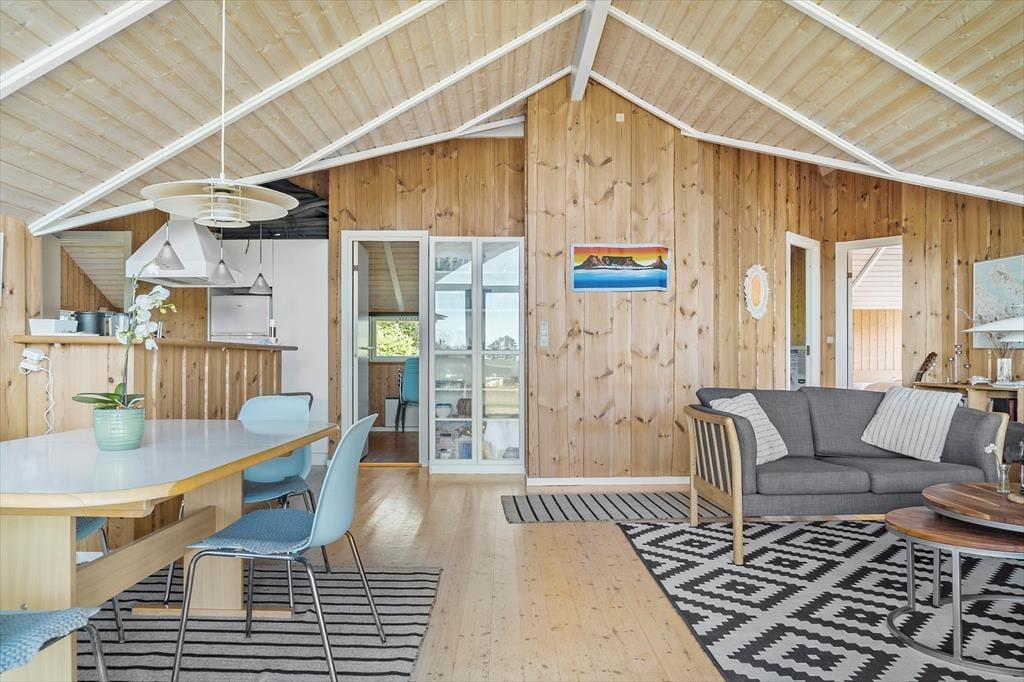 Velindrettet feriehus indeholdende en entré med vaskemaskine og tørretumbler, et værelse med to køjesenge, et køkken i åben forbindelse med stuen. I stuen er der brændeovn, spiseplads og udgang til terrassen. Derudover er der et badeværelse med spabad og sauna, et gæstetoilet, samt to soveværelser med en dobbeltseng i hver.