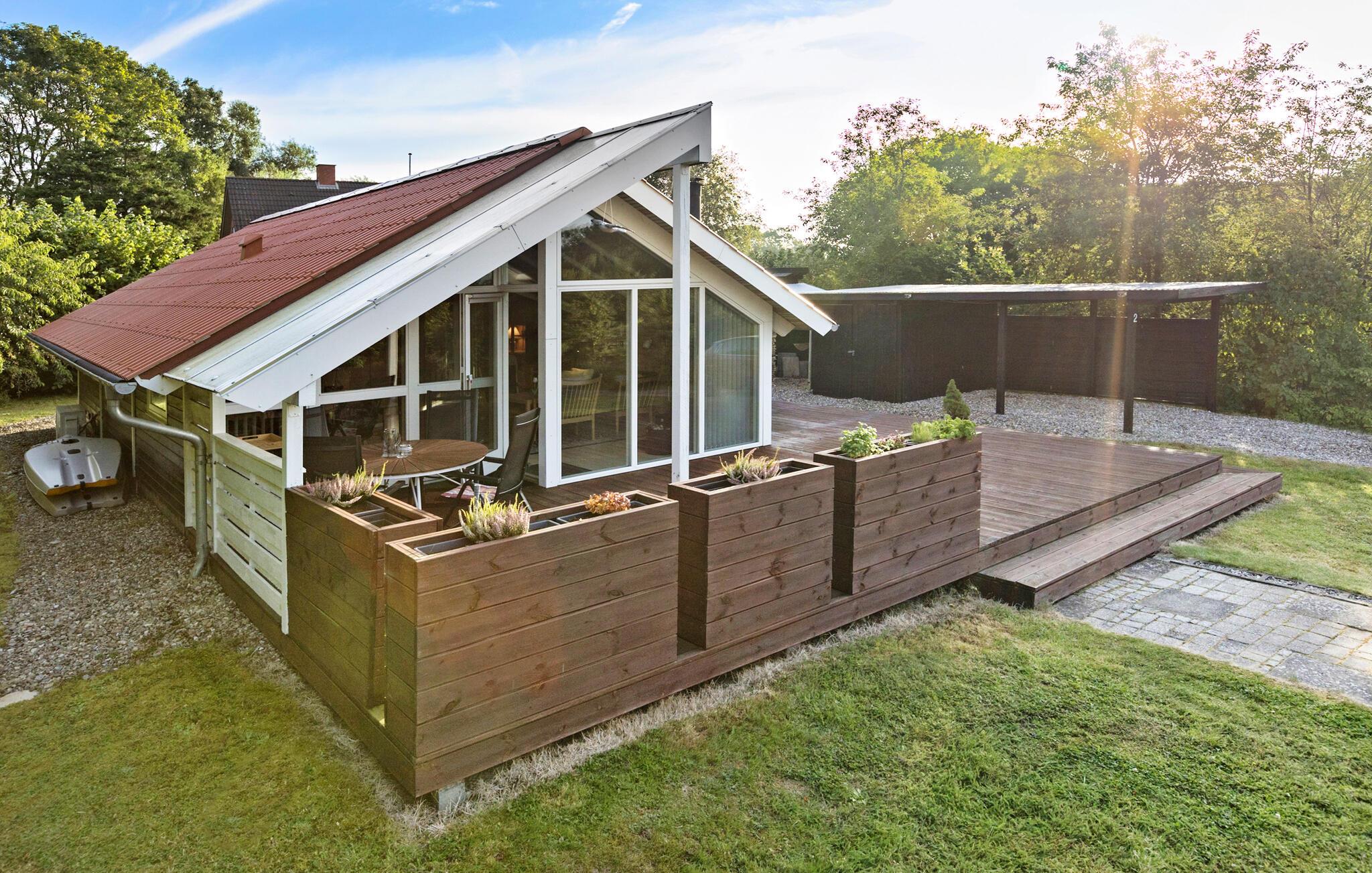 Hyggeligt træhus med wellness, sauna og spabad nær børnevenlig strand på Sydals.