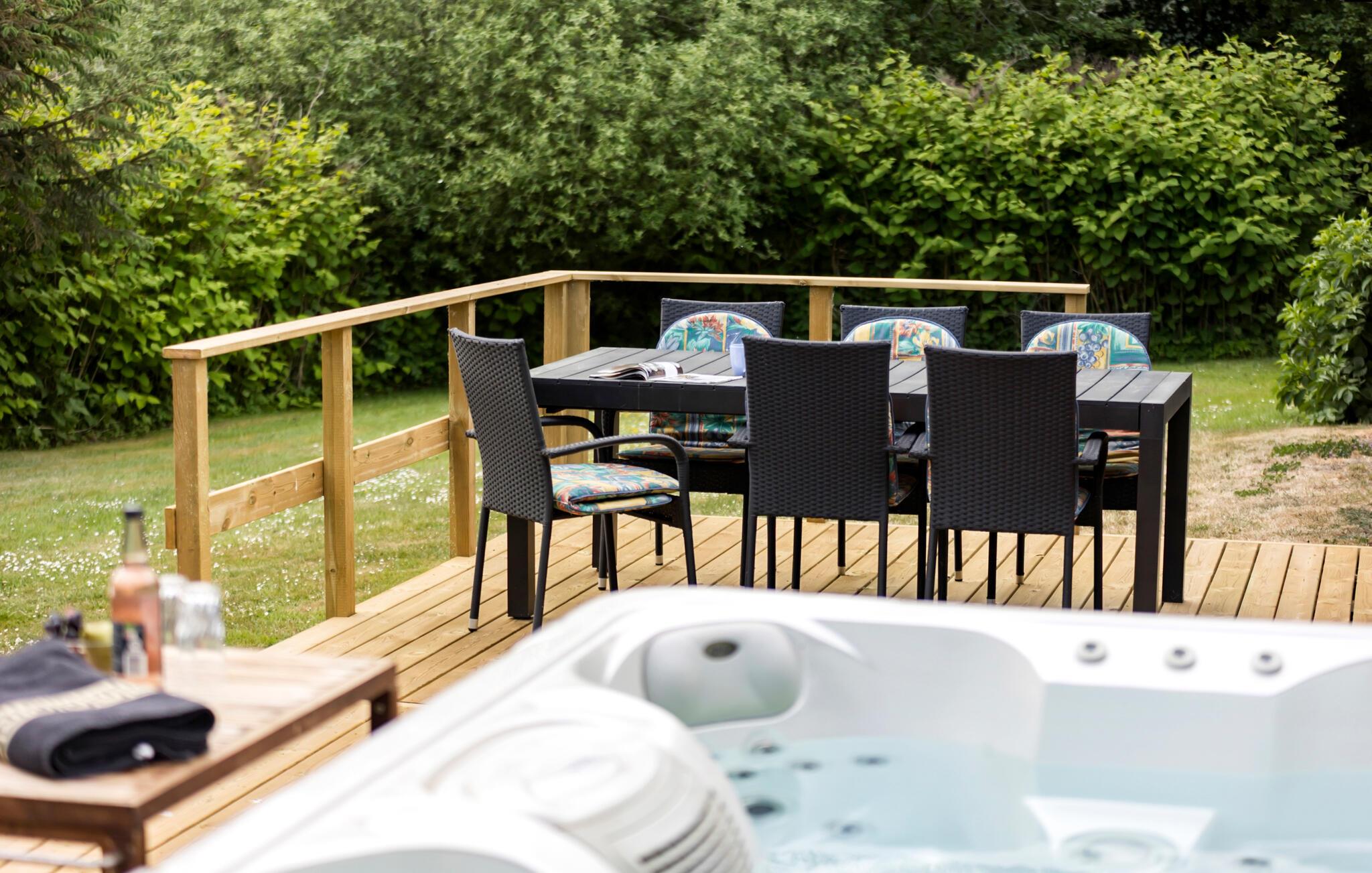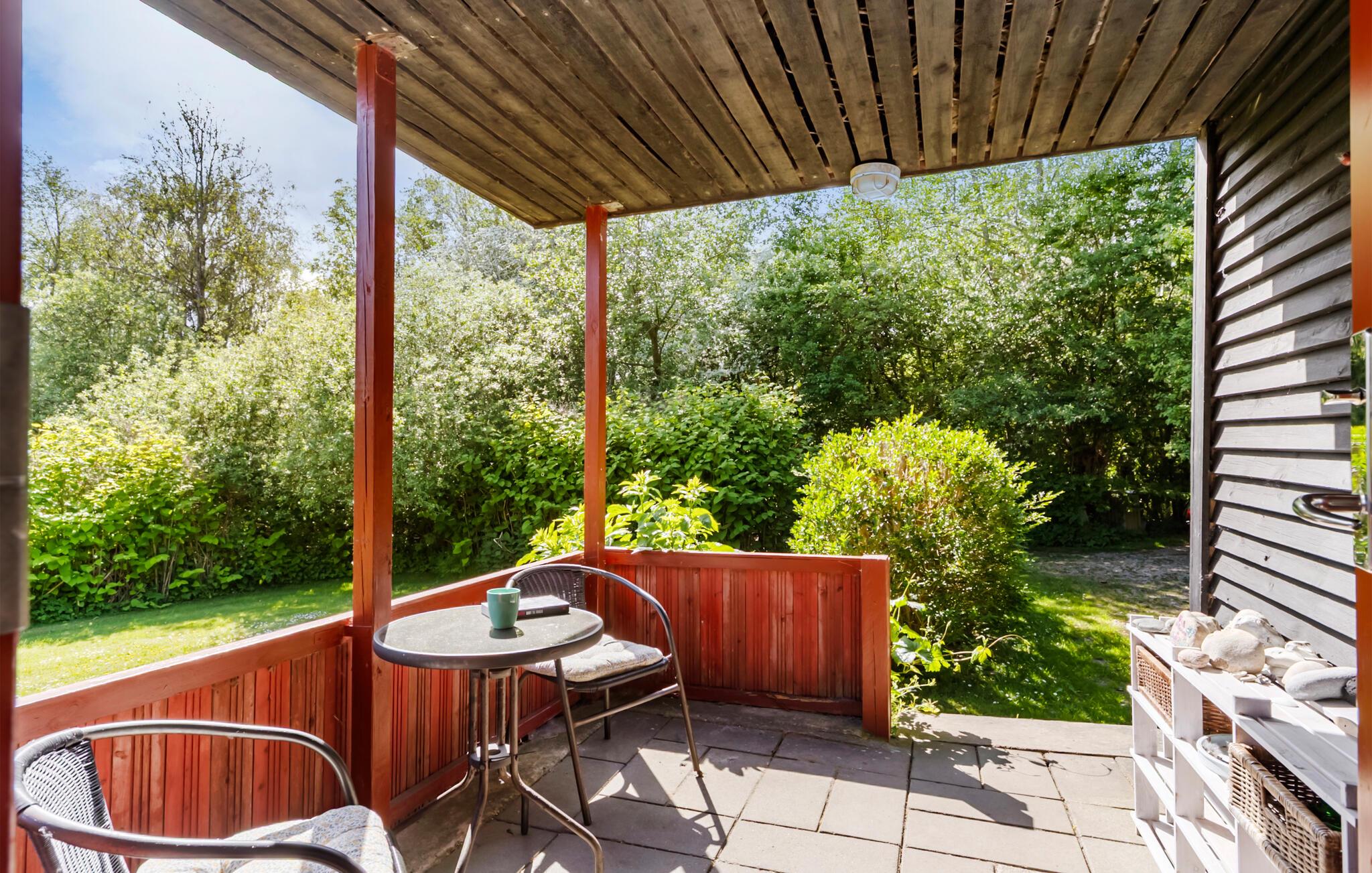 Udnyt udendørsområdet til afslappende timer i den friske luft. Slap af i det store udendørs spabad på træterrassen eller nyd dagens måltider ved havebordet. Den lille overdækkede veranda med siddepladser er ideel til en rolig morgenmad eller eftermiddagskaffe. Græsplænen giver plads til at spille spil eller læse udendørs.