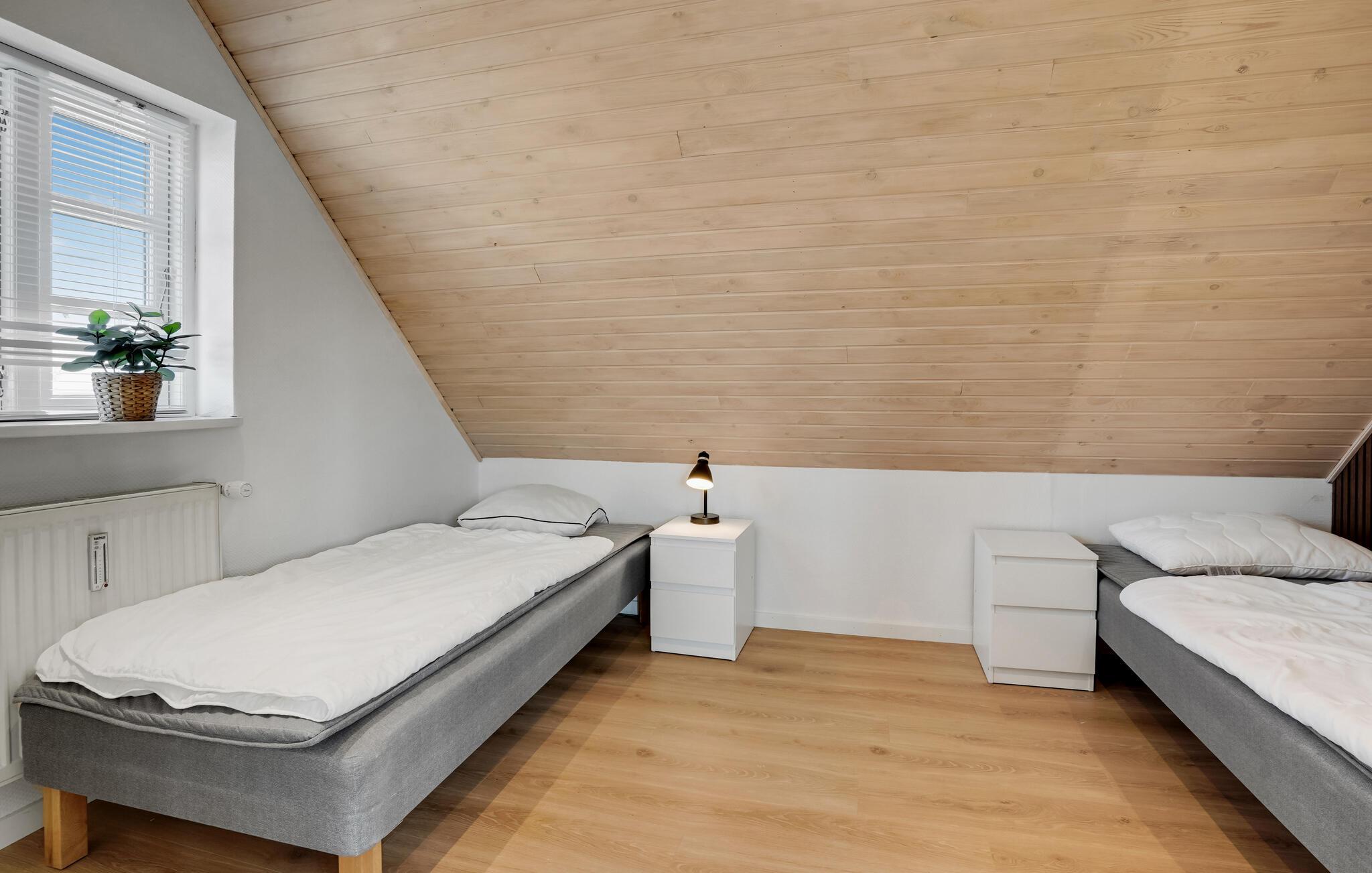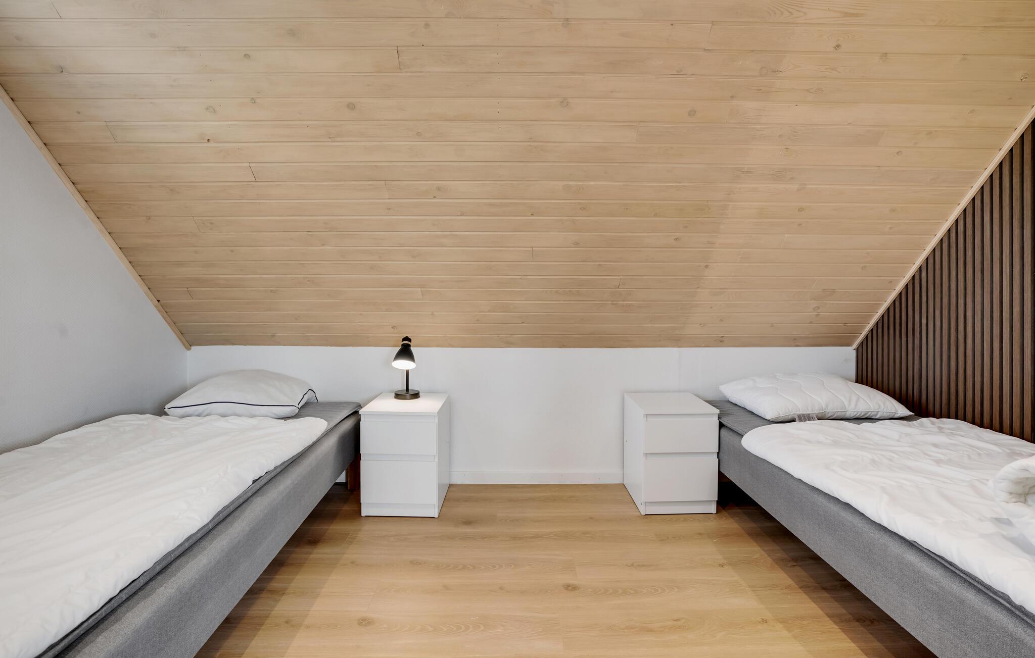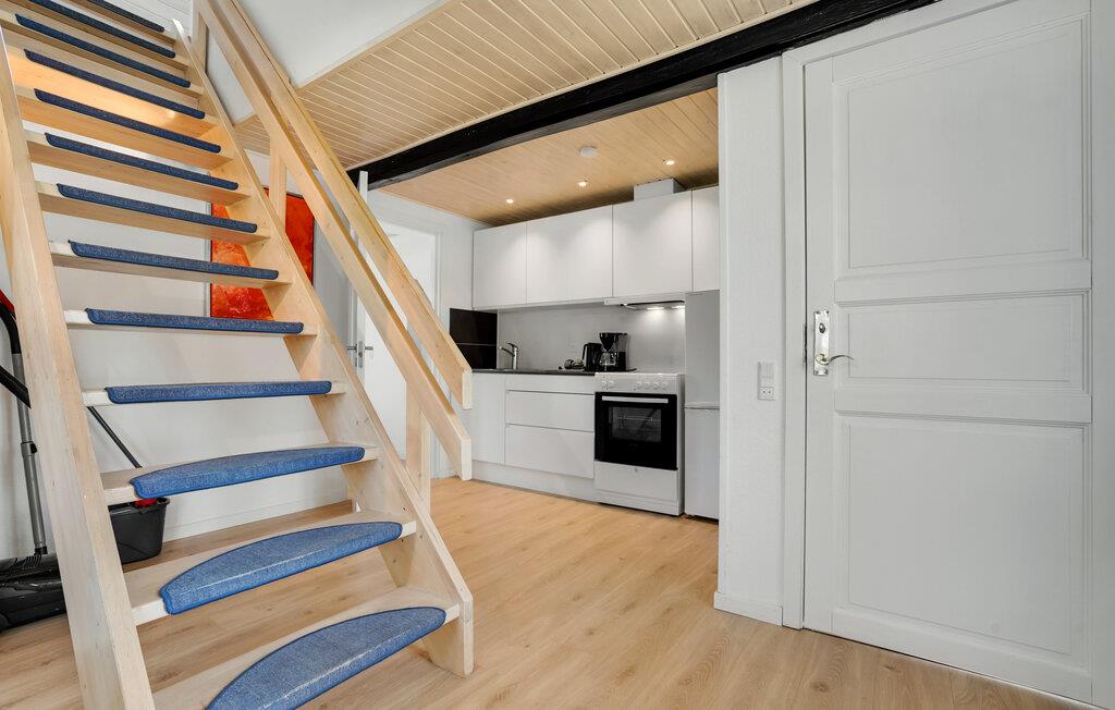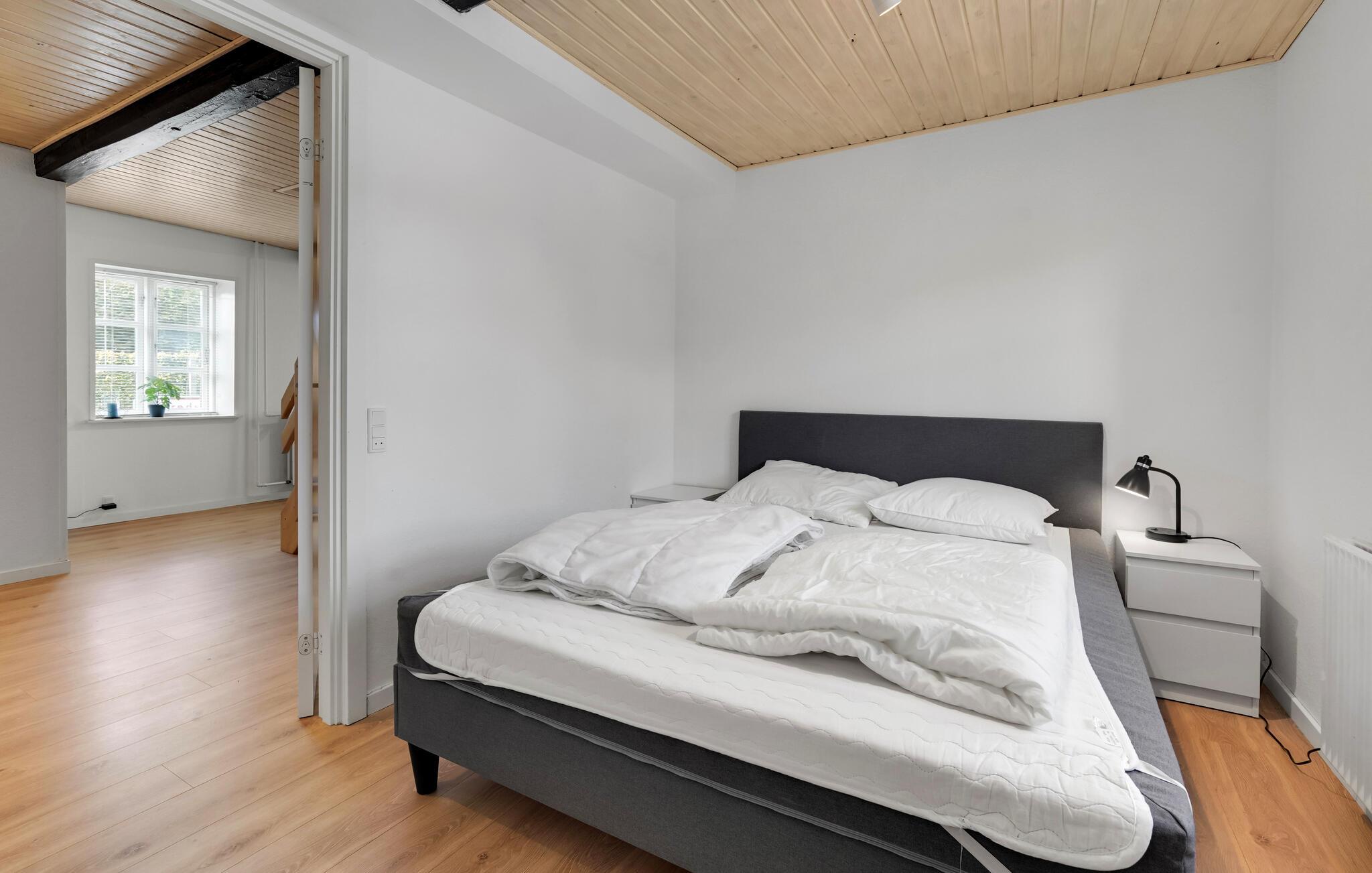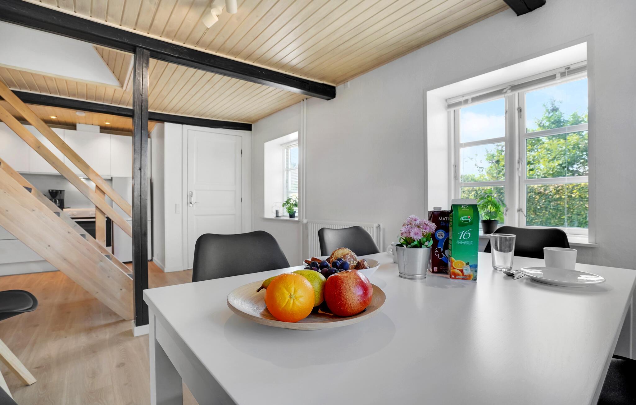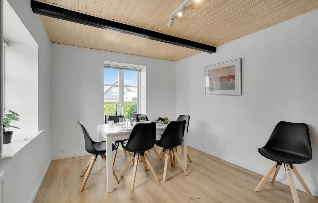 Glæd jer til afslappende ferier i dette familievenlige hus, som giver jer et vidunderligt grundlag for en vellykket ferie. Dette roligt beliggende feriehus er ideelt for alle, der ønsker at lade batterierne op tæt på naturen og kysten. Træd ind i den lyse, moderne møblerede lejlighed med rene linjer og et gennemtænkt rumkoncept. Slap af i den åbne opholdsstue med en komfortabel sofa og et stort tv under det lyse træloft. Udnyt det åbne, moderne køkken og find sammen omkring spisebordet til fælles måltider eller en spilleaften.