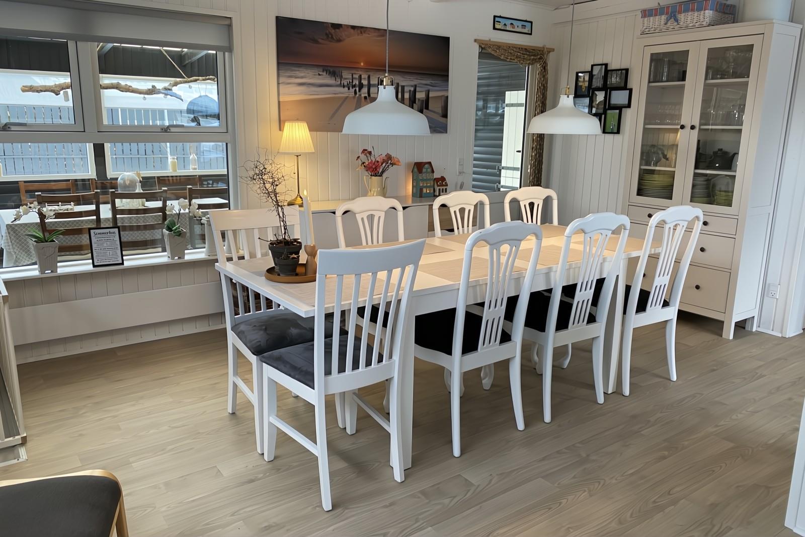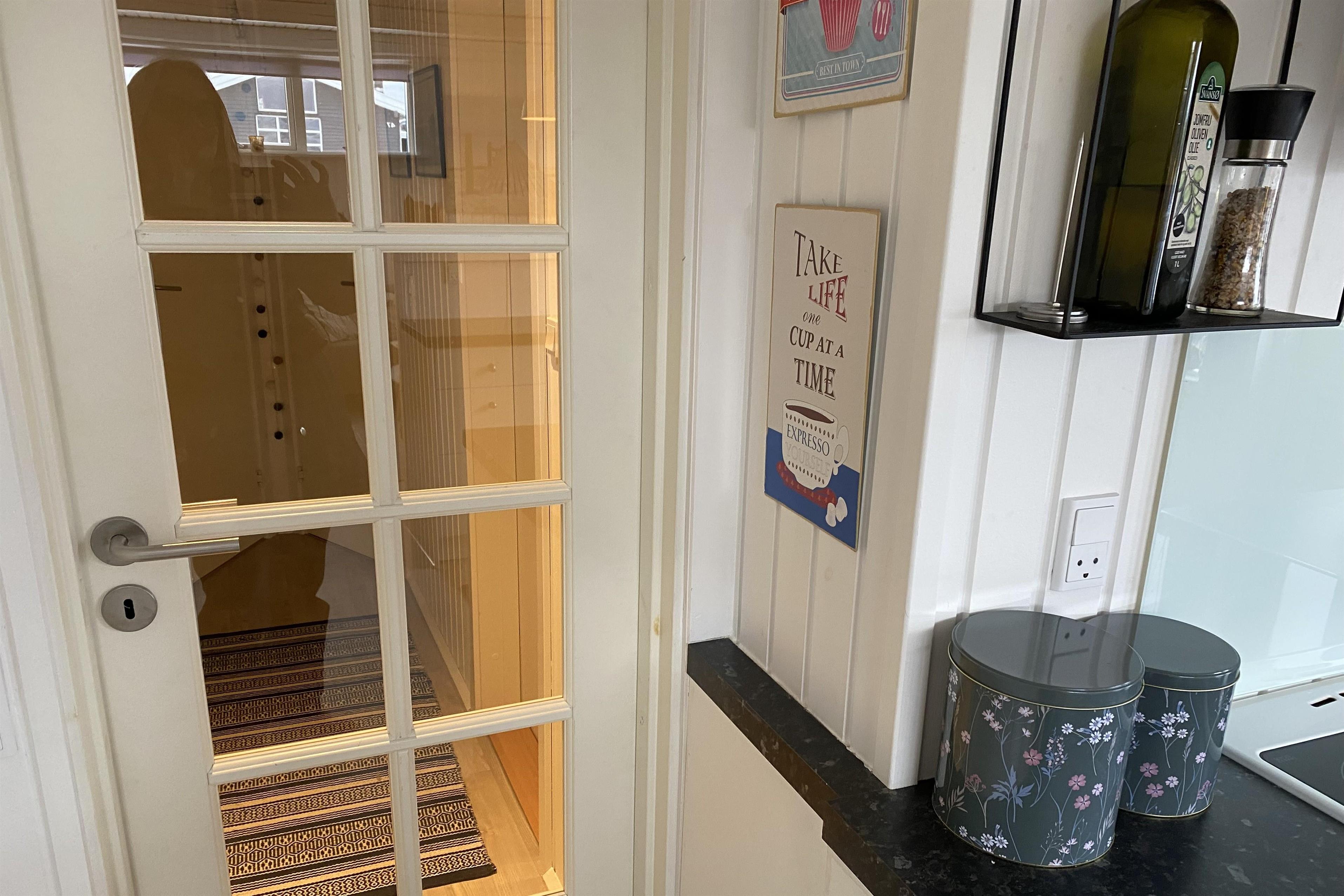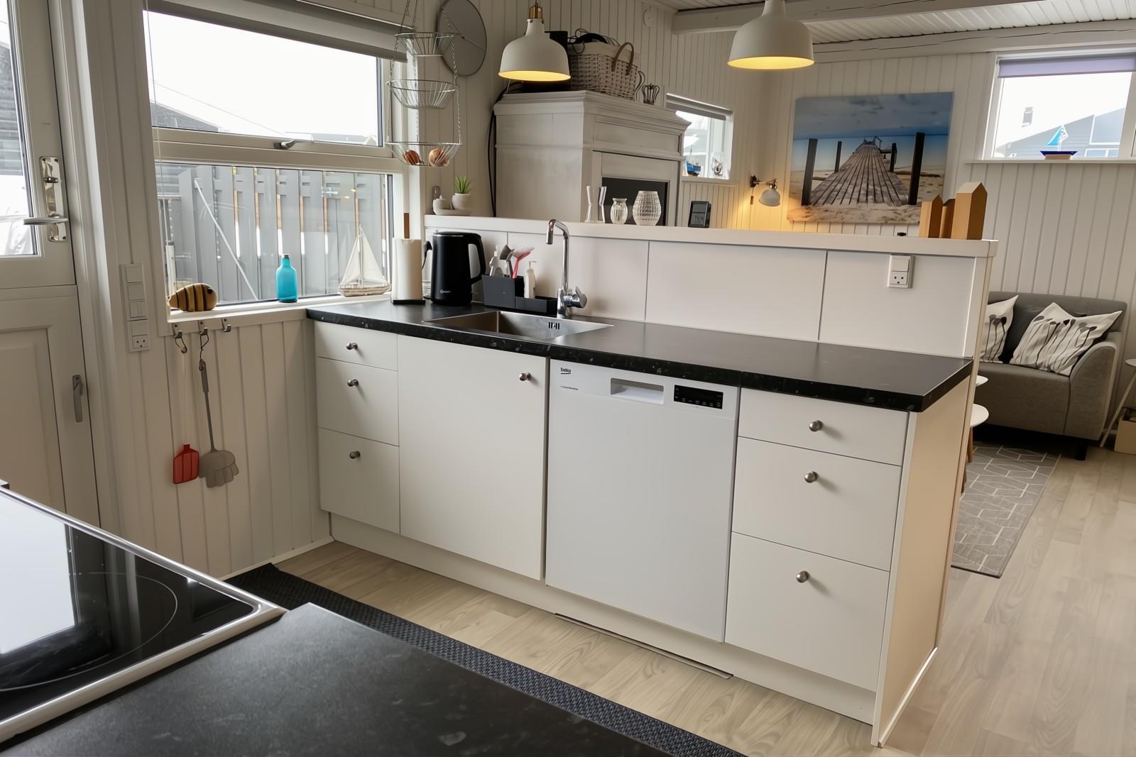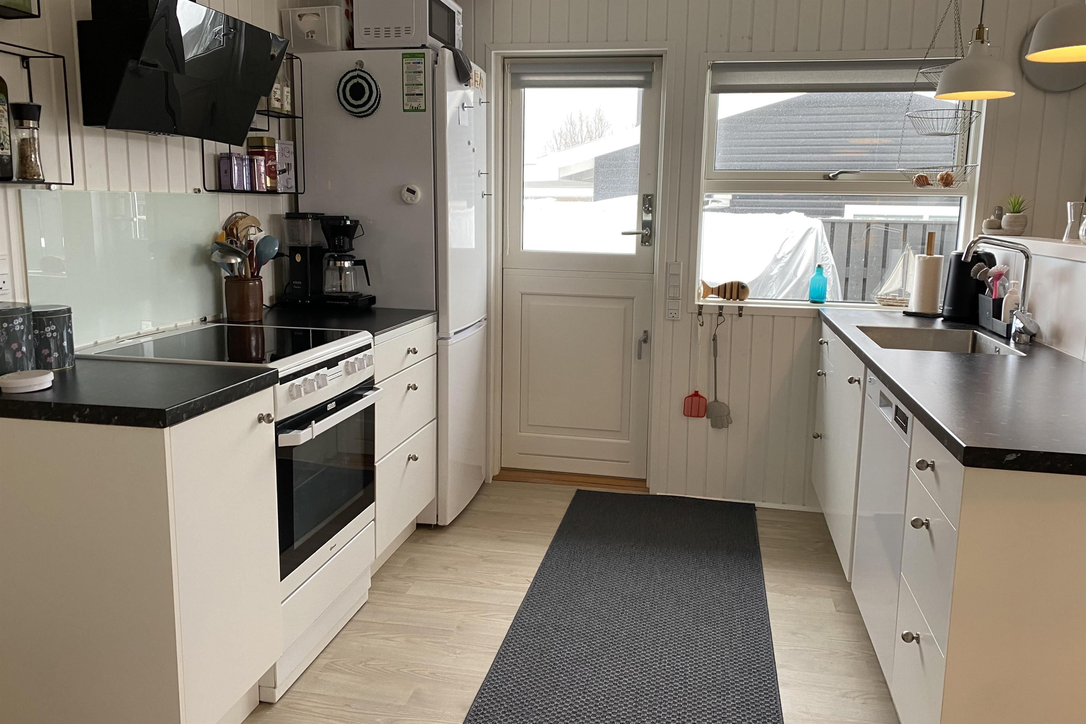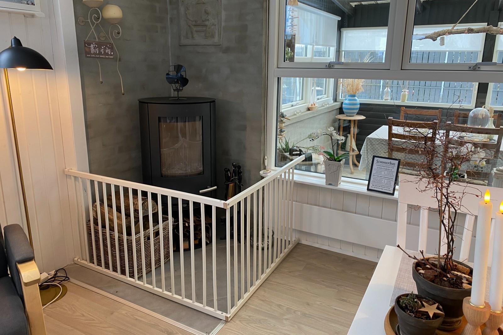 Husets hjerte er det hyggelige opholdsrum med åbent køkken. Her skaber brændeovnen en varm og stemningsfuld atmosfære på køligere dage. Fra opholdsrummet er der udgang til en hyggelig havestue.