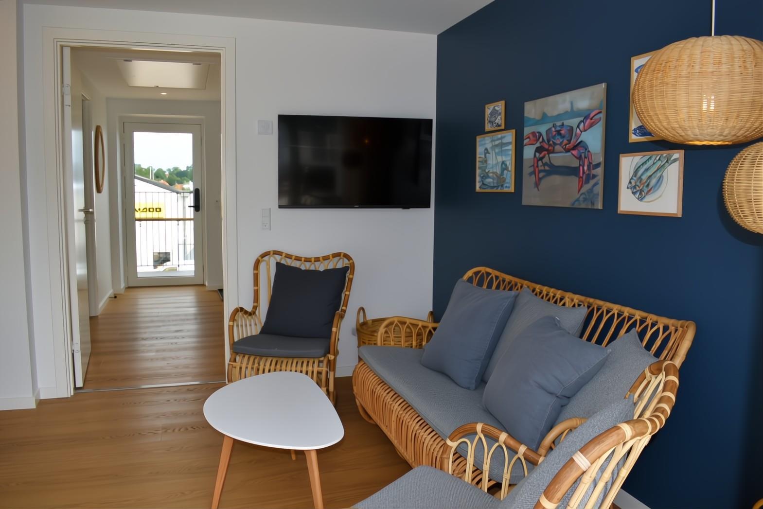 Nyopført og moderne ferielejlighed beliggende ved Kerteminde Havneferie. Lejligheden strækker sig over både 1. og 2. sal og er indrettet med fokus på komfort og kvalitet. På 1. sal finder du en lys stue med smart-TV (kun streaming), et veludstyret køkken, et badeværelse med gulvvarme samt et soveværelse med 1 enkeltseng. På 2. sal er der endnu et badeværelse med gulvvarme samt to soveværelser med en dobbeltseng i hver.