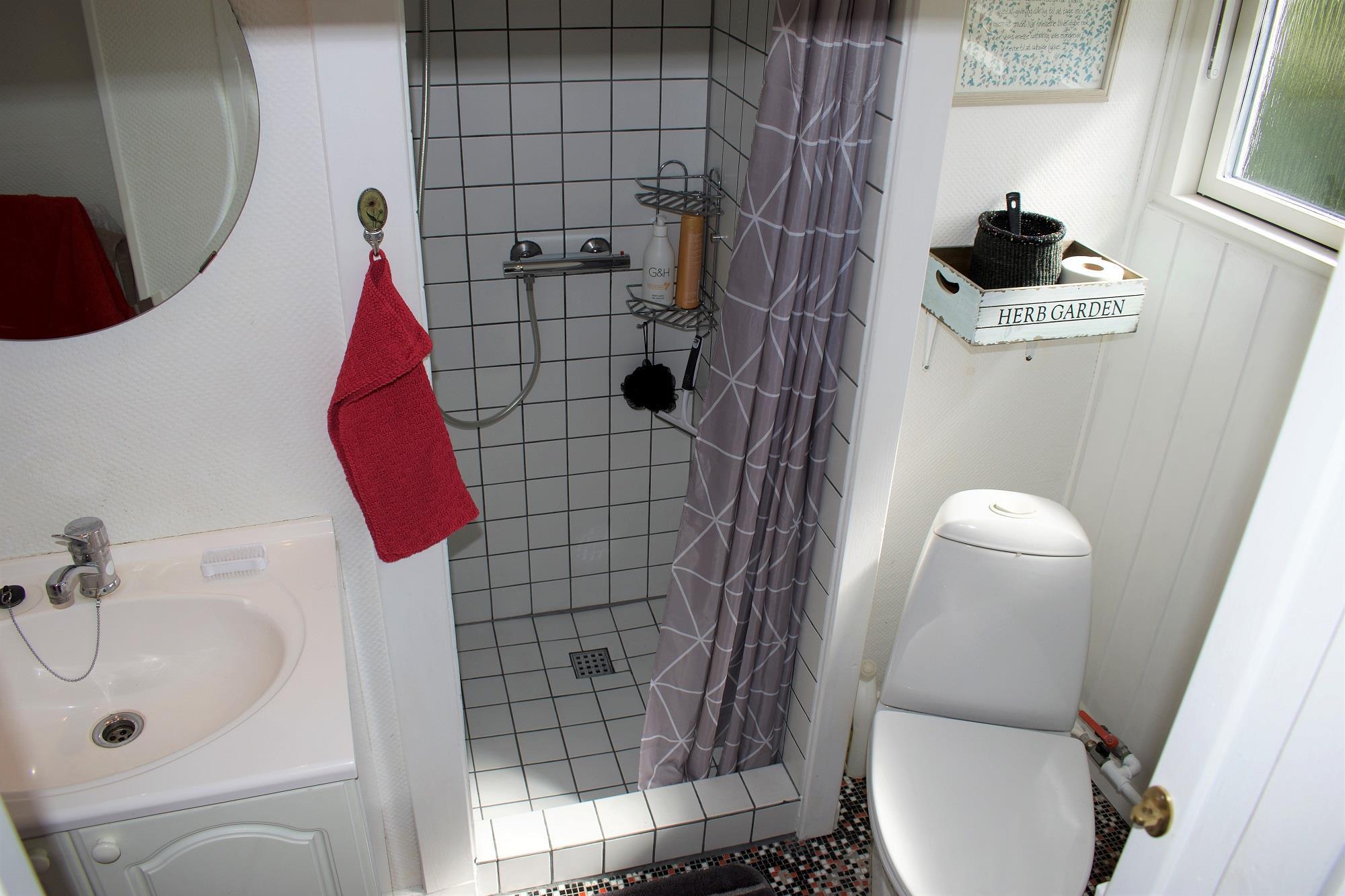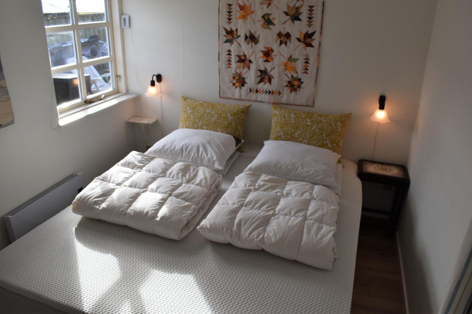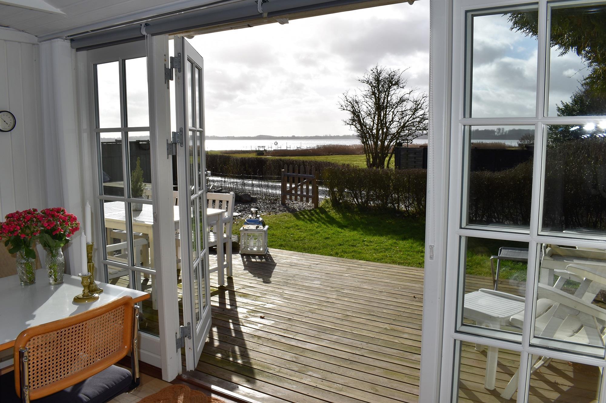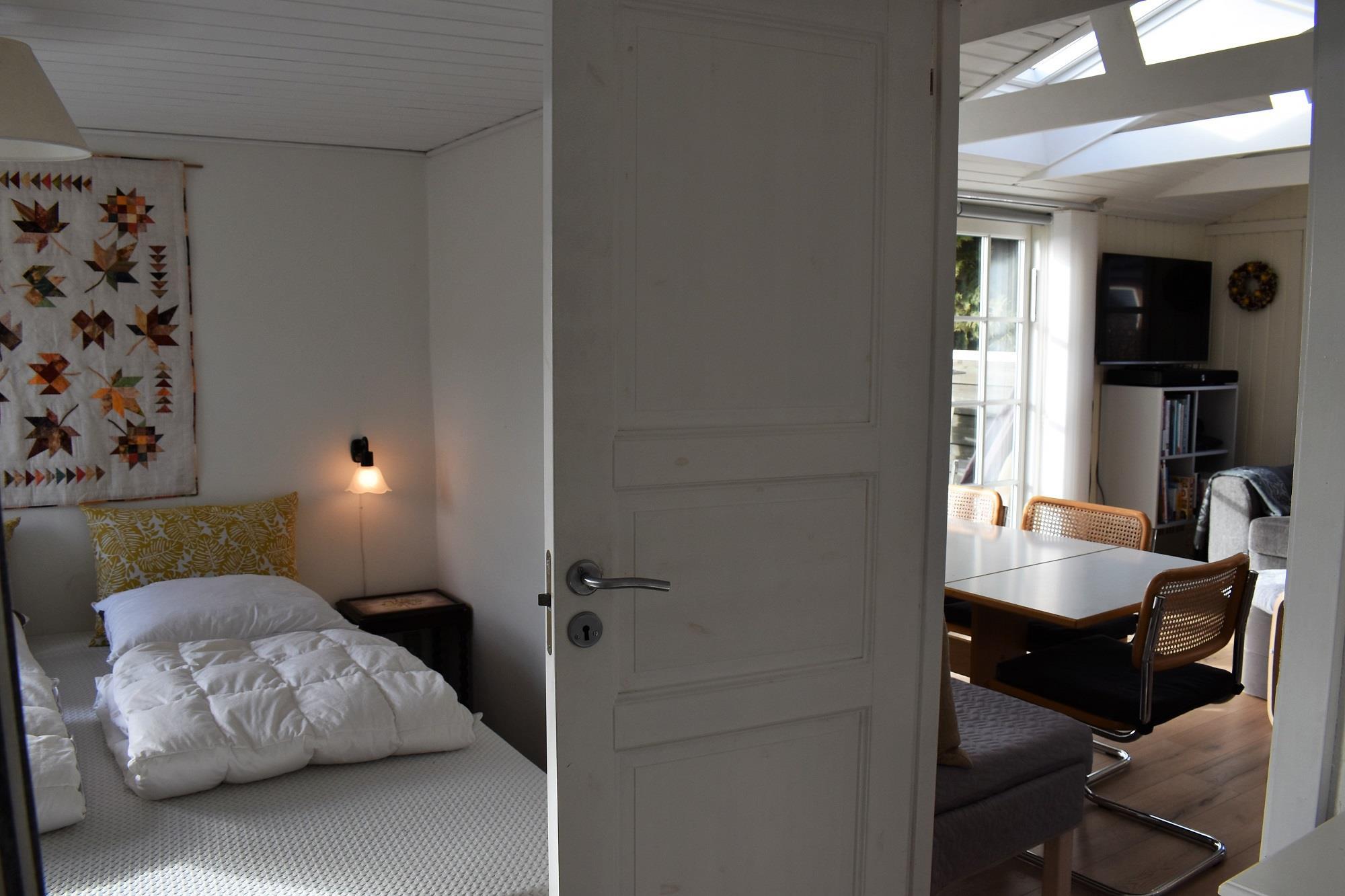 Soveværelset har en komfortabel dobbeltseng og direkte adgang til badeværelset, som nås gennem soveværelset. Fra stuen har du adgang til en stor, sydvendt træterrasse, perfekt til at opleve de smukke solopgange over fjorden. Grunden er helt lukket, så din hund kan boltre sig frit.