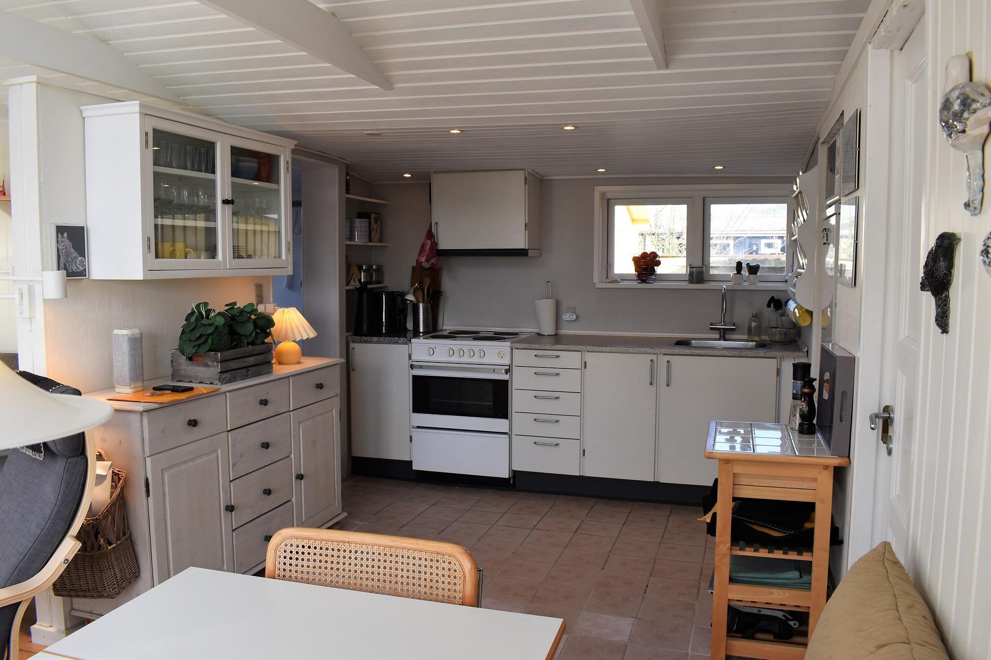 Selvom sommerhuset ikke er helt moderne og kun delvist renoveret med nye vinduer og gulve, emmer det af charme og hygge. Vær opmærksom på, at loftshøjden er lavere i nogle områder; i køkken, soveværelse og badeværelse er den 185 cm, mens den i brusekabinen er 175 cm. I spise- og opholdsstuen giver loft til kip, synlige bjælker og ovenlysvindue et smukt lys og en åben atmosfære.
