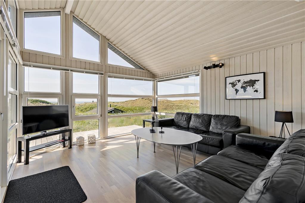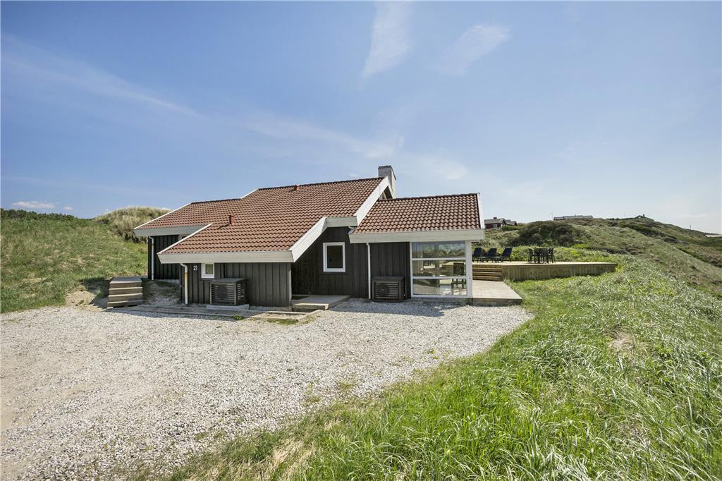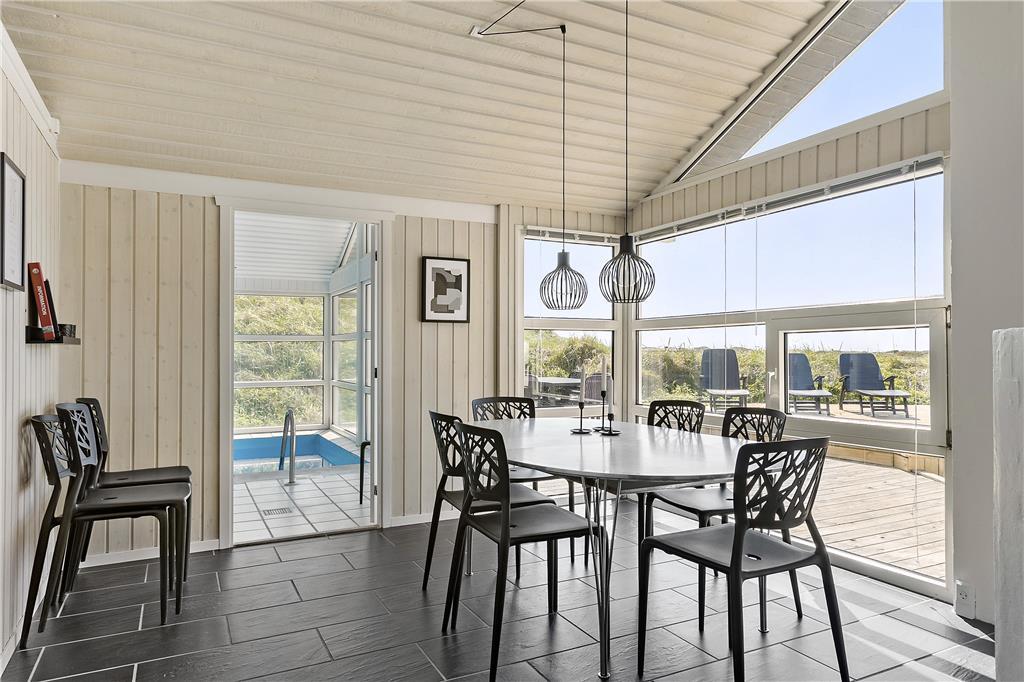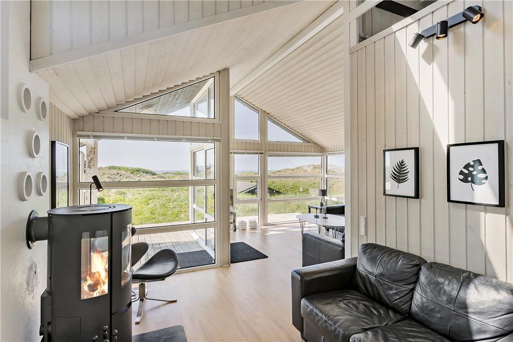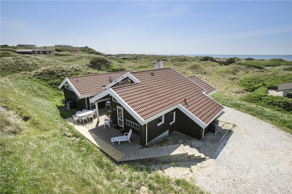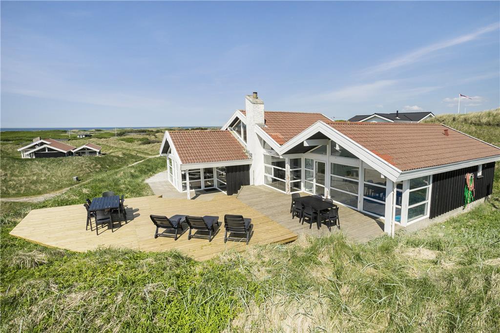 Dette flotte sommerhus ligger højt oppe. Man kommer til indgangen ad en stejl opkørsel, til gengæld kan man fra både grunden og huset nyde udsigten over klitter og Vesterhav. Her er 10 sengepladser fordelt på fire værelser, og to badeværelser, så er man en stor eller to mindre familier, kan man sagtens være her sammen. Sommerhuset er bygget i forskudte plan, køkken og spiseafdeling ligger nogle trin oppe i forhold til stuen, som har en flot brændeovn, tv og mulighed for at slappe af i sofaerne. I forlængelse af spisehjørnet finder man poolafdelingen, og med vaskemaskine og tørretumbler kan man være sikker på altid at have rene og tørre håndklæder til alle badeturene. Desuden er her adgang til en 1000/1000 Mbit internetforbindelse, så pak gerne tablets og pc ned til de dage, hvor vejret indbyder til indendørs sysler.