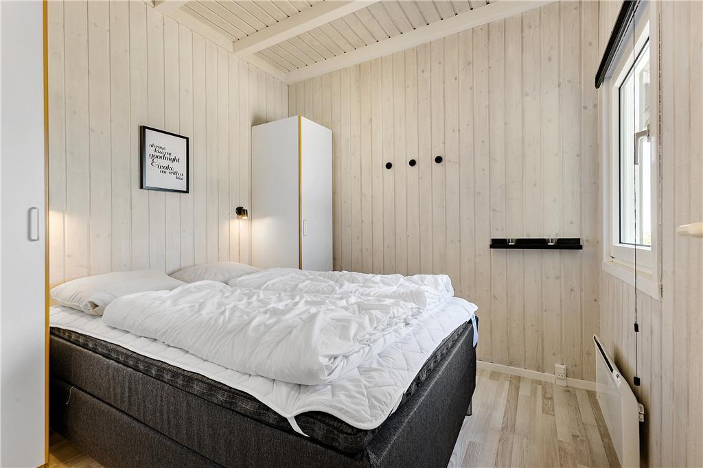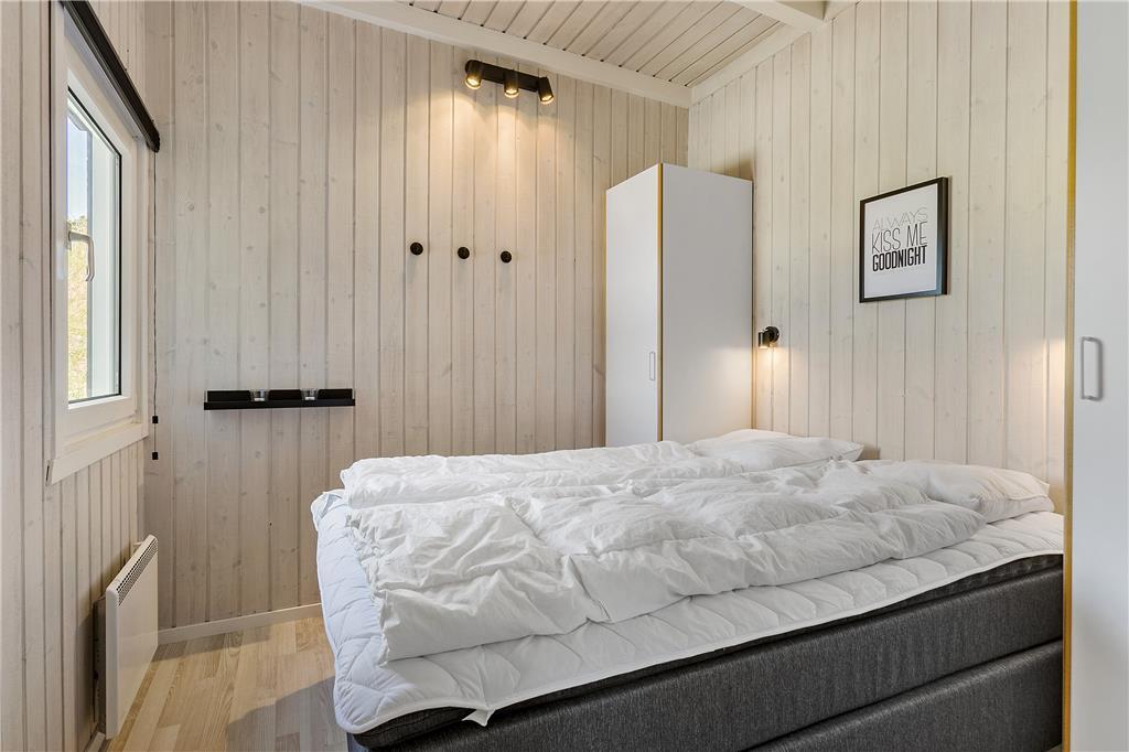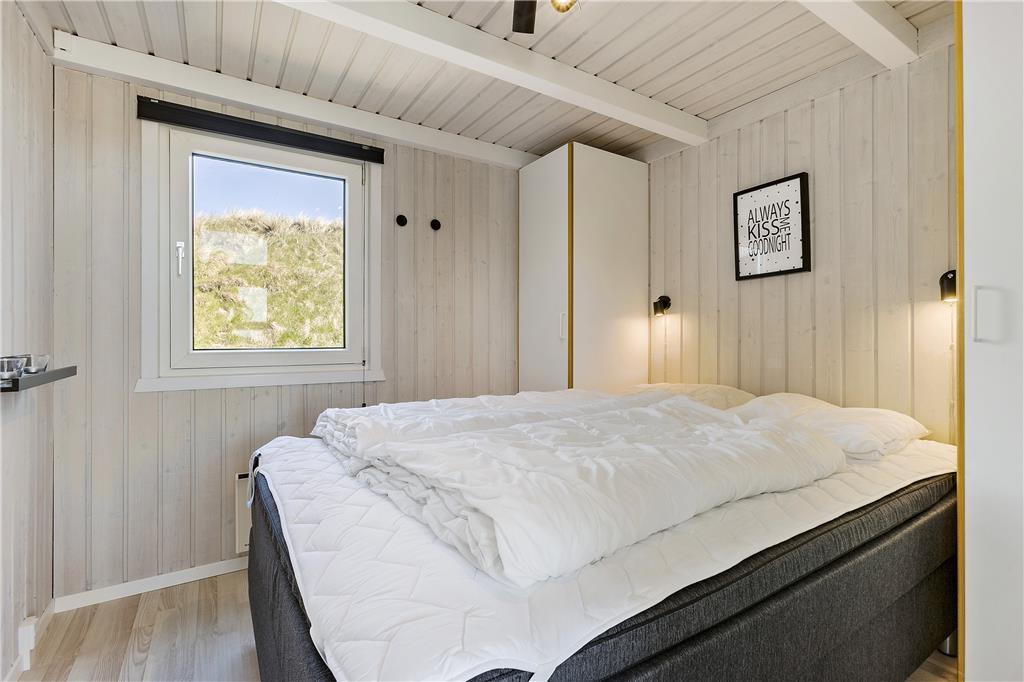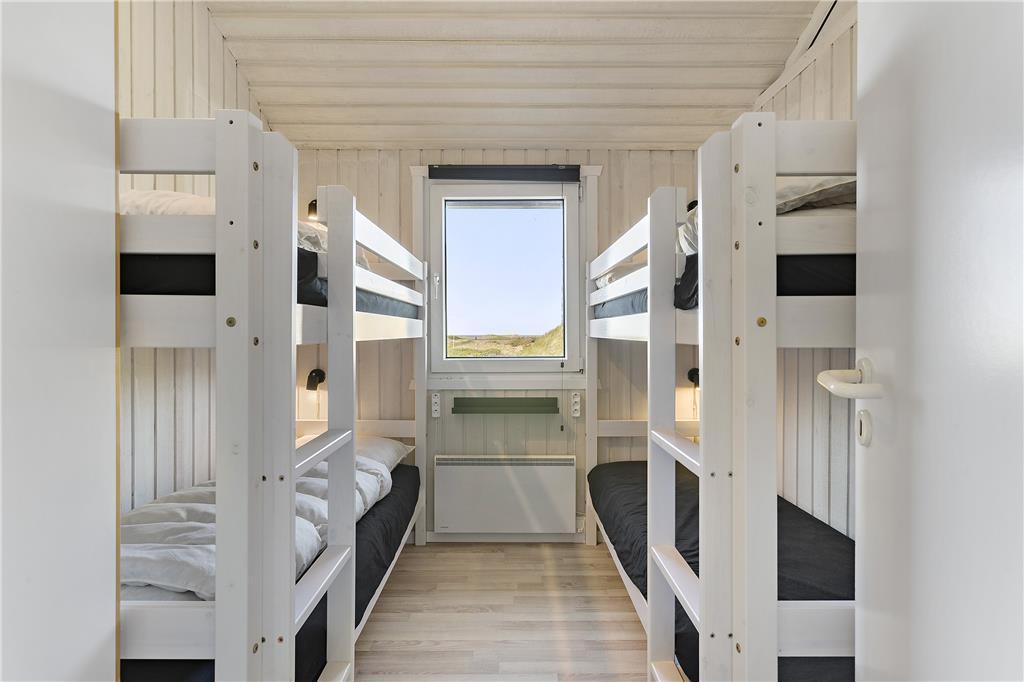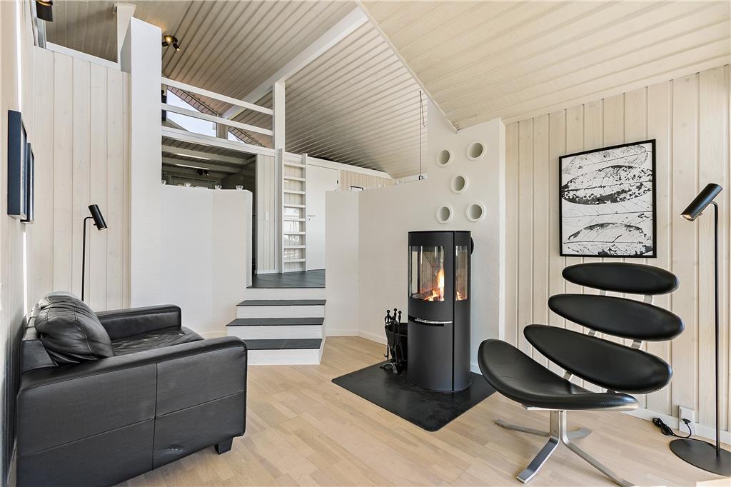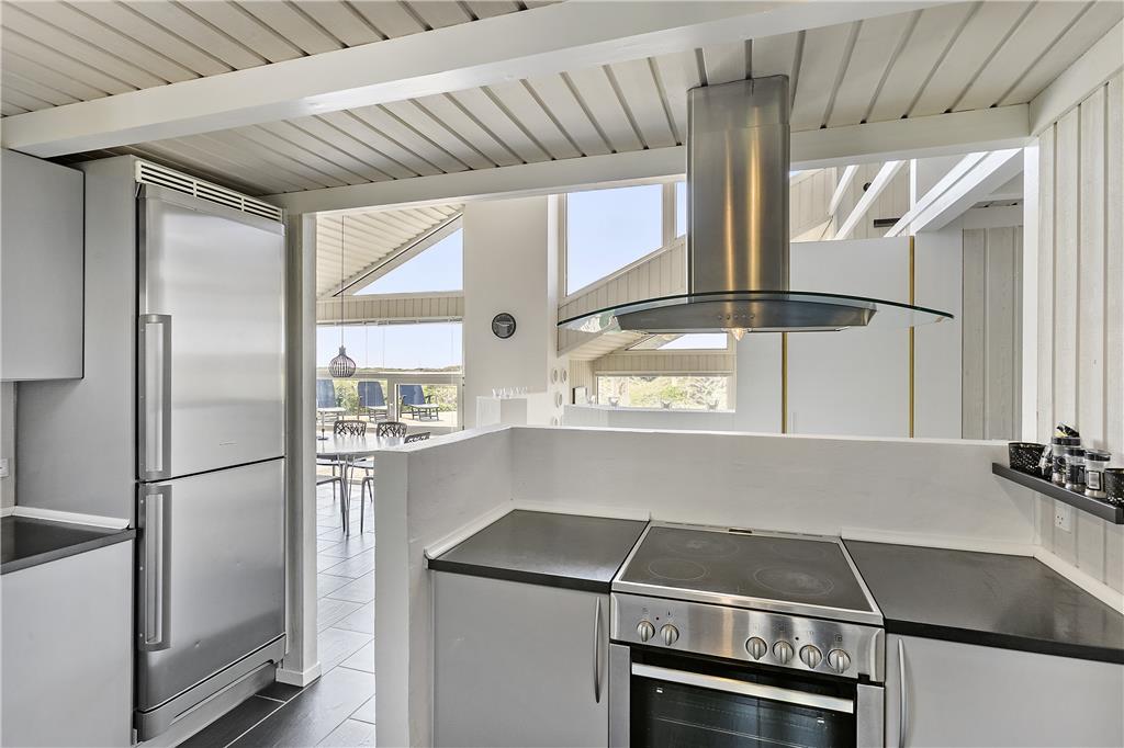 Dette flotte sommerhus ligger højt oppe. Man kommer til indgangen ad en stejl opkørsel, til gengæld kan man fra både grunden og huset nyde udsigten over klitter og Vesterhav. Her er 10 sengepladser fordelt på fire værelser, og to badeværelser, så er man en stor eller to mindre familier, kan man sagtens være her sammen. Sommerhuset er bygget i forskudte plan, køkken og spiseafdeling ligger nogle trin oppe i forhold til stuen, som har en flot brændeovn, tv og mulighed for at slappe af i sofaerne. I forlængelse af spisehjørnet finder man poolafdelingen, og med vaskemaskine og tørretumbler kan man være sikker på altid at have rene og tørre håndklæder til alle badeturene. Desuden er her adgang til en 1000/1000 Mbit internetforbindelse, så pak gerne tablets og pc ned til de dage, hvor vejret indbyder til indendørs sysler.