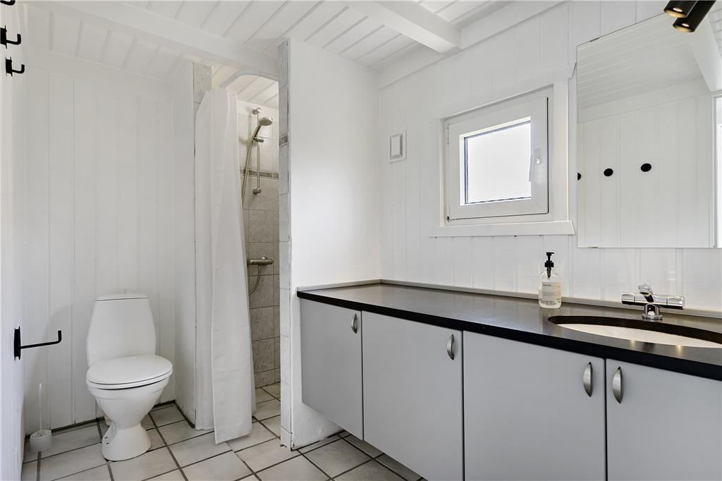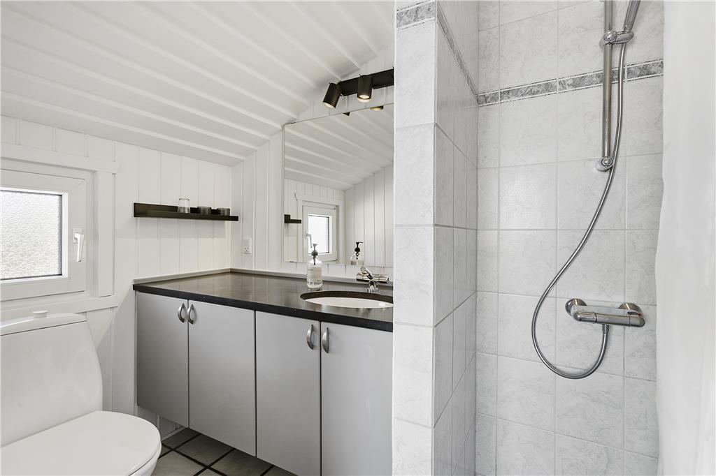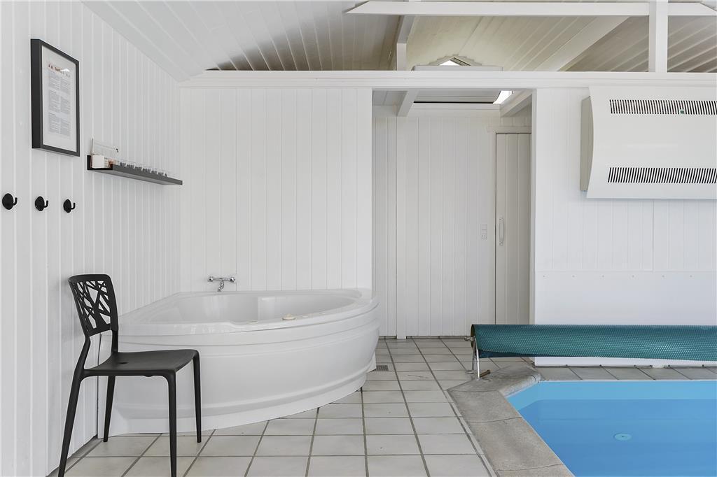 I forlængelse af køkken-spiseafdelingen ligger sommerhusets poolafdeling, hvor store og små kan bruge timevis på at plaske, svømme og lege. Når trætheden melder sig, er det godt at sætte sig i spabadet eller at få varmen i den tilhørende sauna. Her er også et af husets to badeværelser med bruseniche.