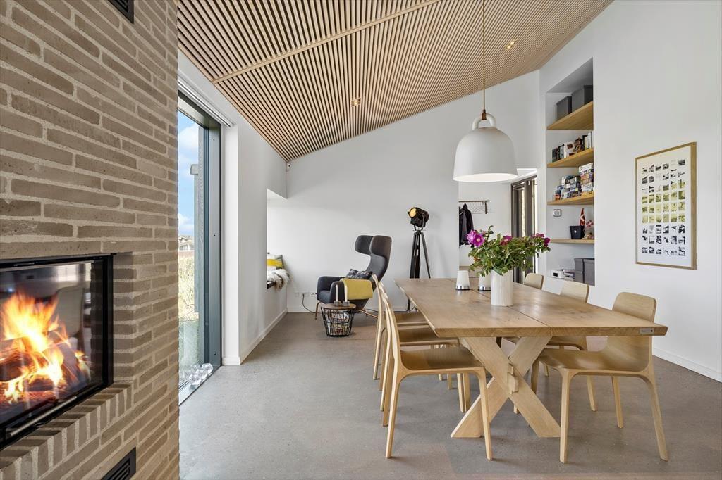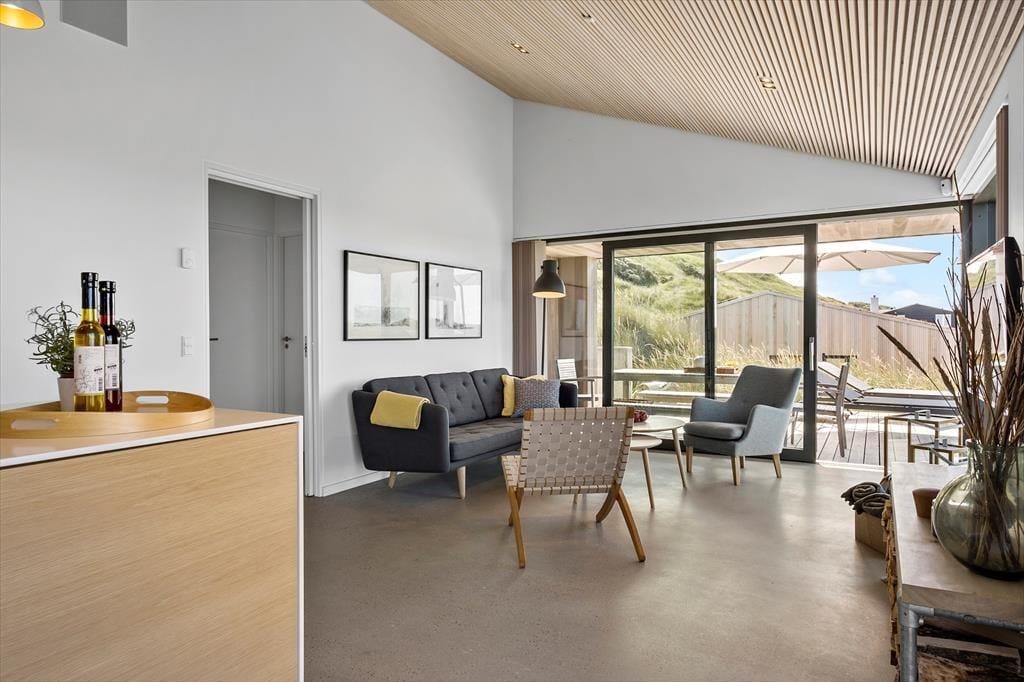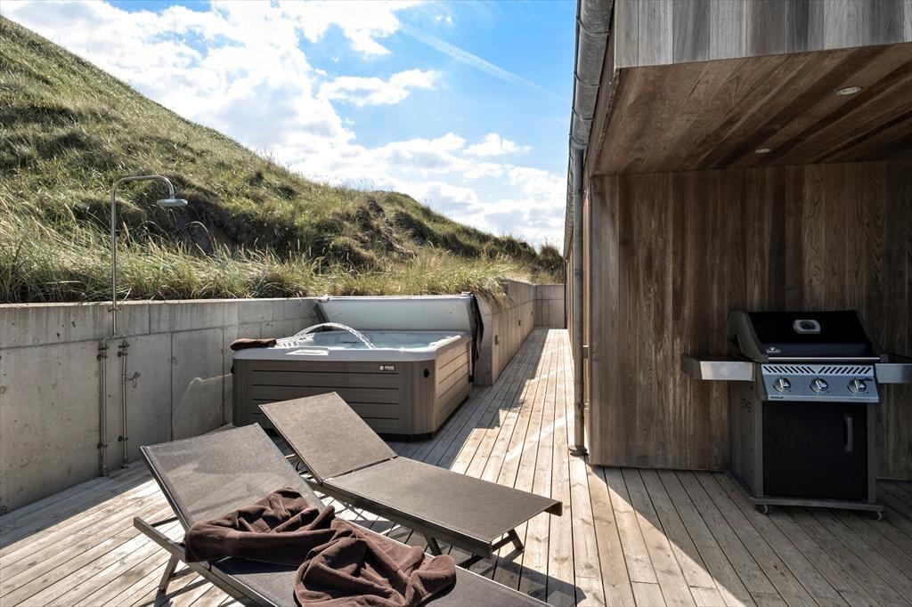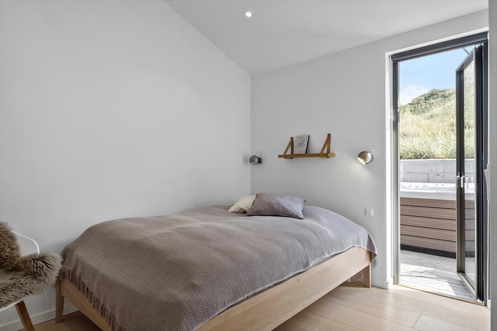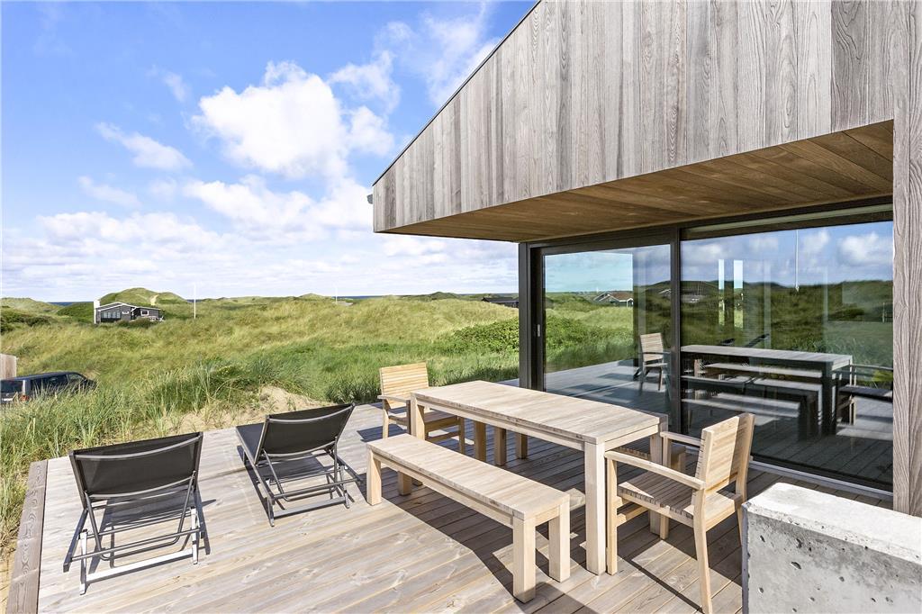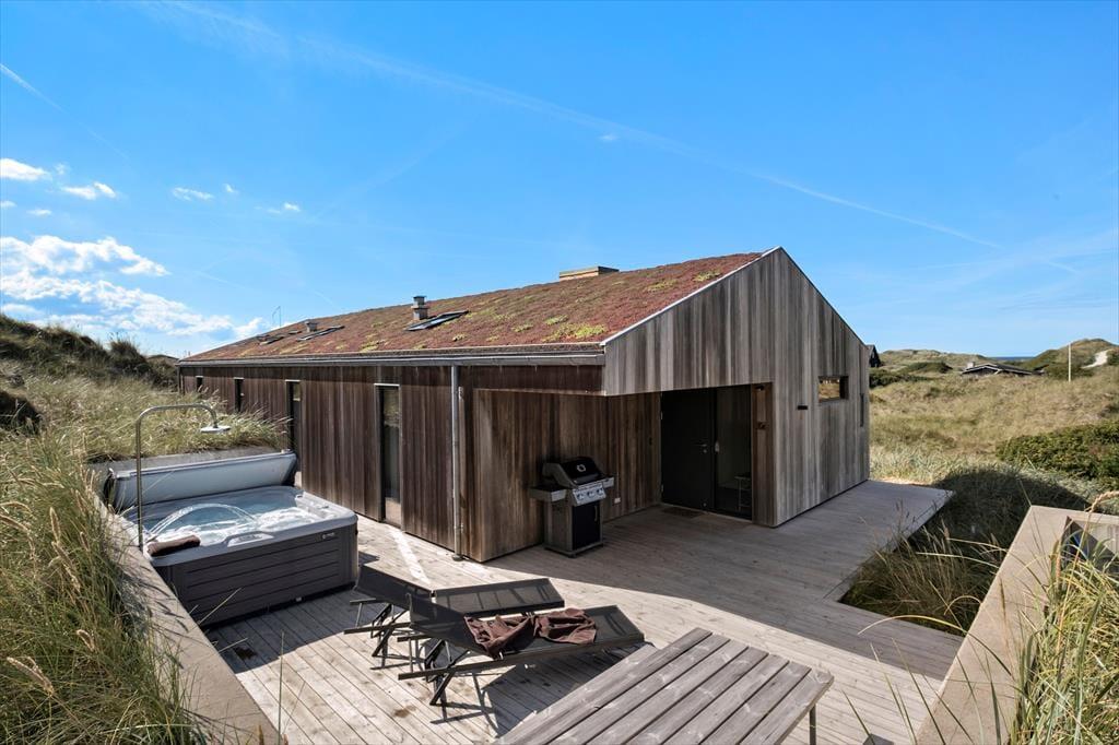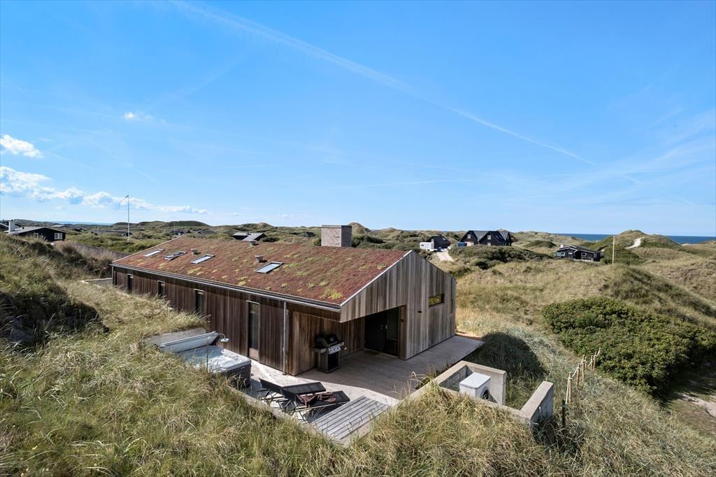 Vi præsenterer her et unikt sommerhus fra 2016:, flot, moderne og i høj kvalitet. Det ligger højt og har derfor en pragtfuld udsigt over de rå klitter og Vesterhavet, der er lige så fascinerende om sommeren som om vinteren. Husets hjerte og samlingssted er det store og åbne køkken-alrum, hvor selve køkkenet ligger i midten med henholdsvis stuen og spisepladsen på hver side; hele rummet har loft til kip og store gulv-til-loft vinduer, som trækker lyset og naturen helt ind i huset og med ild i den indbyggede pejs er hyggen helt i top. Derudover råder huset over to soveafdelinger med hver sit lækre og komfortable badeværelse; i alt otte sovepladser og dermed plads til hele familien, til at lave teenageafdeling eller til at få besøg af familie eller venner undervejs. Alt inventar, alle møbler og samtlige senge er nøje udvalgt, så det passer ind i den enkle, skandinaviske og indbydende stil, som er gennemgående i alle rum. Sommerhuset er desuden fuldt udstyret med moderne hjælpemidler, hårde hvidevarer og tekniske løsninger, bl.a. varmepumpe, vaskemaskine, tørretumbler, parabol og trådløst internet, medbring blot pc eller tablet hjemmefra, så er det nemt at logge på og holde kontakten med kammeraterne derhjemme eller finde oplysninger om områdets mange muligheder.