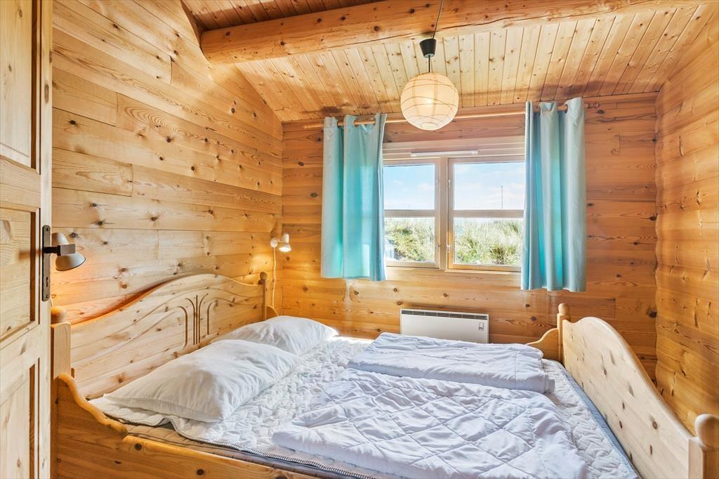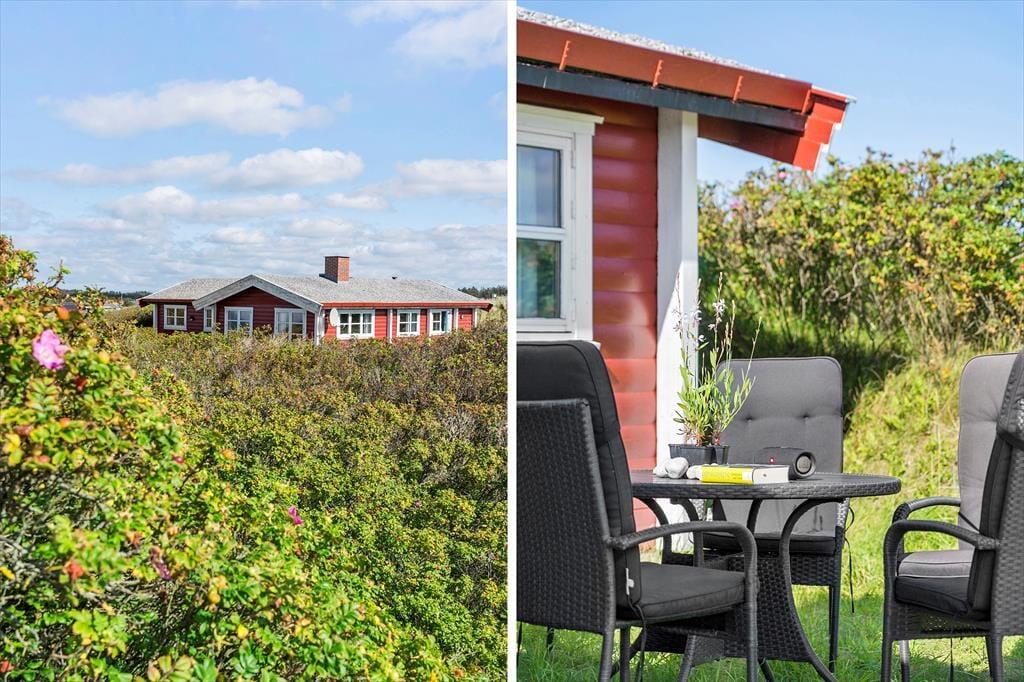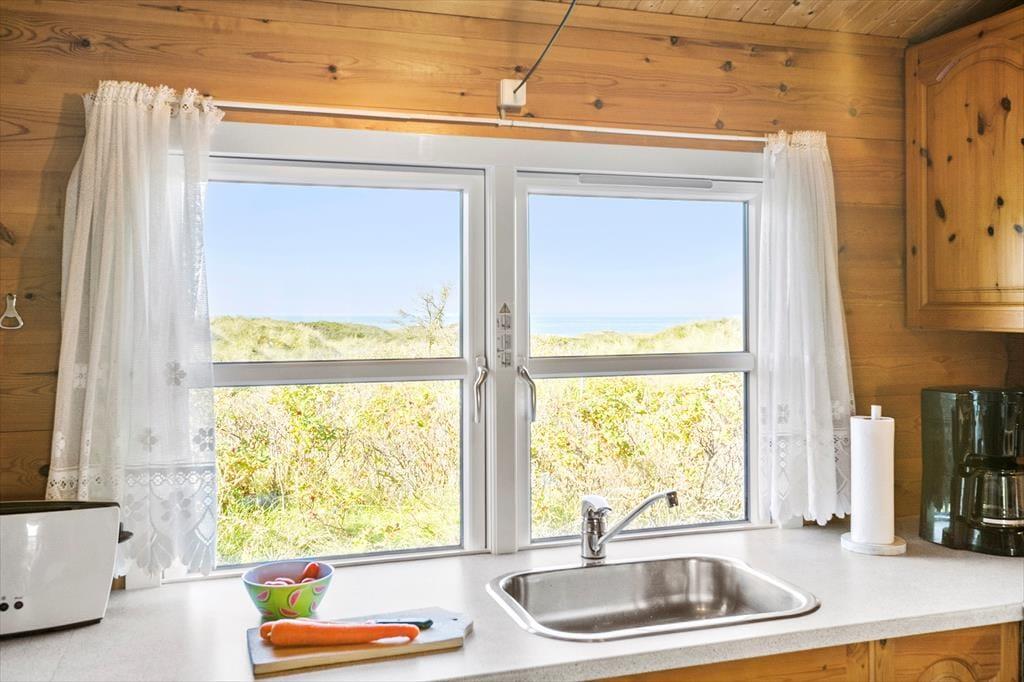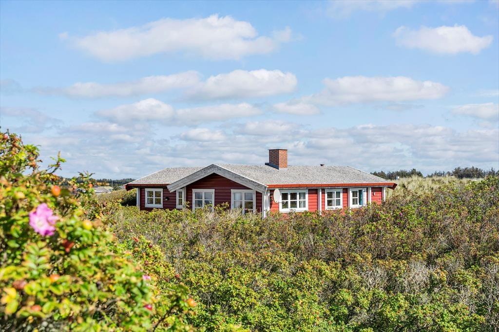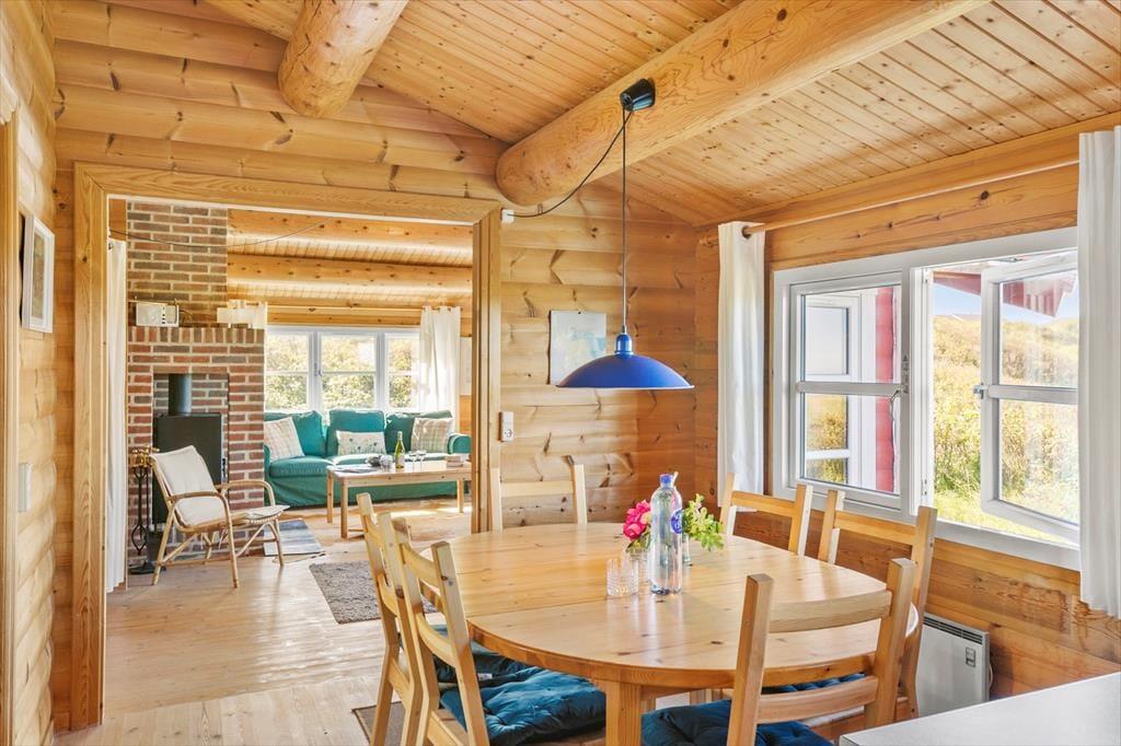 Med en flot udsigt over det kuperede klitlandskab og Vesterhavet, ligger denne velholdte og hyggeligt møblerede bjælkehytte. Køkkenet er rummeligt og ligger i åben forbindelse med spisestuen, hvor familien kan samles om måltiderne. I forlængelse heraf, kommer den hyggelige opholdsstue med behagelige møbler og holder man ferie i de koldere måneder, kan man tænde op i brændeovnen og lade varmen sprede sig og slappe af med en god bog, et spil eller en sjov film som hele familien kan samles om. I husets 90 m2 er der desuden et rummeligt badeværelse med vaskemaskine og sauna og tre værelser med dobbeltsenge. Sommerhuset er godt udstyret med hårde hvidevarer og andre moderne faciliteter som parabol og trådløst internet – et godt valg med god stemning og en varm atmosfære.