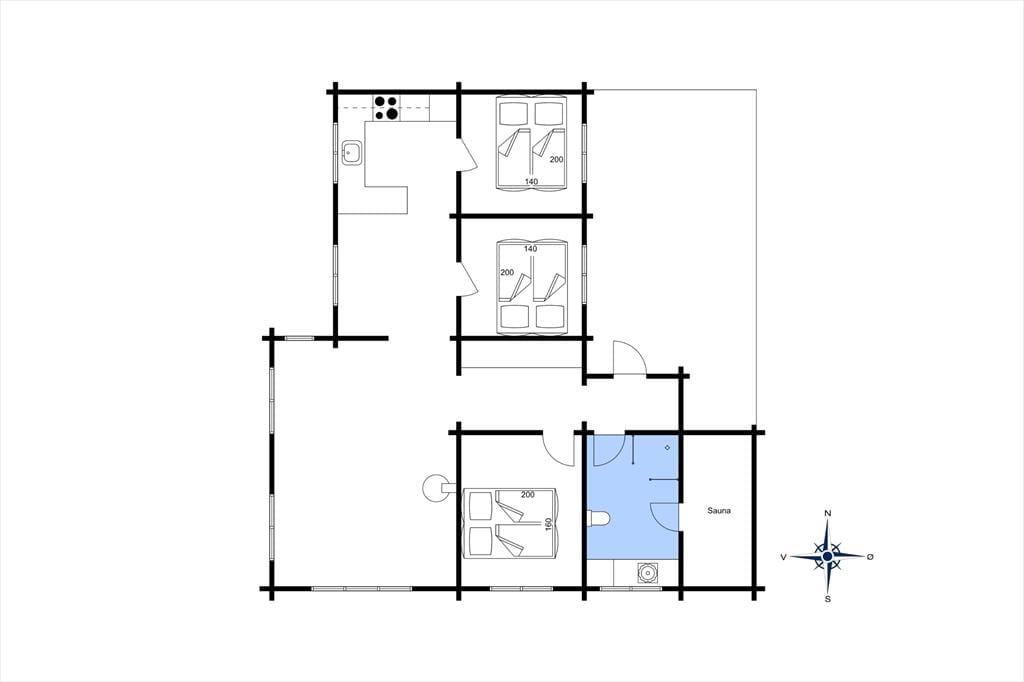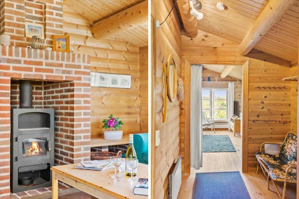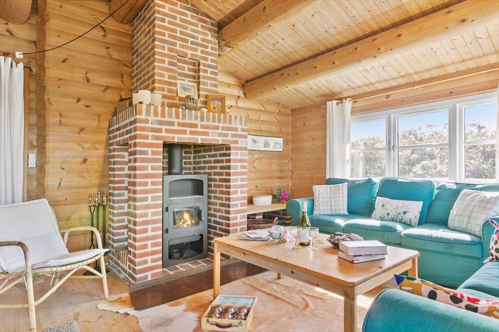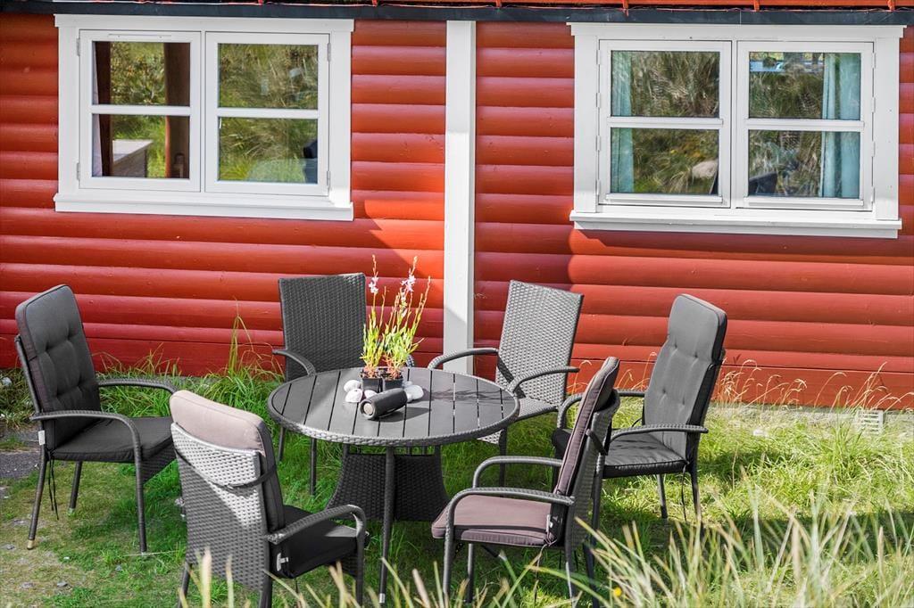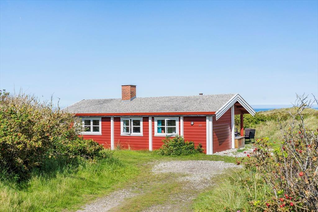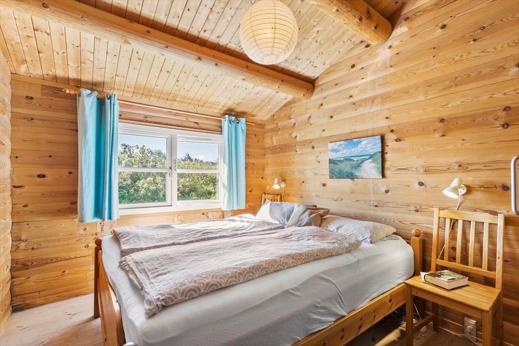 Med en flot udsigt over det kuperede klitlandskab og Vesterhavet, ligger denne velholdte og hyggeligt møblerede bjælkehytte. Køkkenet er rummeligt og ligger i åben forbindelse med spisestuen, hvor familien kan samles om måltiderne. I forlængelse heraf, kommer den hyggelige opholdsstue med behagelige møbler og holder man ferie i de koldere måneder, kan man tænde op i brændeovnen og lade varmen sprede sig og slappe af med en god bog, et spil eller en sjov film som hele familien kan samles om. I husets 90 m2 er der desuden et rummeligt badeværelse med vaskemaskine og sauna og tre værelser med dobbeltsenge. Sommerhuset er godt udstyret med hårde hvidevarer og andre moderne faciliteter som parabol og trådløst internet – et godt valg med god stemning og en varm atmosfære.