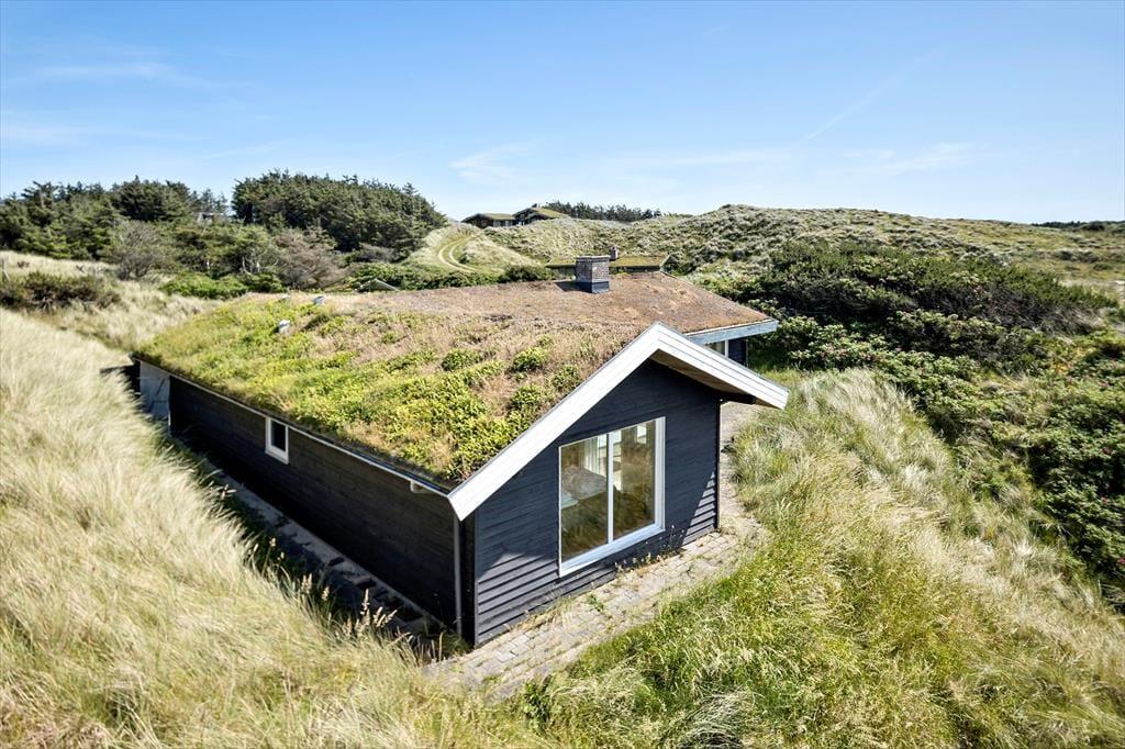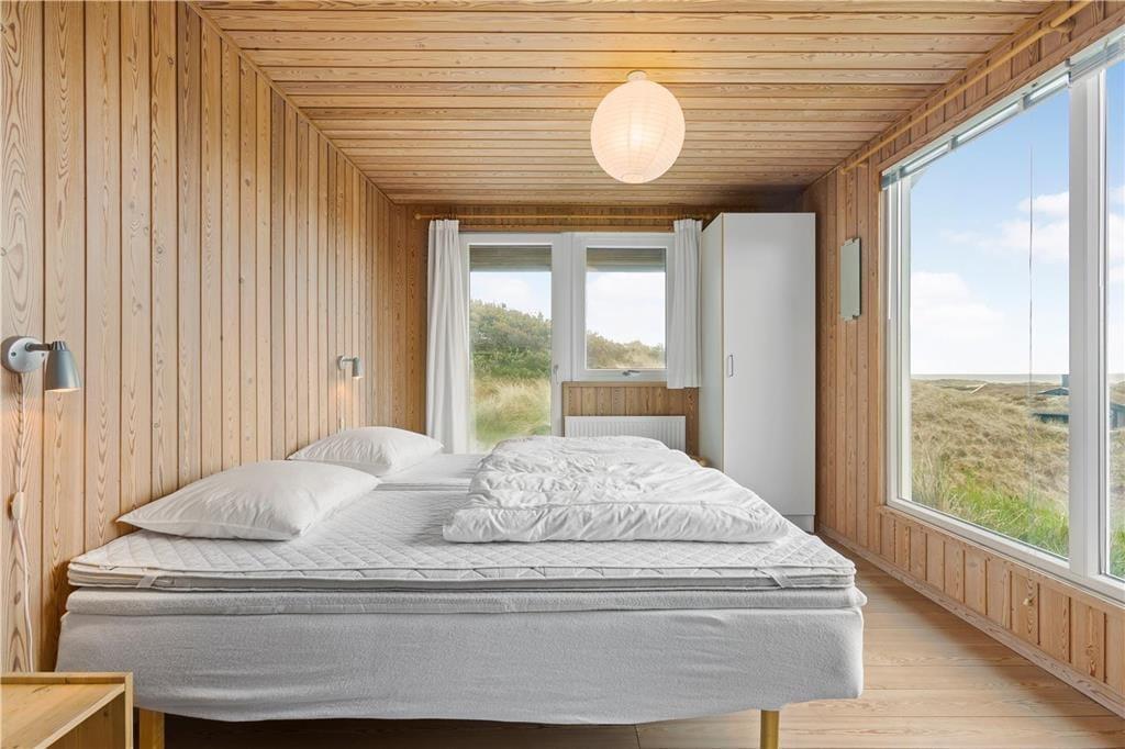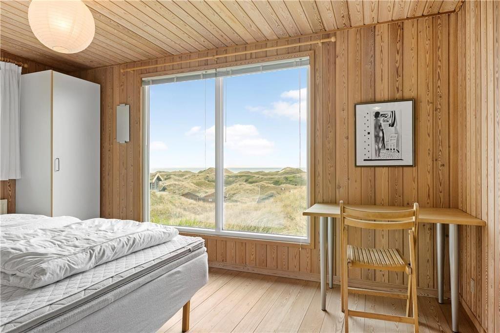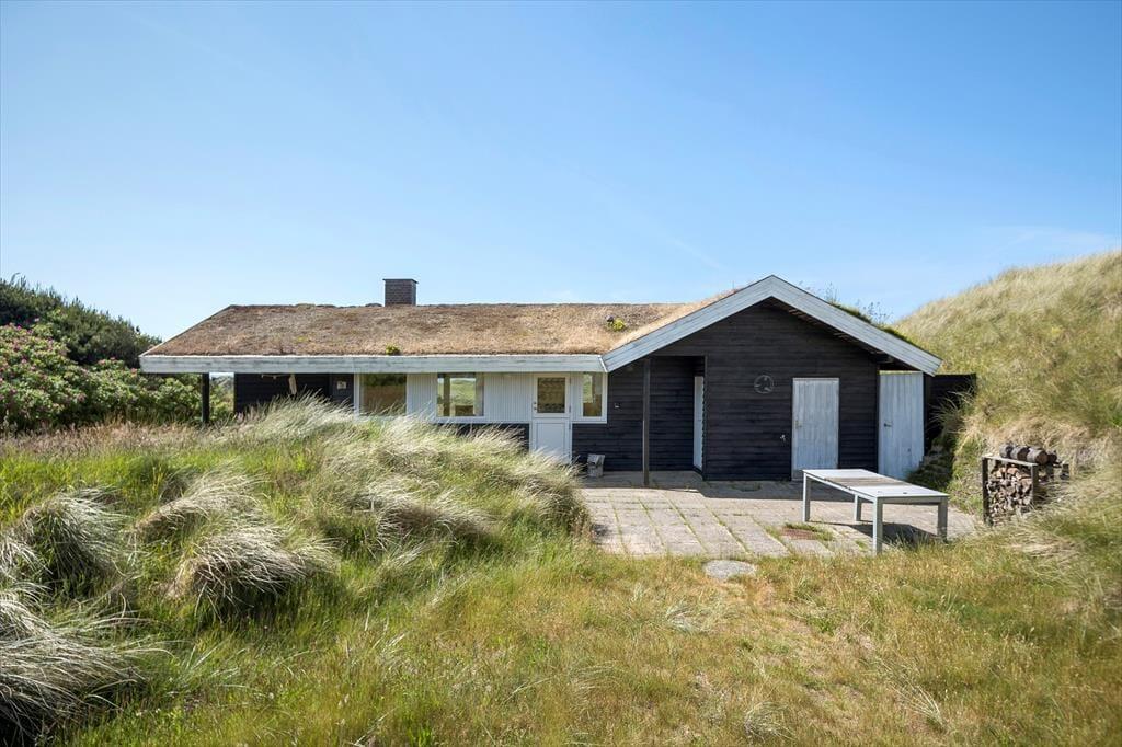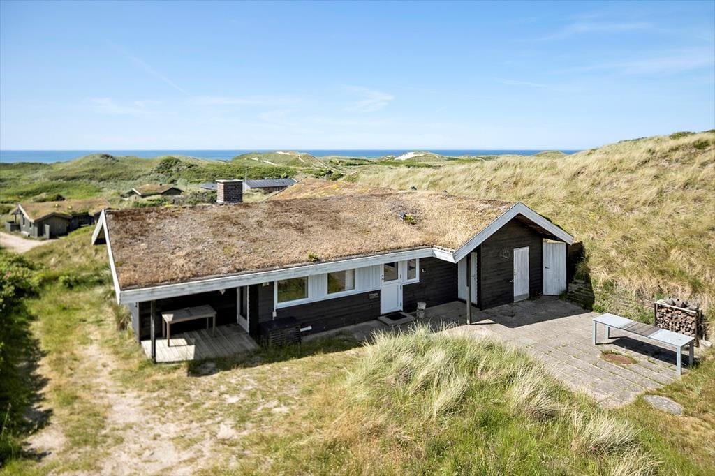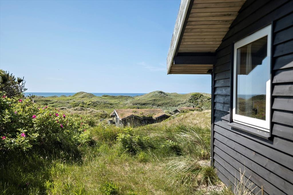 Dette ældre sommerhus entreres i husets delvis renoverede køkkenet. Herfra er der adgang til spisepladsen og stuen som byder på en enestående udsigt over de grøntklædte klitter og Vesterhavet. Her er brændeovn som hurtigt kan skabe varme og hygge når solnedgangen skal nydes gennem de store ruder som lukker lyset ind og giver en god stemning. Huset er velholdt og råder over fire værelser. Fra det ene værelse mod vest skal udsigten igen nævnes og her vågner man op med havudsigt over sine tåspidser. Her er et nyrenoverede badeværelse samt gæstetoilet og ekstra bruser som kan benyttes efter en dejlig tur i saunaen. Generelt et ældre men skønt og hyggeligt feriehus beliggende i fantastisk natur. OBS; Der må ikke medbringes katte i huset!
