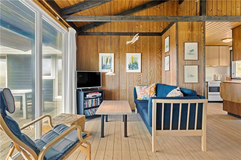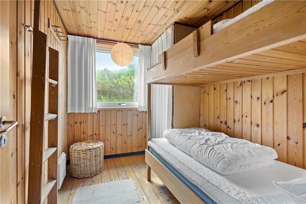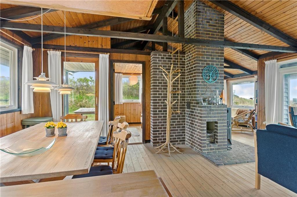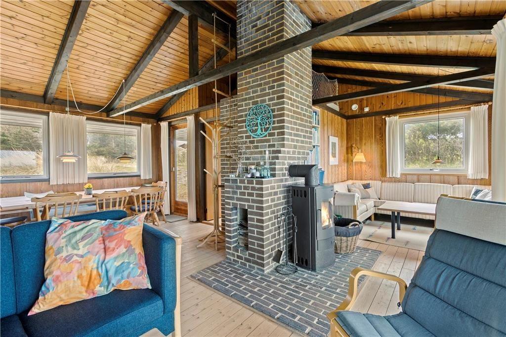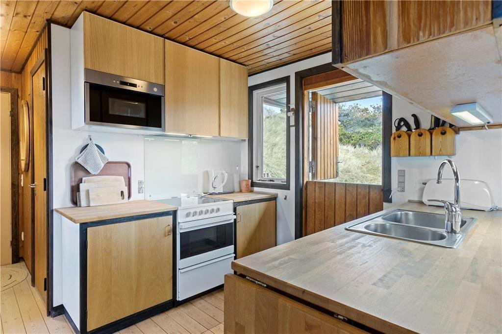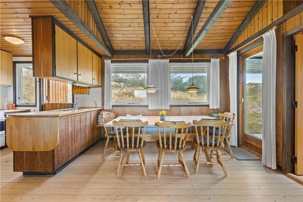 Dette ældre sommerhus entreres i husets delvis renoverede køkkenet. Herfra er der adgang til spisepladsen og stuen som byder på en enestående udsigt over de grøntklædte klitter og Vesterhavet. Her er brændeovn som hurtigt kan skabe varme og hygge når solnedgangen skal nydes gennem de store ruder som lukker lyset ind og giver en god stemning. Huset er velholdt og råder over fire værelser. Fra det ene værelse mod vest skal udsigten igen nævnes og her vågner man op med havudsigt over sine tåspidser. Her er et nyrenoverede badeværelse samt gæstetoilet og ekstra bruser som kan benyttes efter en dejlig tur i saunaen. Generelt et ældre men skønt og hyggeligt feriehus beliggende i fantastisk natur. OBS; Der må ikke medbringes katte i huset!