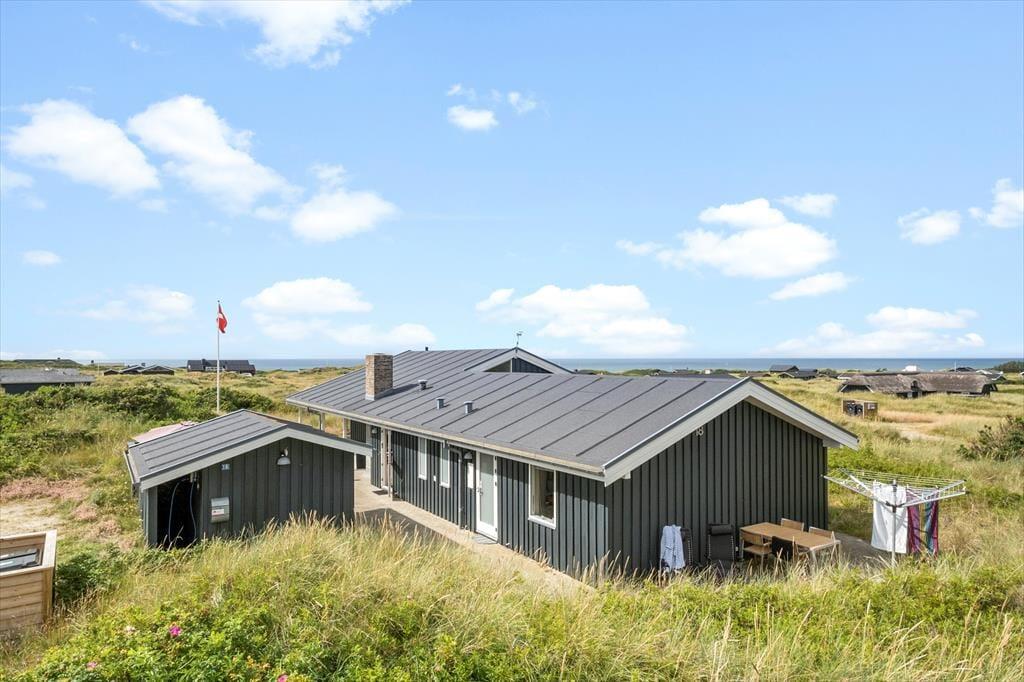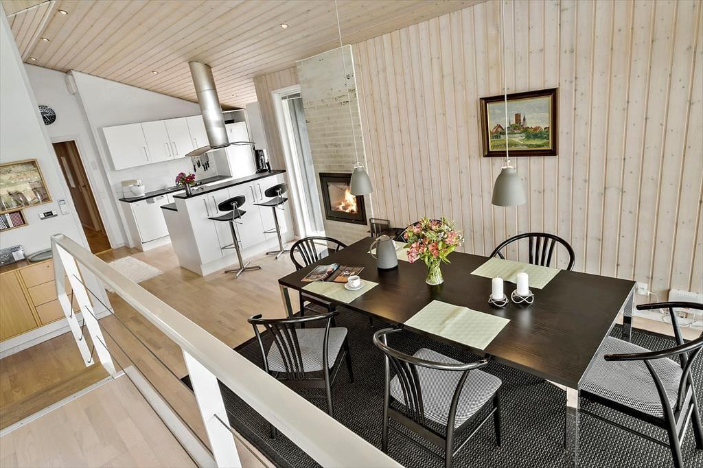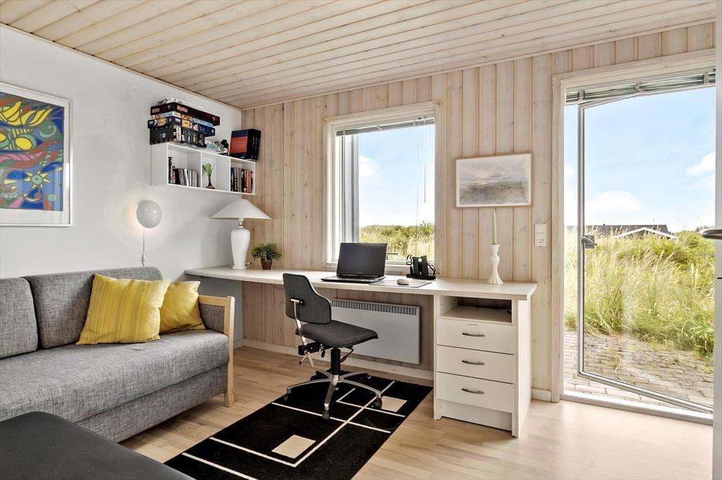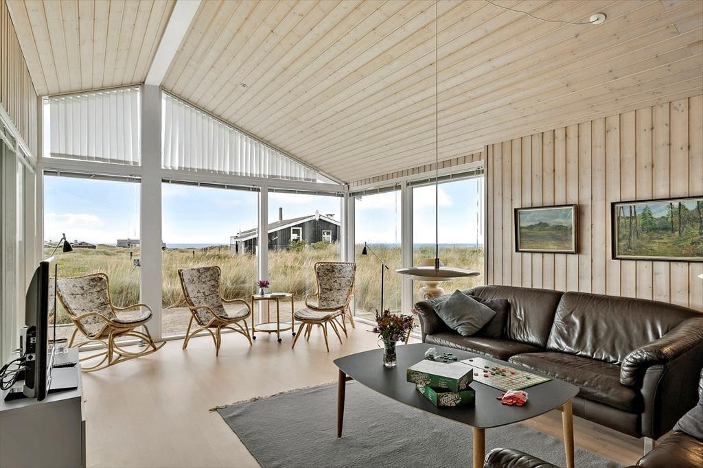 Det store, flotte træsommerhus er på hele 145 m2. Det fremstår nyt, lyst, velholdt og indbydende, og planløsningen er gennemtænkt, så otte personer kan se frem til en særdeles behagelig ferie. Sommerhuset tilbyder fire rummelige soveværelser og to badeværelser, der begge byder på gulvvarme og brusenicher. Sommerhusets samlingspunkt er en stor, niveau opdelt opholdsafdeling med stue og køkken-alrum i ét. Her er der loft til kip, brændeovn og lysindfald fra tre verdenshjørner, og især fra stuen, som ligger et par trin over køkken-alrummet, er havudsigten imponerende, og man har en oplevelse af at sidde midt ude i klitterne. Som ekstra bonus er der et velindrettet kontor, hvor man kan trække sig tilbage for at game eller arbejde, uden at genere de andre.