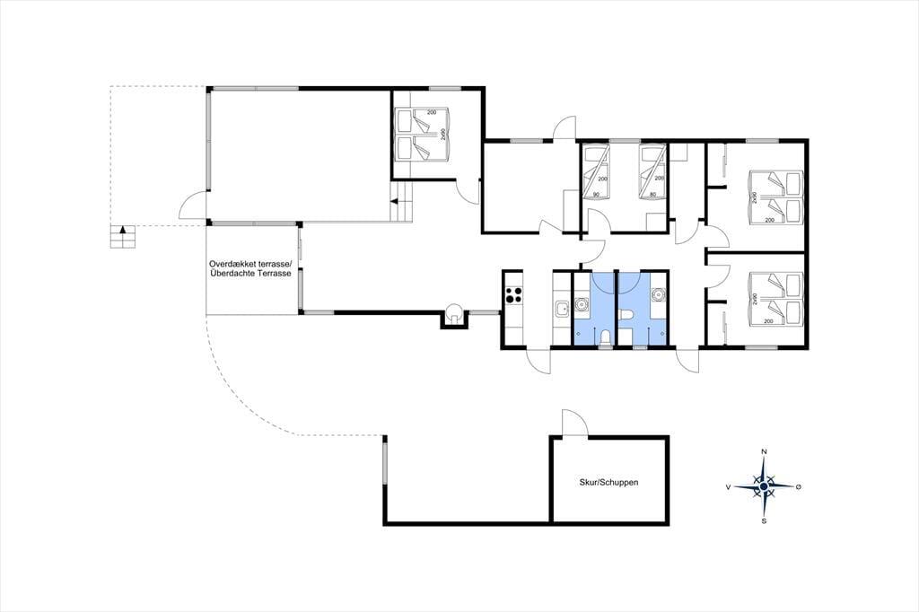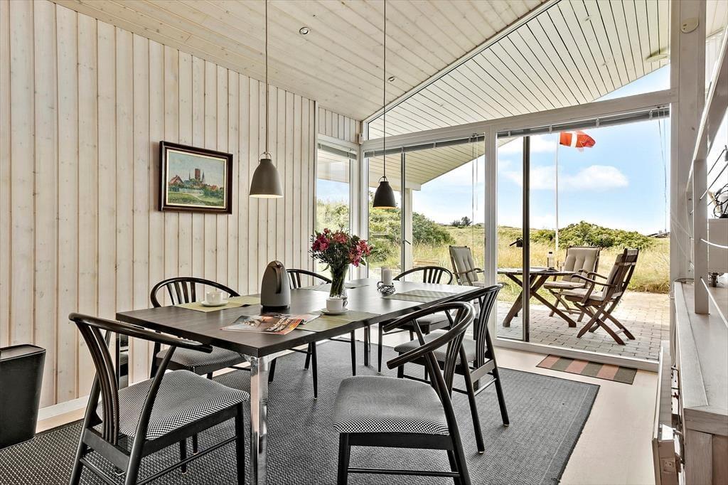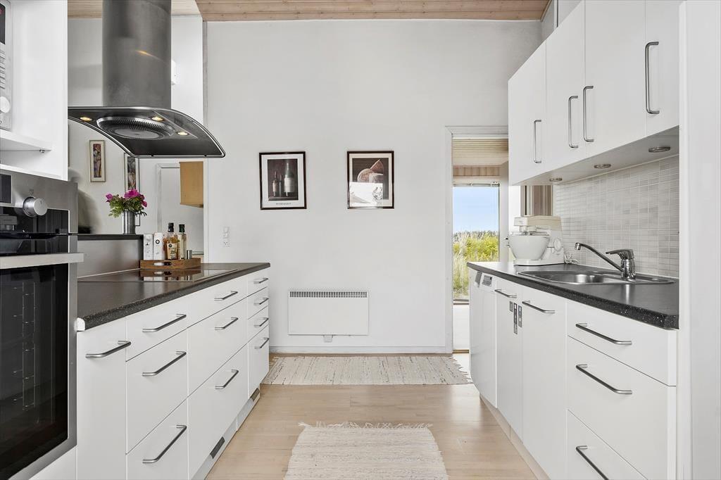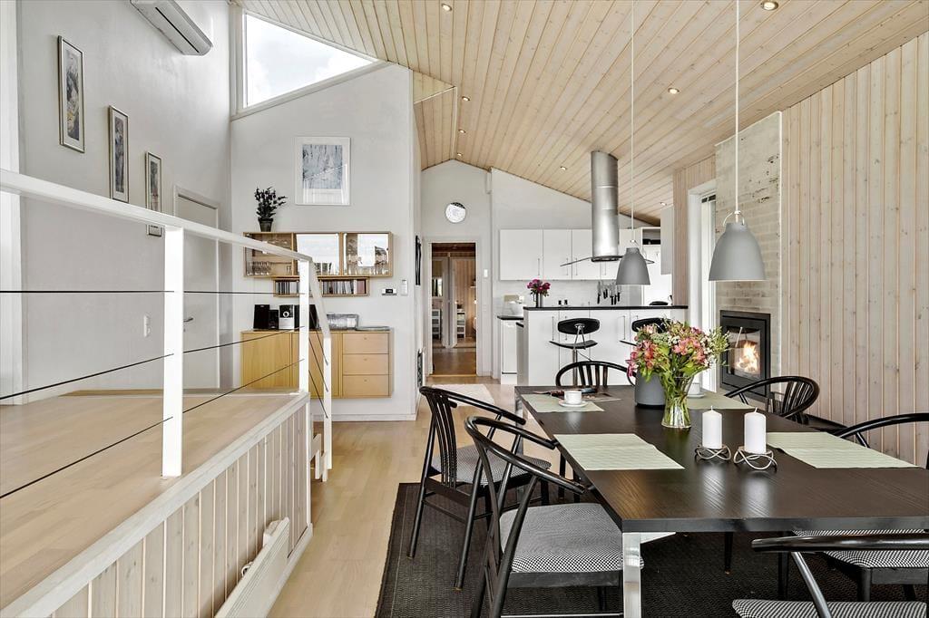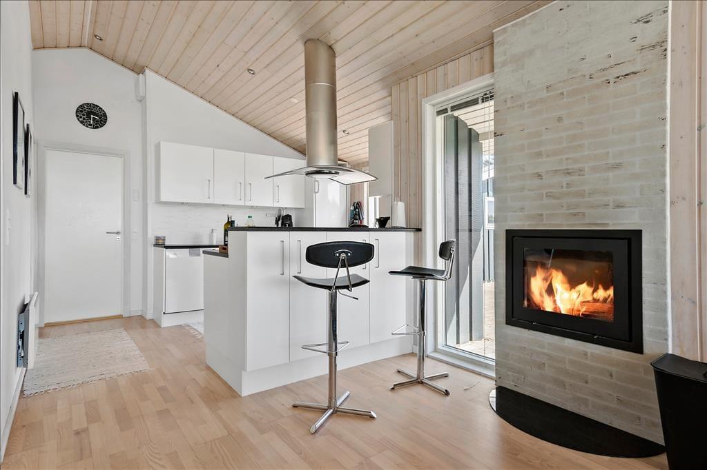 Det store, flotte træsommerhus er på hele 145 m2. Det fremstår nyt, lyst, velholdt og indbydende, og planløsningen er gennemtænkt, så otte personer kan se frem til en særdeles behagelig ferie. Sommerhuset tilbyder fire rummelige soveværelser og to badeværelser, der begge byder på gulvvarme og brusenicher. Sommerhusets samlingspunkt er en stor, niveau opdelt opholdsafdeling med stue og køkken-alrum i ét. Her er der loft til kip, brændeovn og lysindfald fra tre verdenshjørner, og især fra stuen, som ligger et par trin over køkken-alrummet, er havudsigten imponerende, og man har en oplevelse af at sidde midt ude i klitterne. Som ekstra bonus er der et velindrettet kontor, hvor man kan trække sig tilbage for at game eller arbejde, uden at genere de andre.