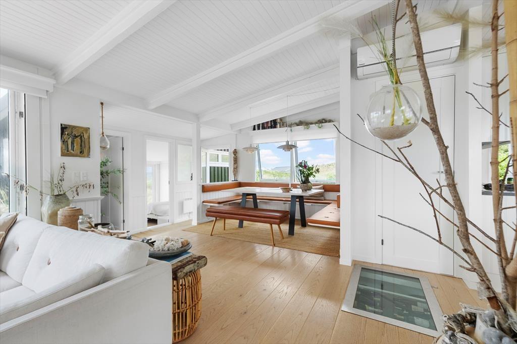 Kettrup Bjerge er kendt for sit særprægede klitlandskab og sin nærhed til Vesterhavet, og det mærkes tydeligt, når du bor i sommerhus her. Naturen er lige uden for døren, og en kort gåtur fører dig gennem det bølgende terræn og ned til den brede, hvide sandstrand. Her kan du soppe i det friske hav, gå langs vandkanten eller blot lade blikket hvile i horisonten. Området byder på masser af muligheder for vandreture, og udsigten fra de højere liggende stier i Kettrup Bjerge er i sig selv hele turen værd. Løkken ligger blot en kort køretur væk, og her kan du nyde en dag med shopping, caféliv og et levende udvalg af restauranter og gallerier. Du kan også tage familien med til Rubjerg Knude Fyr eller til en dag fyldt med grin og leg i Fårup Sommerland. Uanset om du søger naturens stilhed eller ferielivets glæder, er dette sommerhus i Kettrup Bjerge det perfekte udgangspunkt.