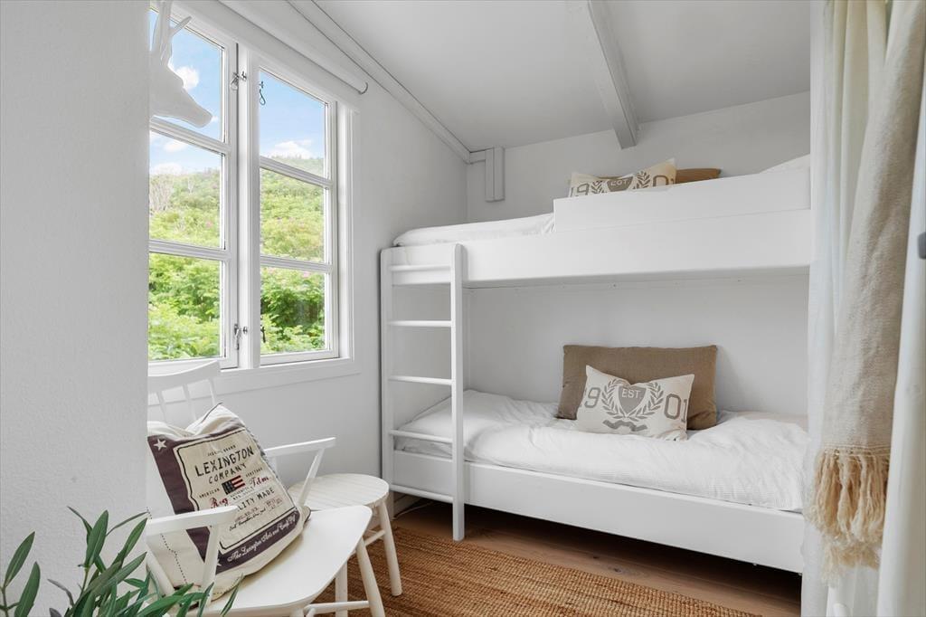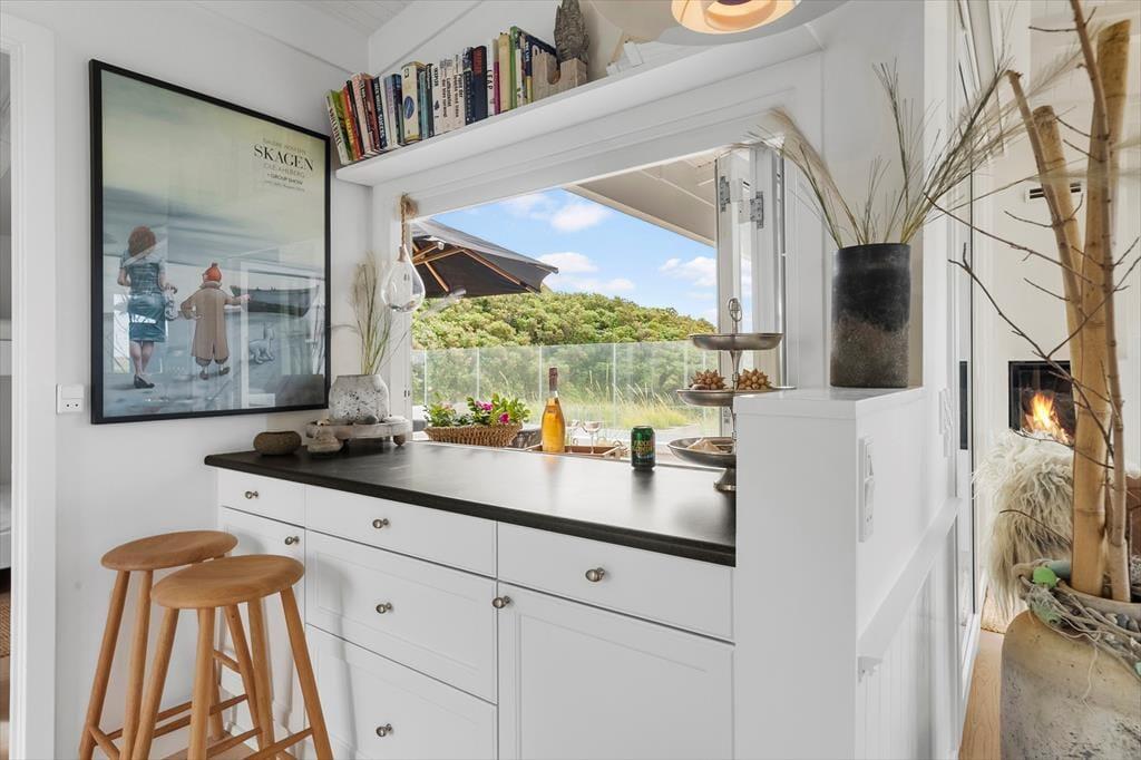 Sommerhuset byder på en indretning, der emmer af personlighed og varme. Her er det let at føle sig hjemme, uanset om det er første gang, du træder ind ad døren. Det åbne køkkenalrum skaber en naturlig ramme om det gode ferieliv, hvor madlavning og hyggesnak kan gå hånd i hånd. Store vinduespartier inviterer dagslyset indenfor og giver frit udsyn til de skiftende nuancer på himlen over havet. I stuen står pejsen klar til at sprede varme og stemning, når dagens udflugter er forbi og benene skal hviles i sofaen. Planløsningen rummer tre gode soveværelser og to badeværelser med bad og toilet, så her er god plads og komfort til både børnefamilier og flere par, der rejser sammen. Indretningen er lys og venlig med sans for detaljerne – og stemningen i huset er lige så rolig og afslappet som de naturskønne omgivelser udenfor.