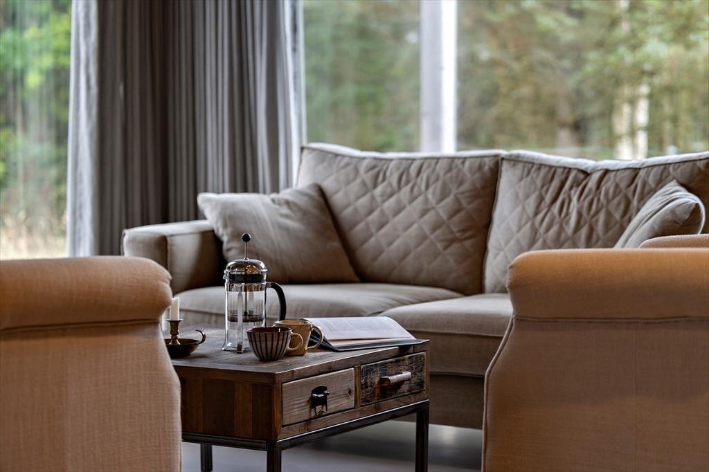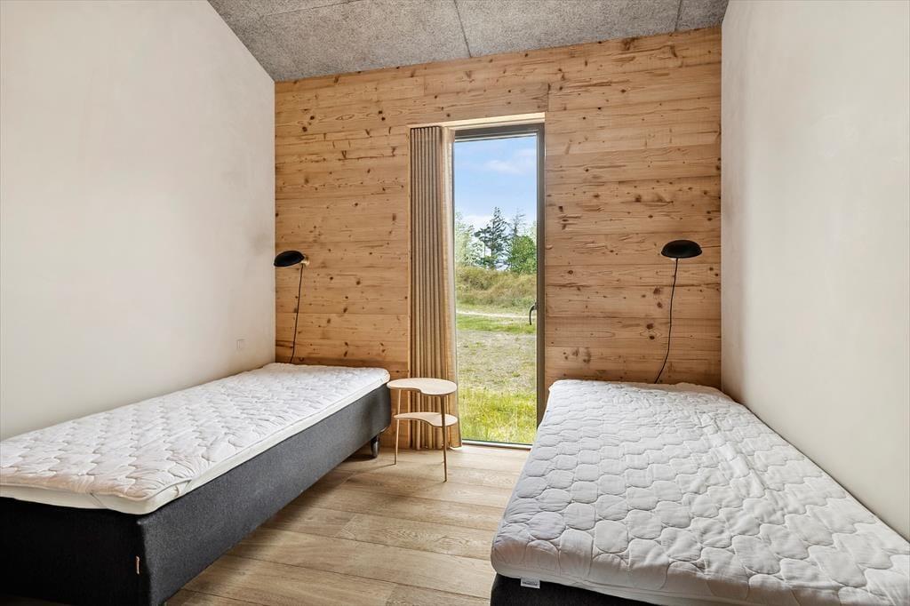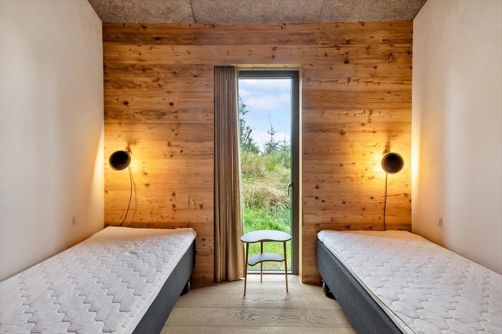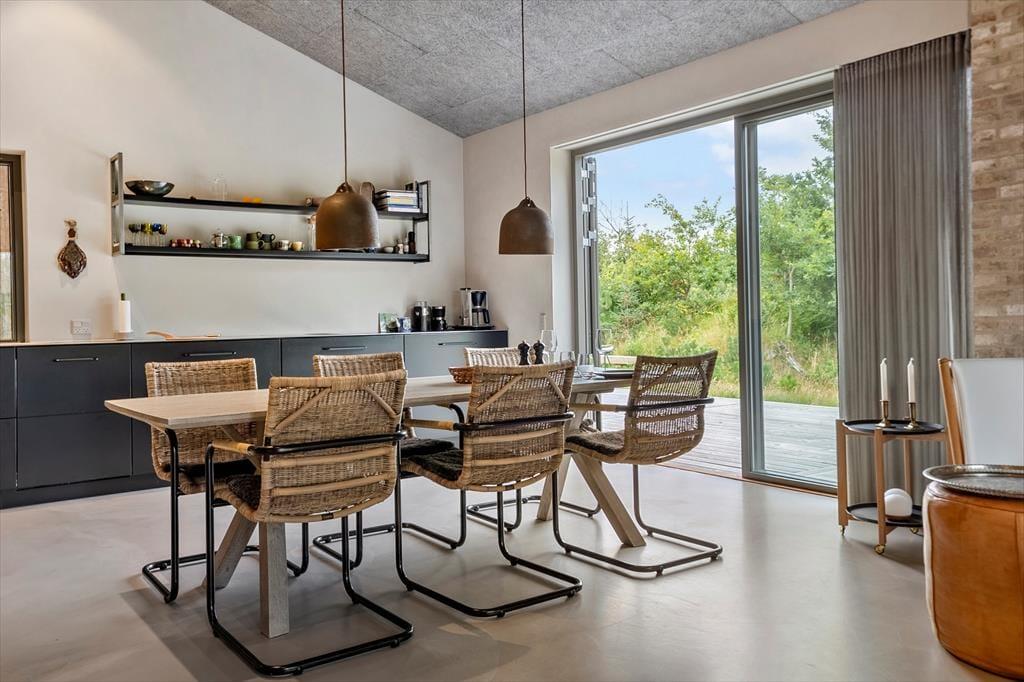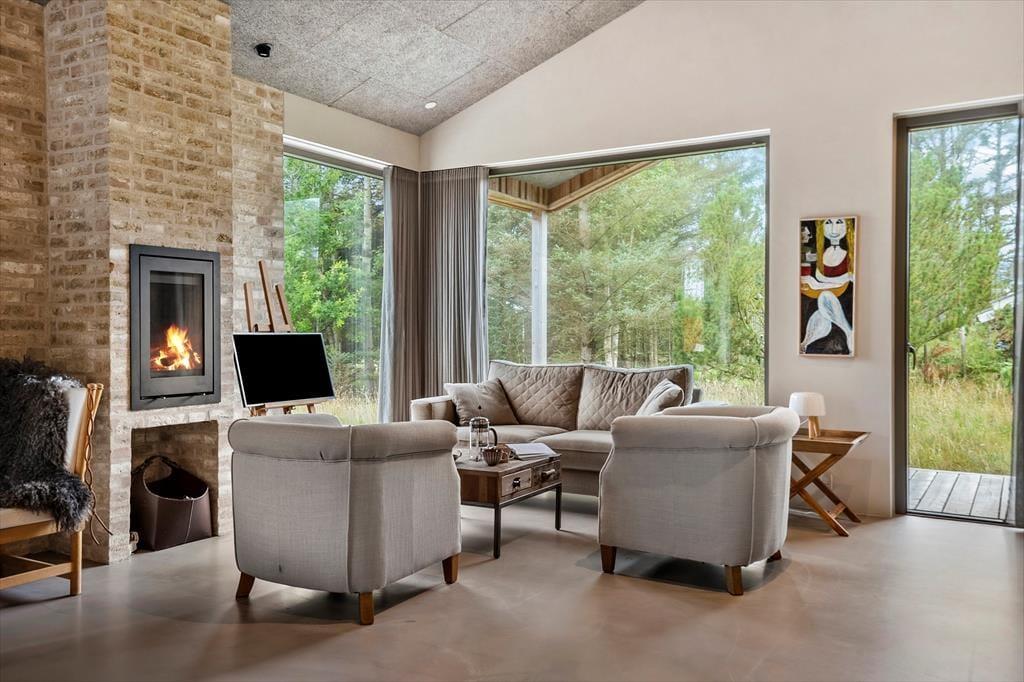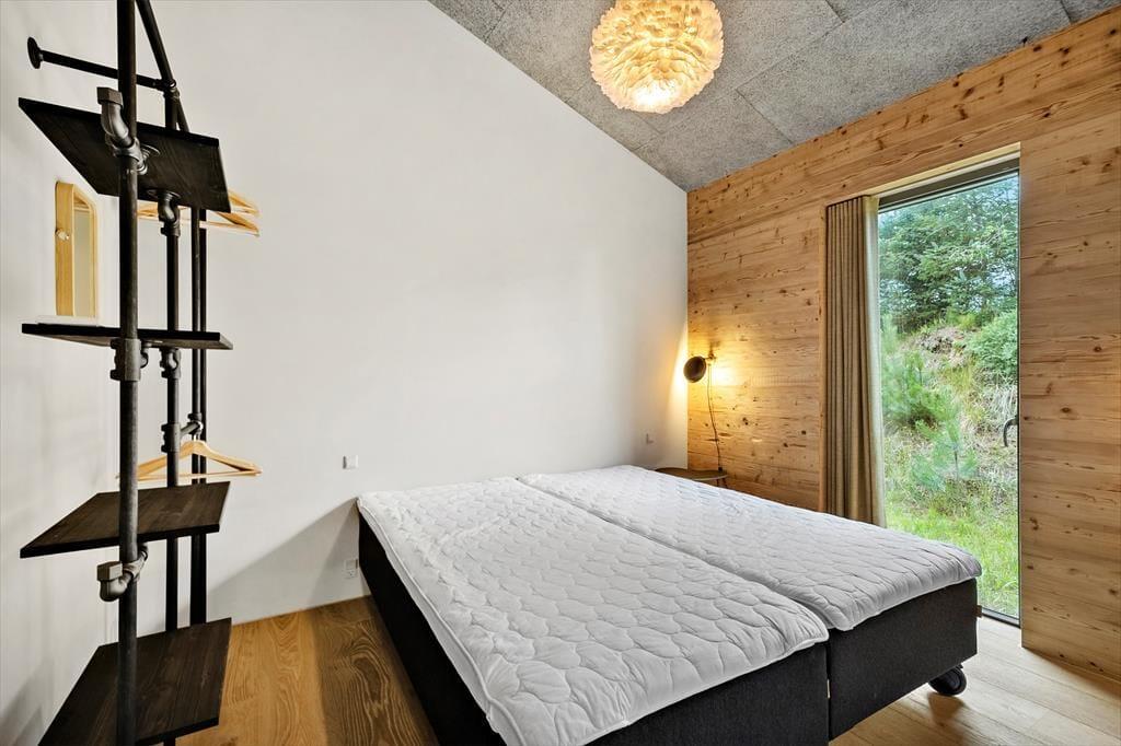 Indenfor mødes du af en lys og venlig atmosfære, hvor de store vinduespartier inviterer naturen indenfor og skaber en dejlig åben fornemmelse. Opholdsrummet er husets naturlige samlingspunkt, hvor køkken, spiseplads og stue flyder sammen i ét, så du kan lave mad og stadig være en del af samtalen. Her kan I nyde lange måltider, brætspil eller en god bog i de bløde møbler, mens dagens lys glider ind gennem ruderne. På de køligere dage kan du lune dig med en kop kaffe, mens du betragter dyrelivet udenfor – måske får du øje på et rådyr, der stille bevæger sig mellem træerne. Sommerhuset har også praktiske faciliteter som vaskemaskine og tørretumbler, så ferien kan holdes ubekymret.