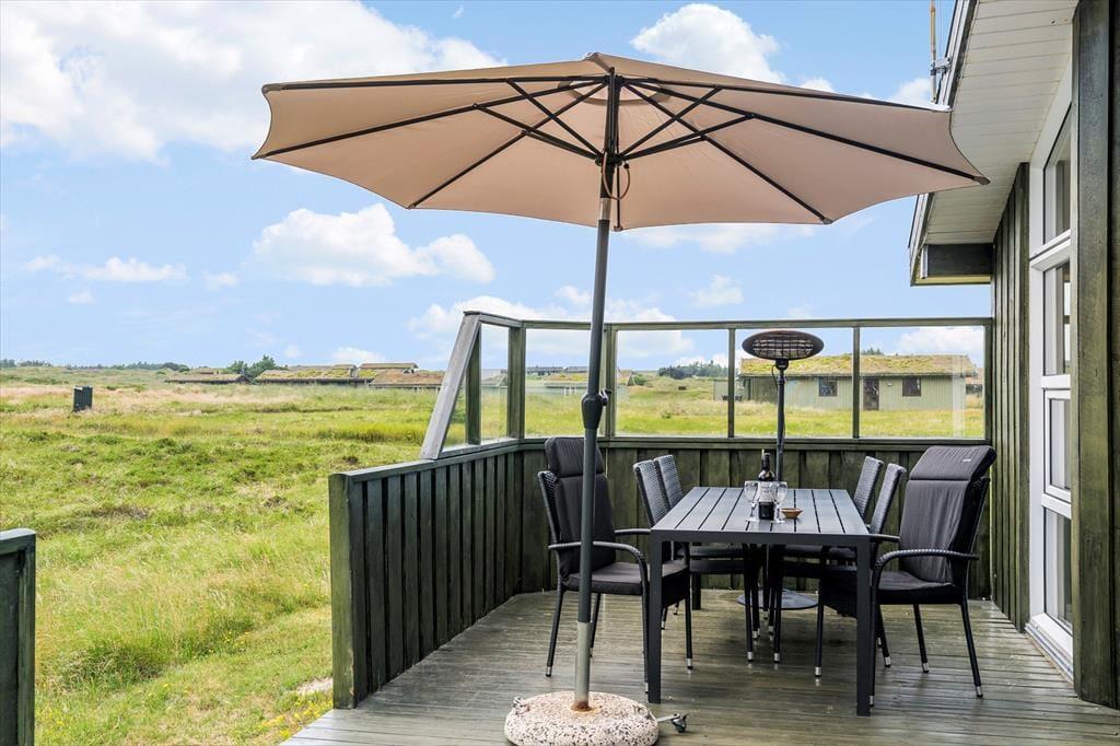 Sommerhuset er omgivet af et skønt terrasseareal. Mod syd ligger en delvis overdækket terrasse, som fortsætter på den ene side af sommerhuset hen mod indgangen. Det flotte lyngklædte landskab omkranser terrassen, hvilket giver mulighed for at kunne se dyrelivet helt tæt på.