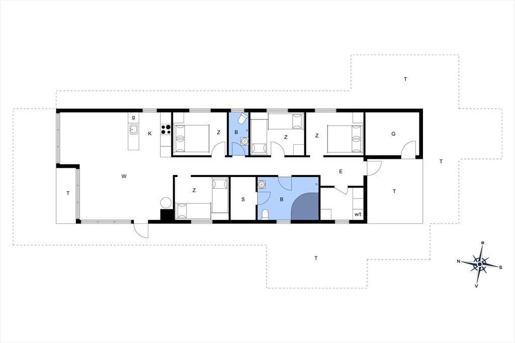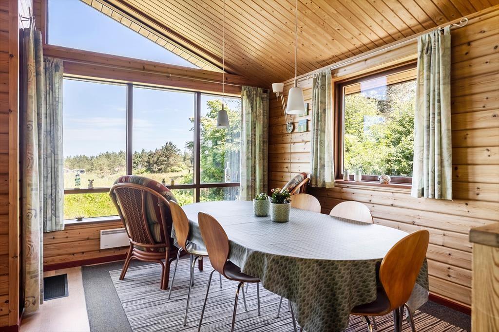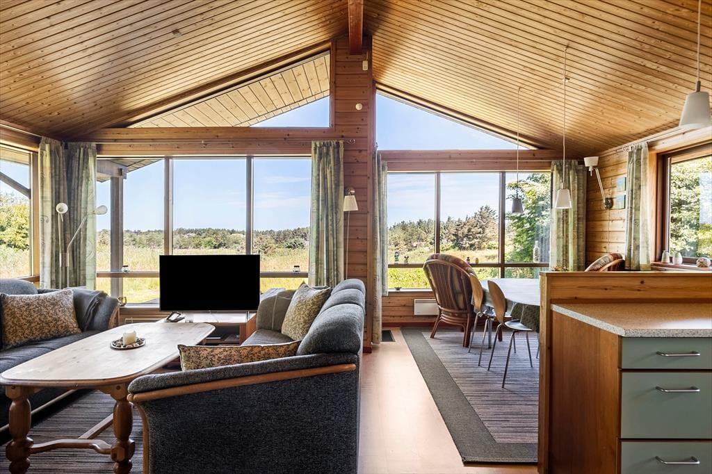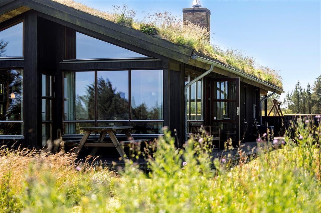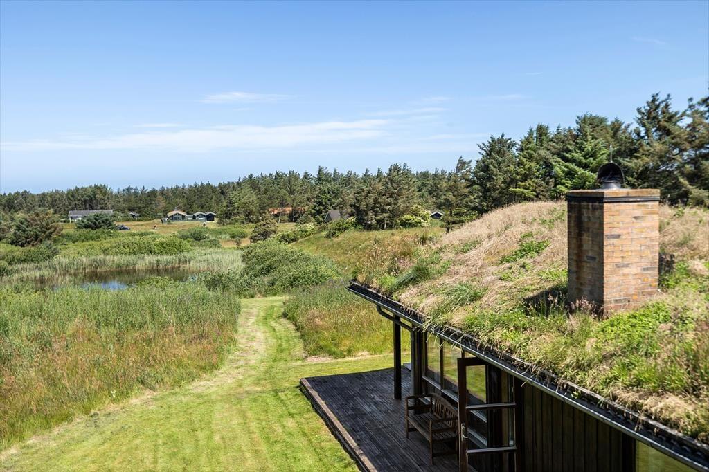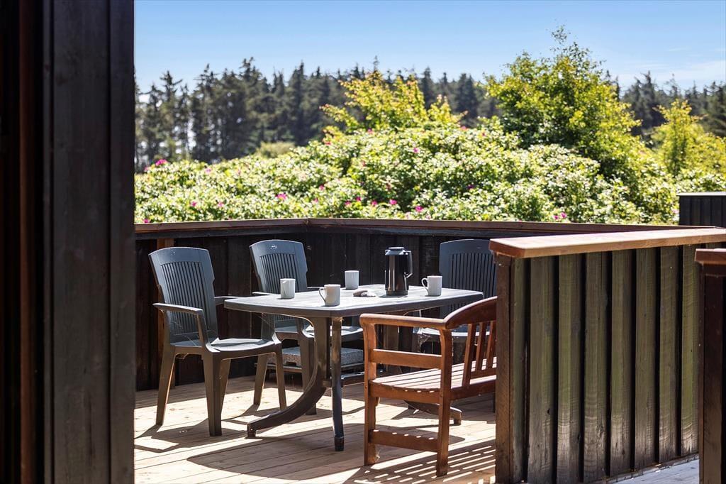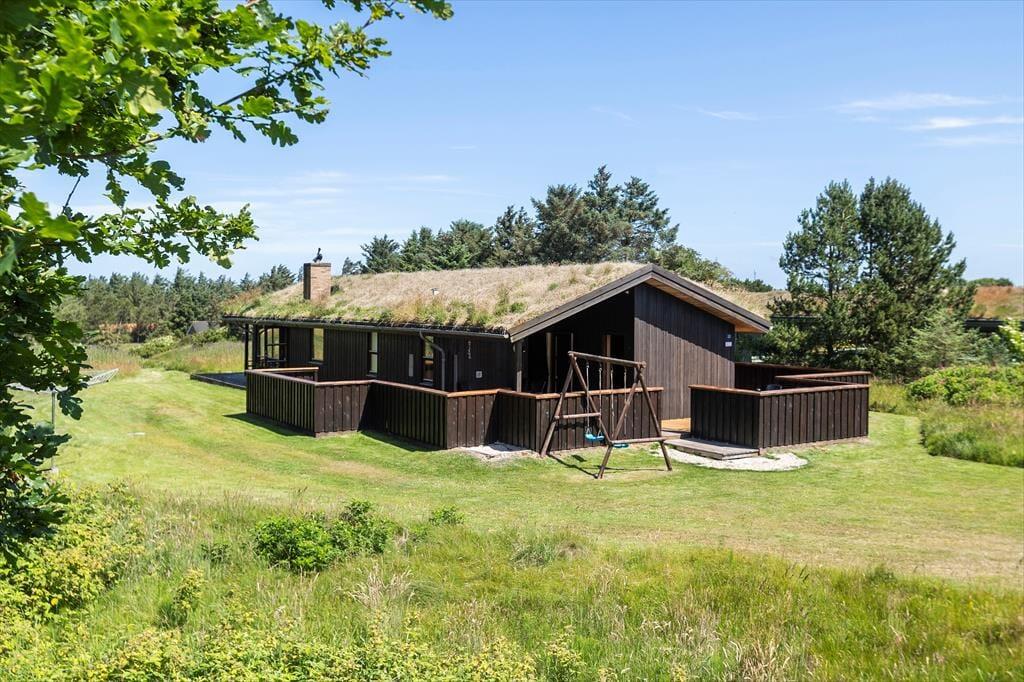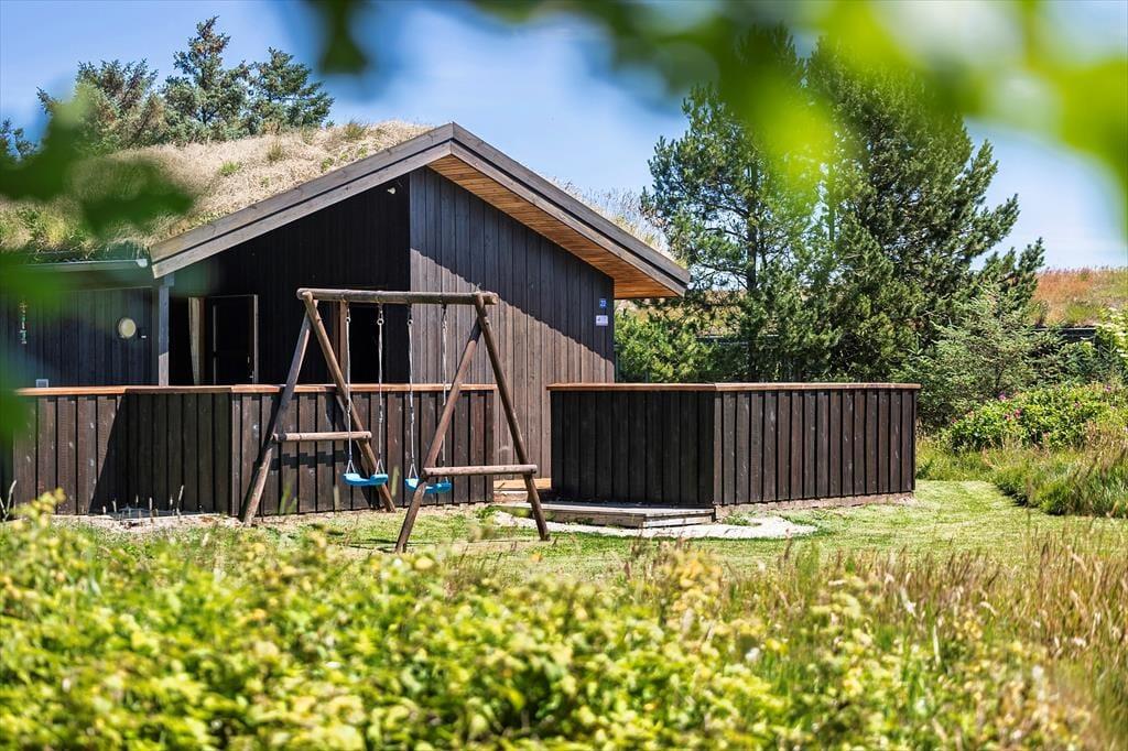 Sommerhuset ligger helt perfekt med hede, klit og åbne vidder lige uden for døren. Fra spisestuen er der adgang til terrassen, som løber rundt om den store glasgavl ved stuen. Her er en del af terrassen overdækket, og her kan man med fordel sidde om aftenen, når temperaturen falder. Til børnene er her sandkasse og gynge ligesom grill, liggestole og parasol er til rådighed for husets gæster.