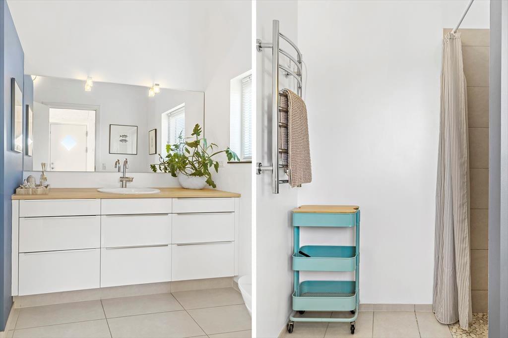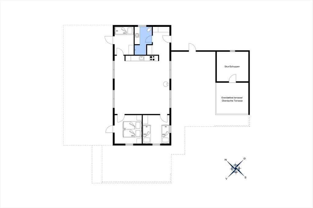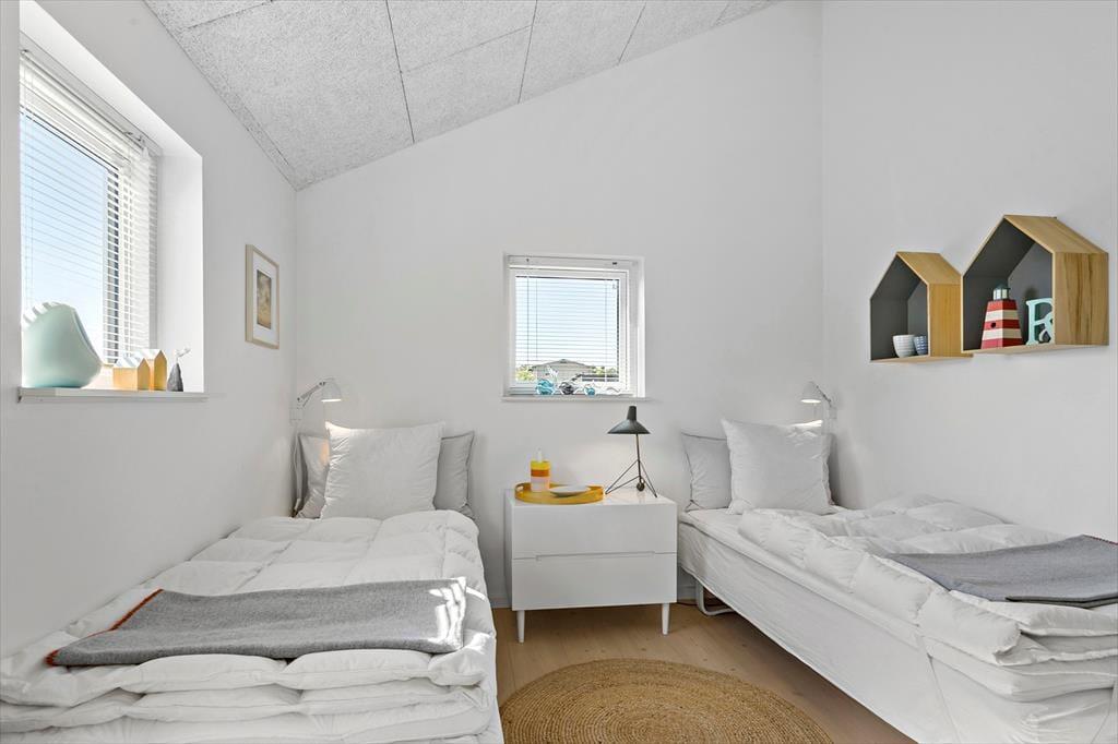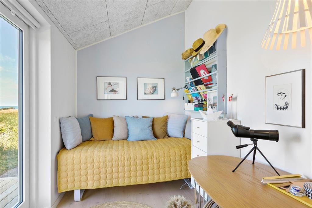 Dette super skønne sommerhus med panoramaudsigt danner den perfekte ramme om den næste ferie i Nordjylland. Fra indgangspartiet har man adgang til husets flotte badeværelse og til opholdsrummet. Opholdsrummet er husets kerne og indeholder det åbne køkken, spiseafdeling og stuen med brændeovn. De store vinduespartier giver en fantastisk panoramaudsigt over havet og klitterne, og hele rummet giver en enestående rumfornemmelse, da der er loft til kip. Man kan fra alle steder i opholdsrummet og i de to soveværelser mod vest nyde udsigten. Sommerhuset indeholder et badeværelse med en stor bruseniche og tre soveværelser; et med to enkeltsenge, et med dobbeltseng og det sidste værelse indeholder en enkeltseng og et skrivebord. Her kan man sidde lidt for sig selv og gøre brug af husets internet, hvis man medbringer pc eller tablet.